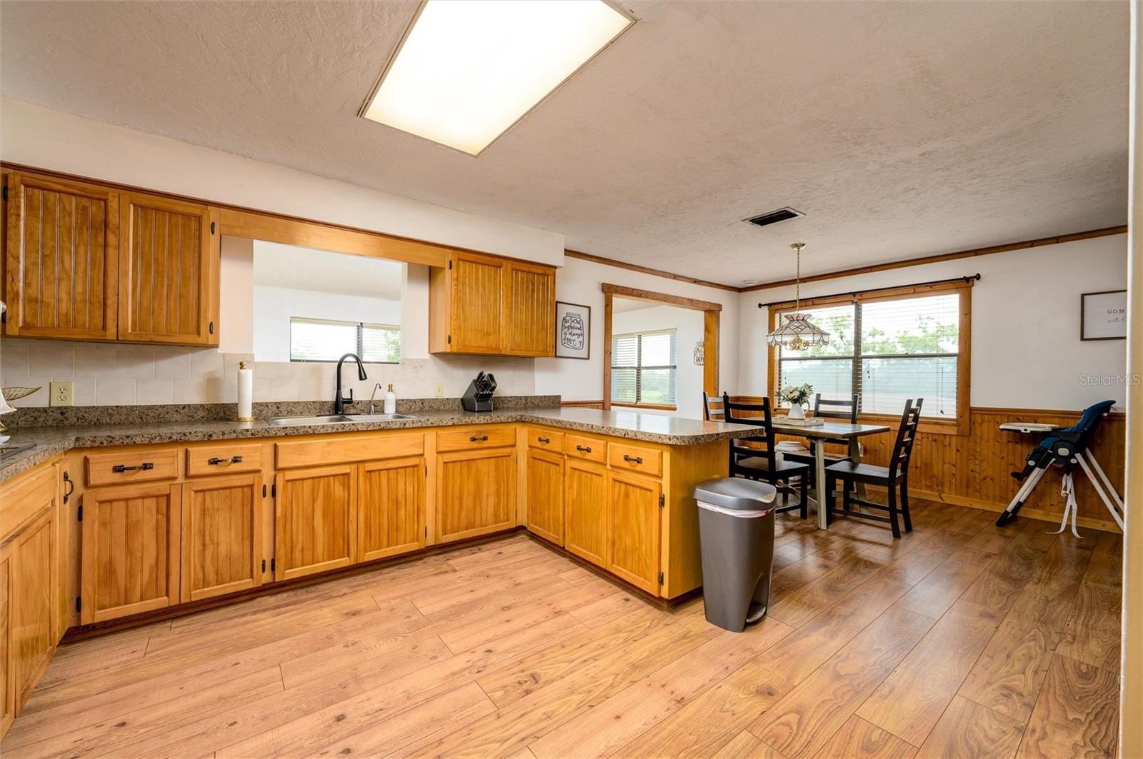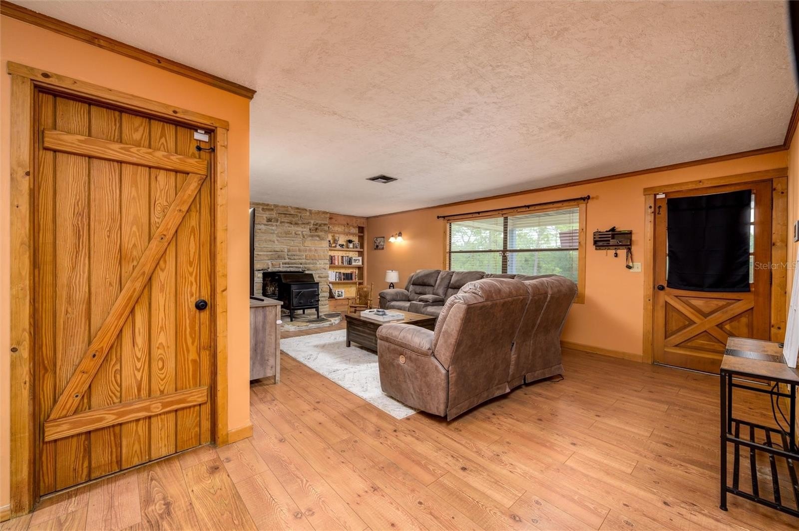 Crafted with character, the interior features solid pine doors and cabinetry, a spacious kitchen, formal living and dining rooms, and a generous family room, all enhanced by warm wood and luxury vinyl plank flooring. The expansive primary suite offers ample closet space and peaceful views of the surrounding landscape.