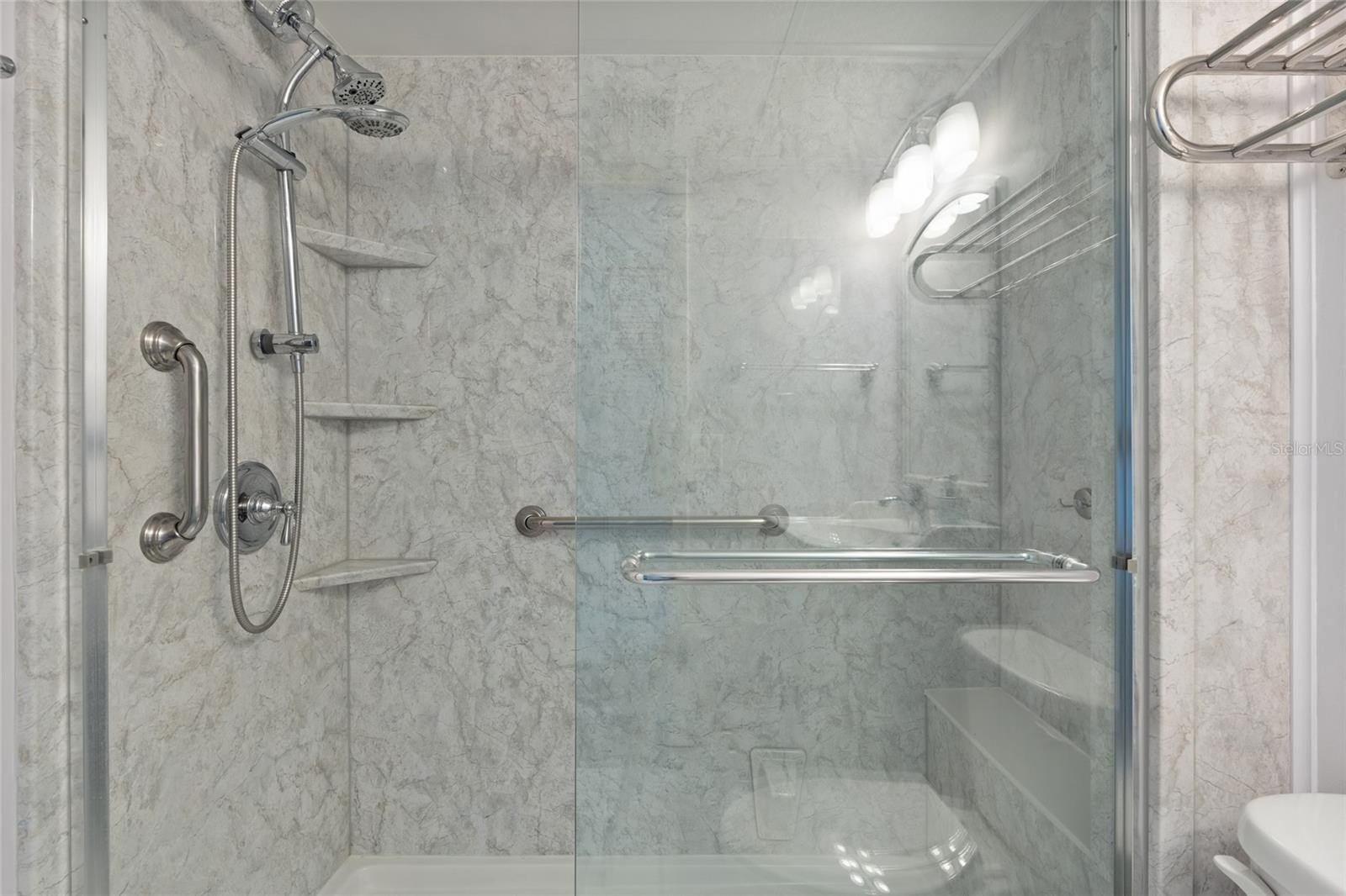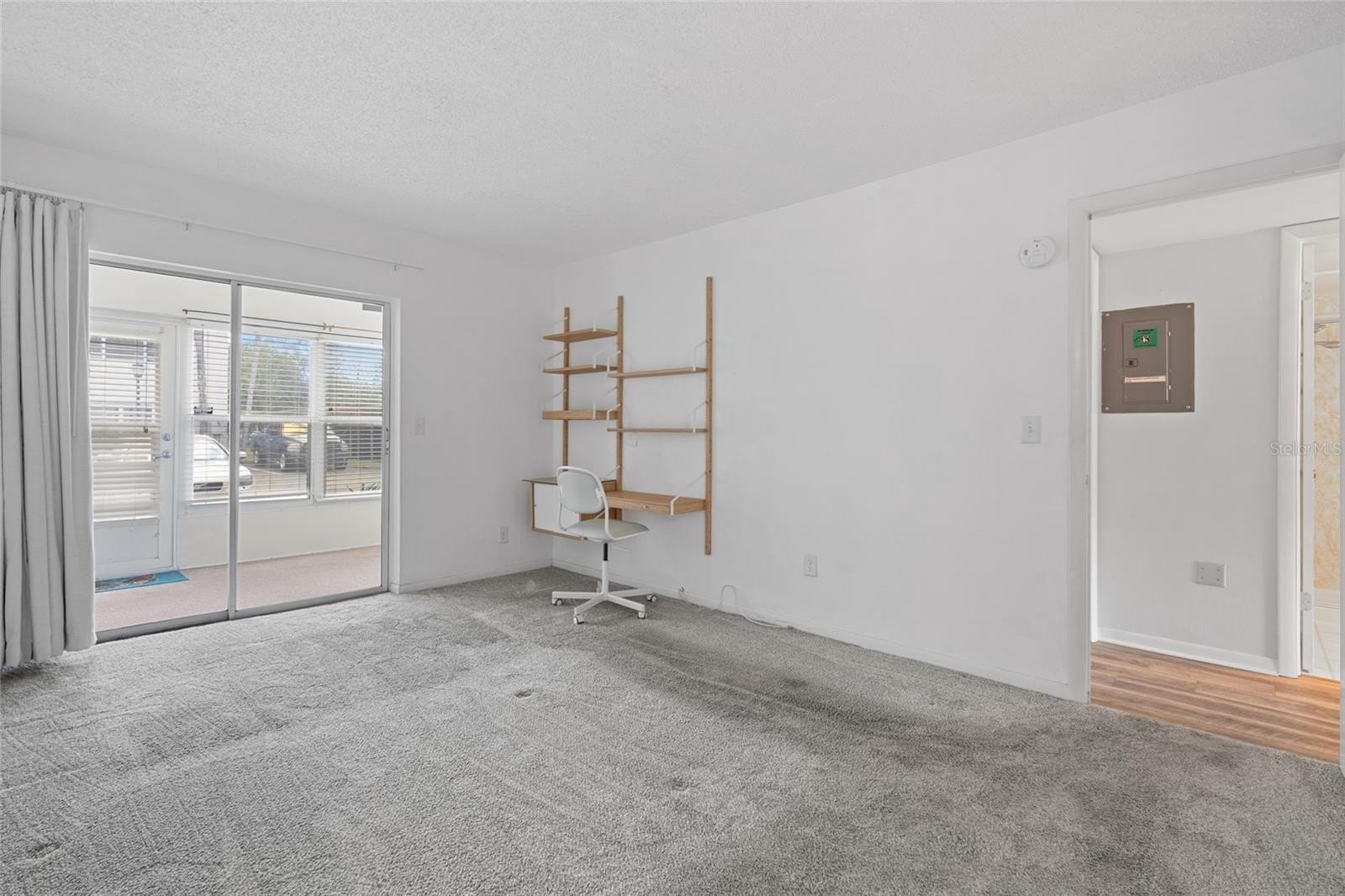 The primary suite has plenty of room that could easily fit a king sized bed, as well as a walk in closet and sliding doors that lead you to the Florida sun-room off the back.