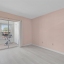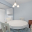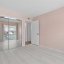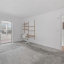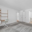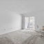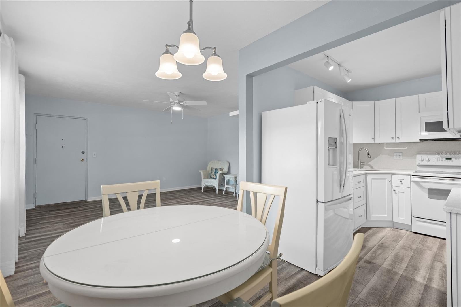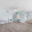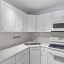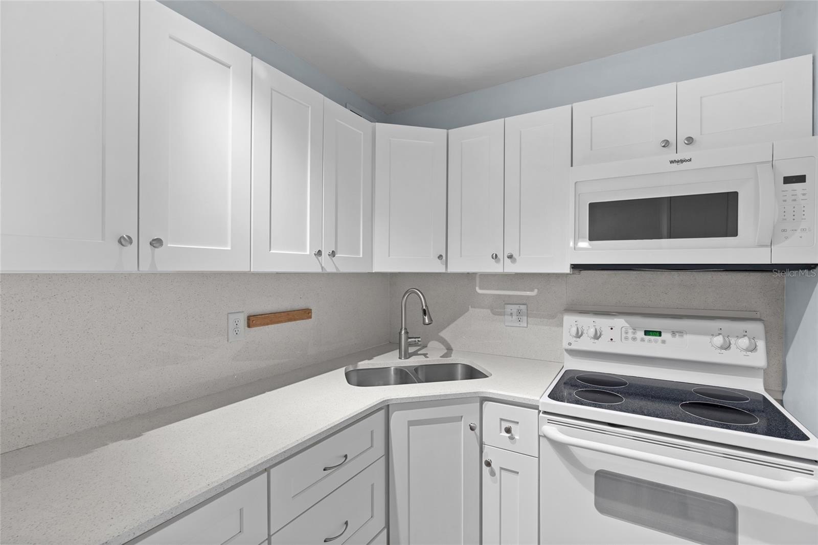 The kitchen has been tastefully renovated with brand-new white cabinetry, quartz countertops, and new appliances including a microwave and refrigerator. The open layout flows seamlessly into the living area, creating a bright and inviting space.