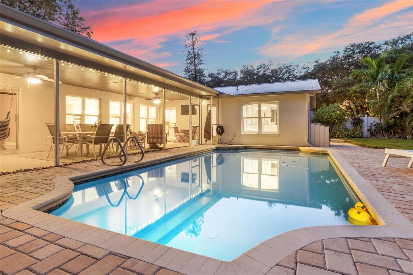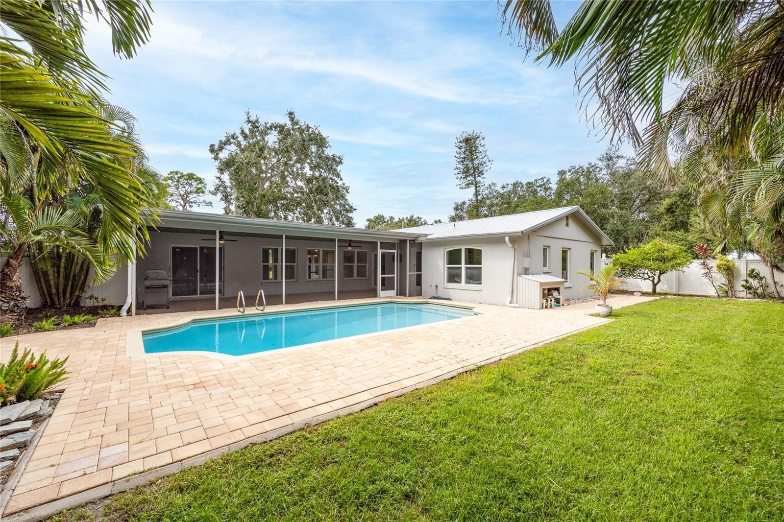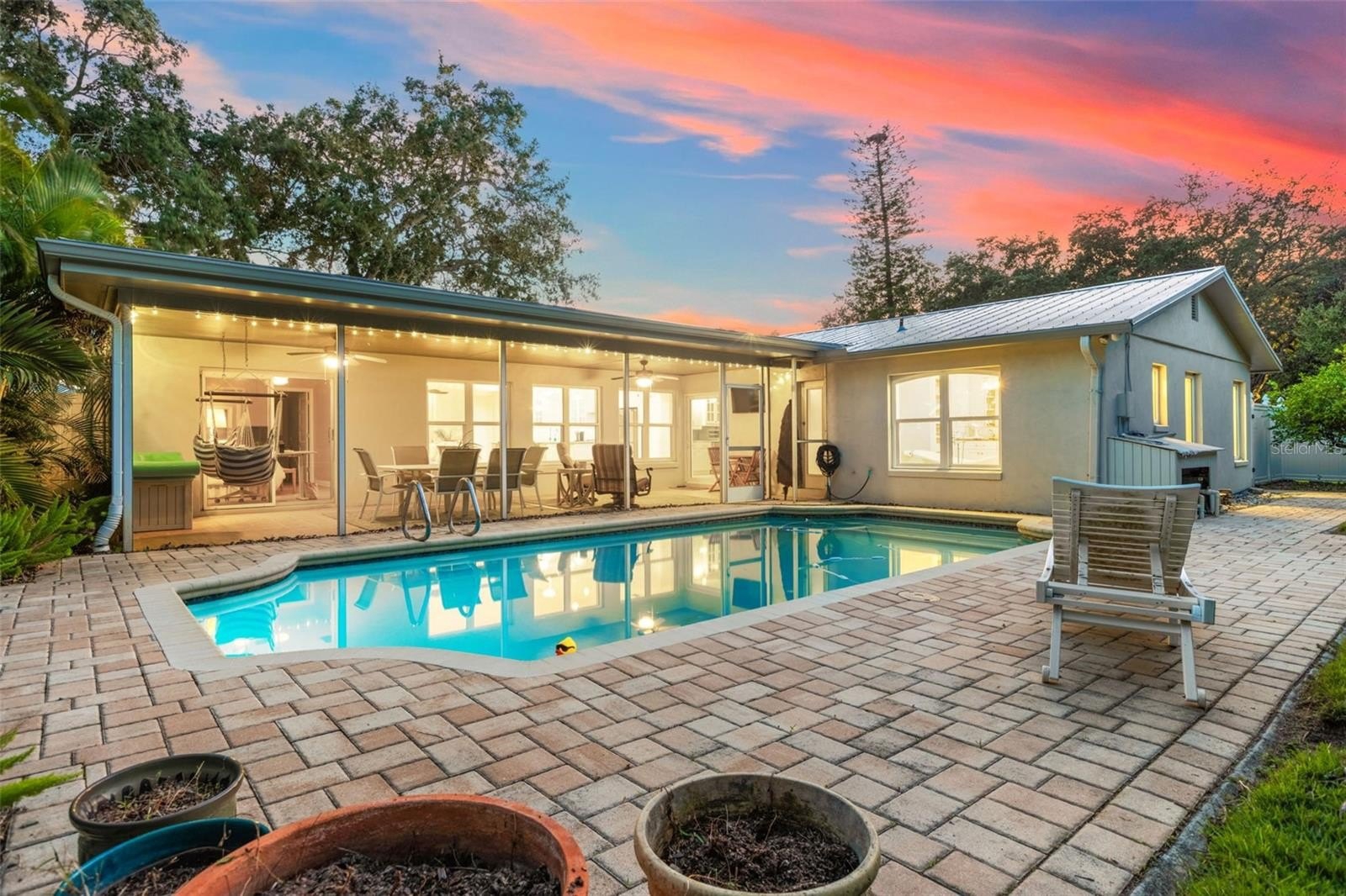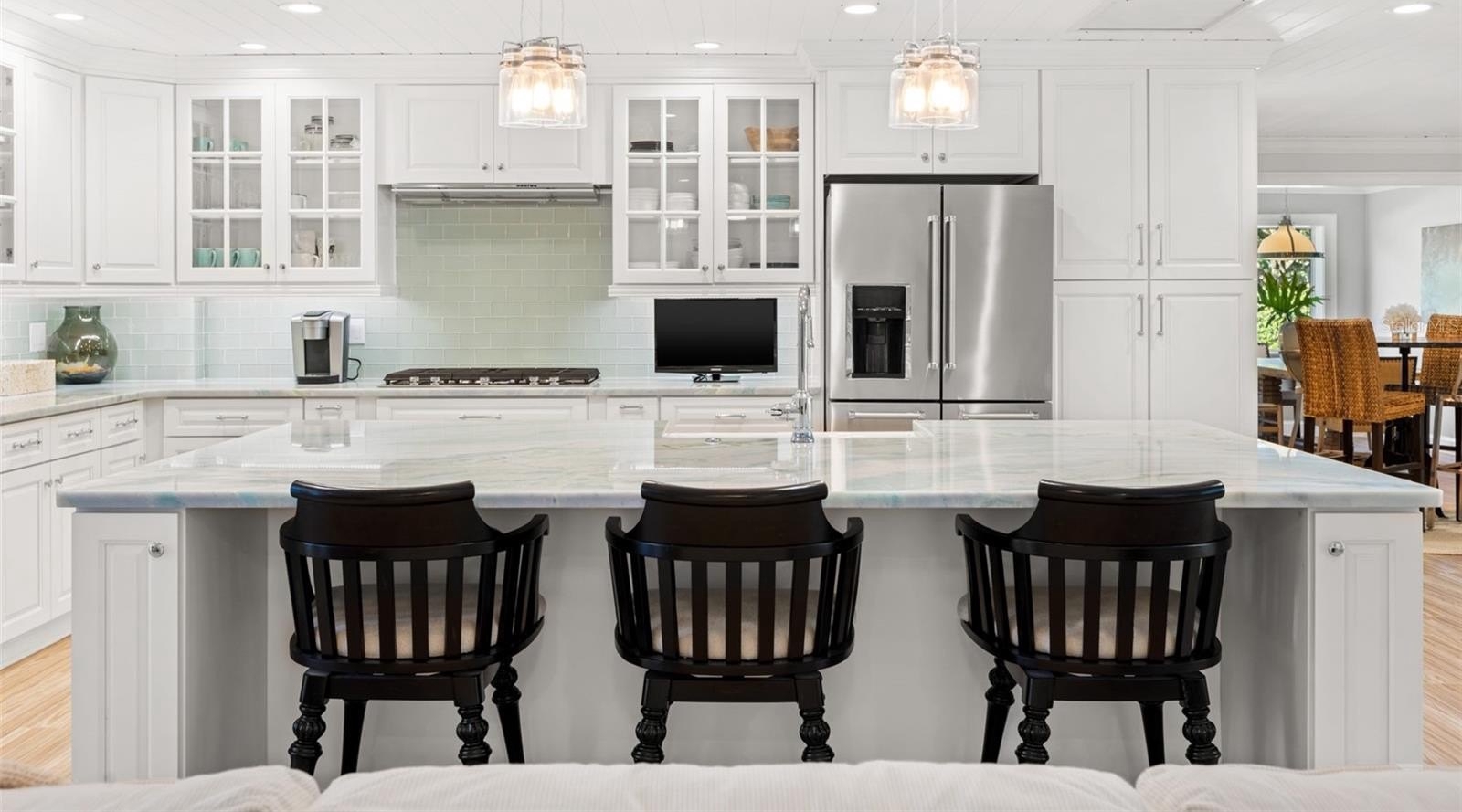 Enjoy glimpses of Boca Ciega Bay from the dining area and the primary suite and prepare for sunsets that will take your breath away. Arrive through the garage to a charming laundry/mudroom with a custom farmhouse sink. Outdoors, Florida living shines: a large screened porch (accessed by a sliding pocket door) overlooks the sparkling pool and fully fenced, private backyard, complete with a Meyer lemon tree.