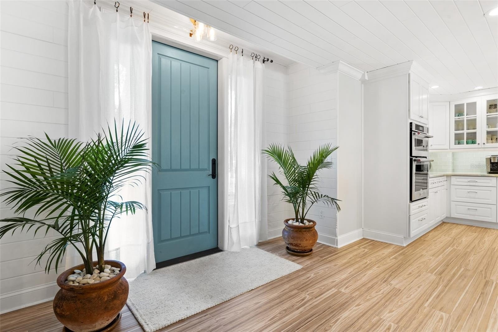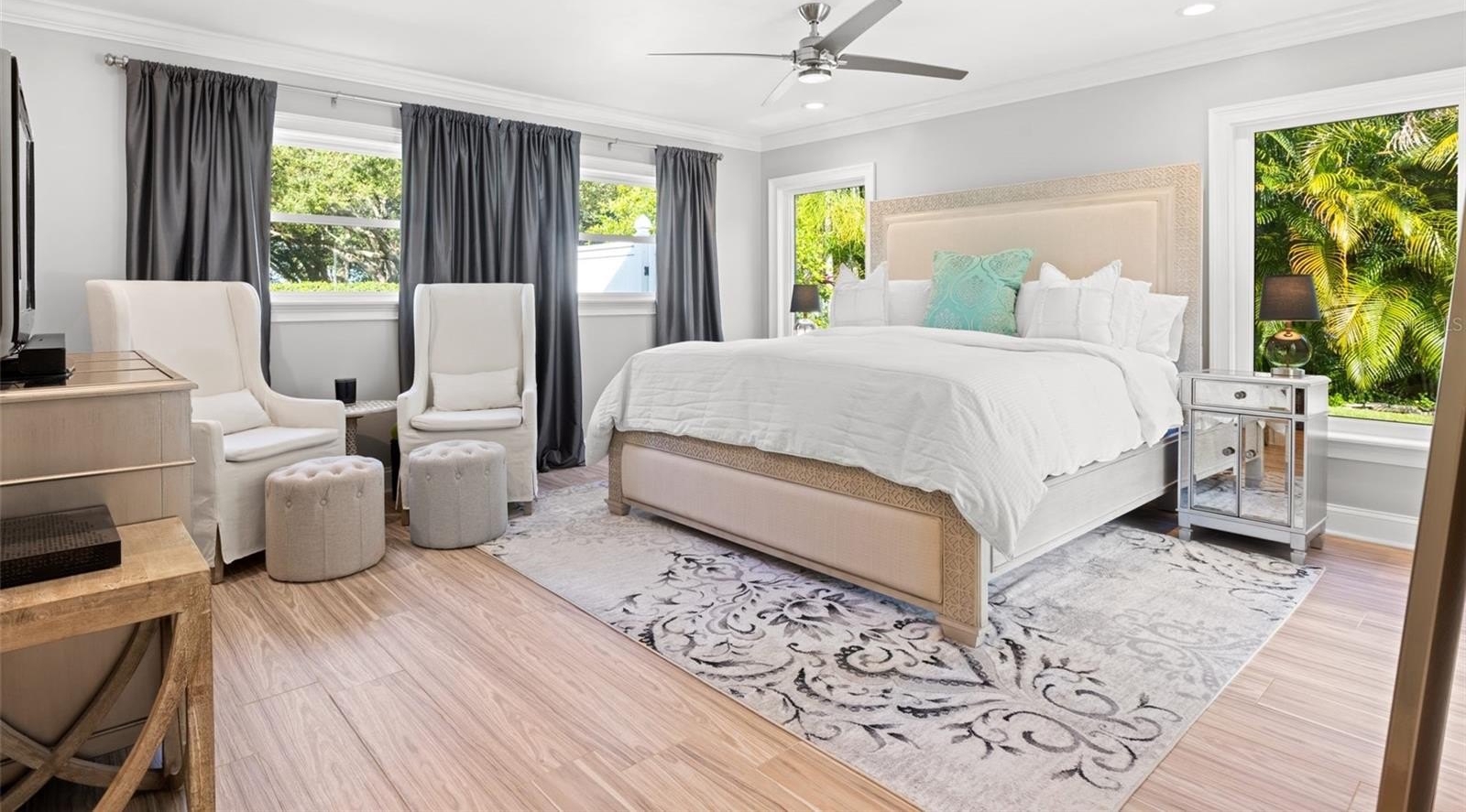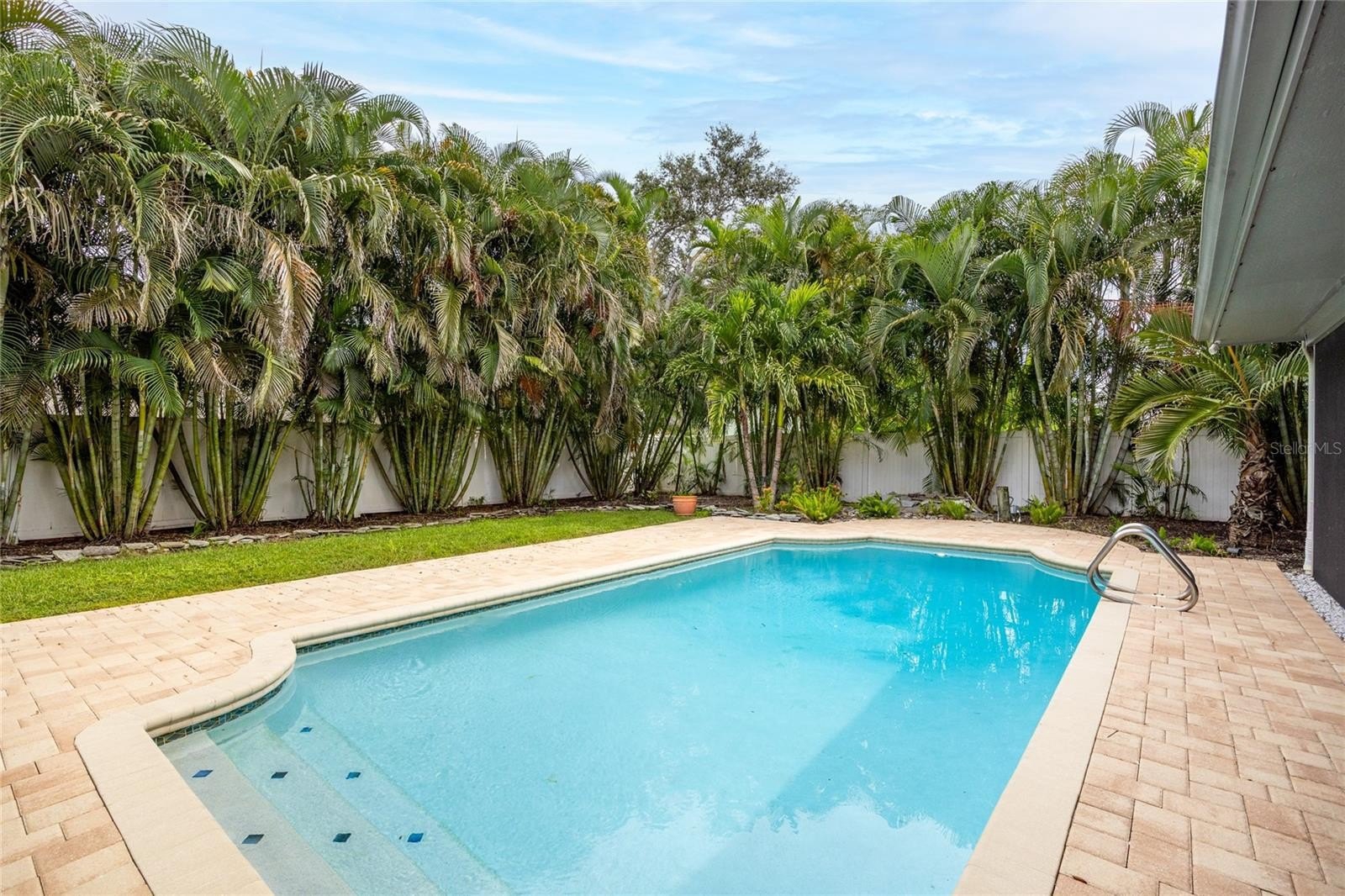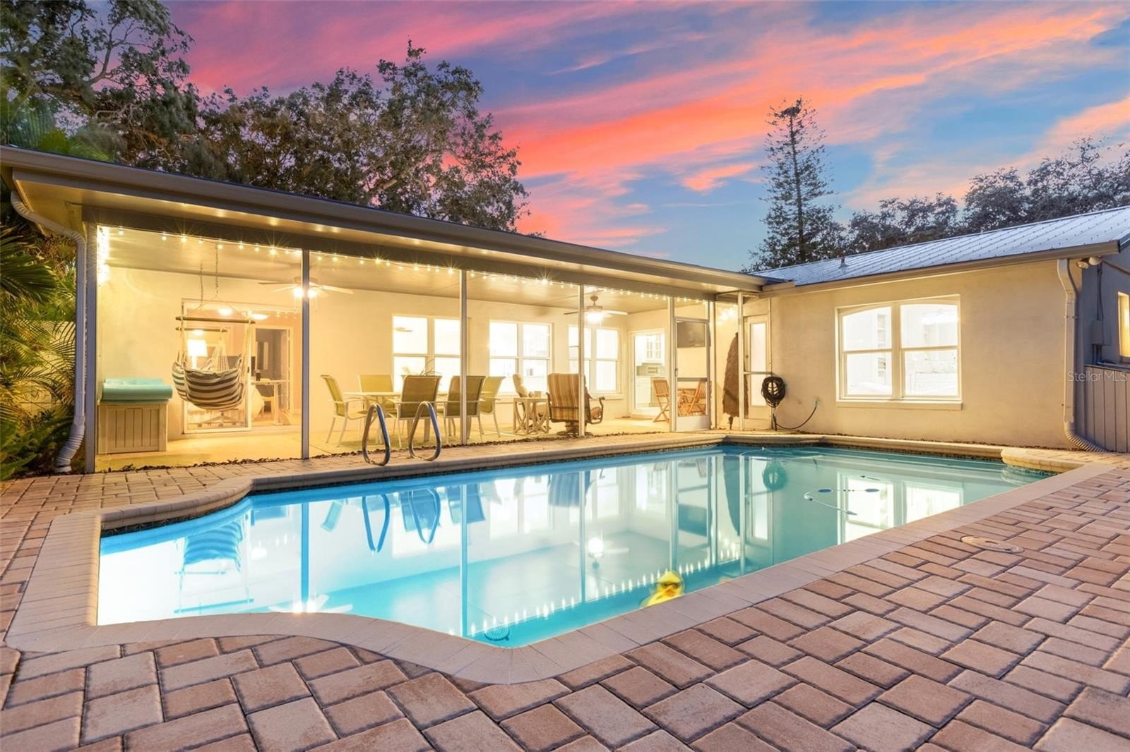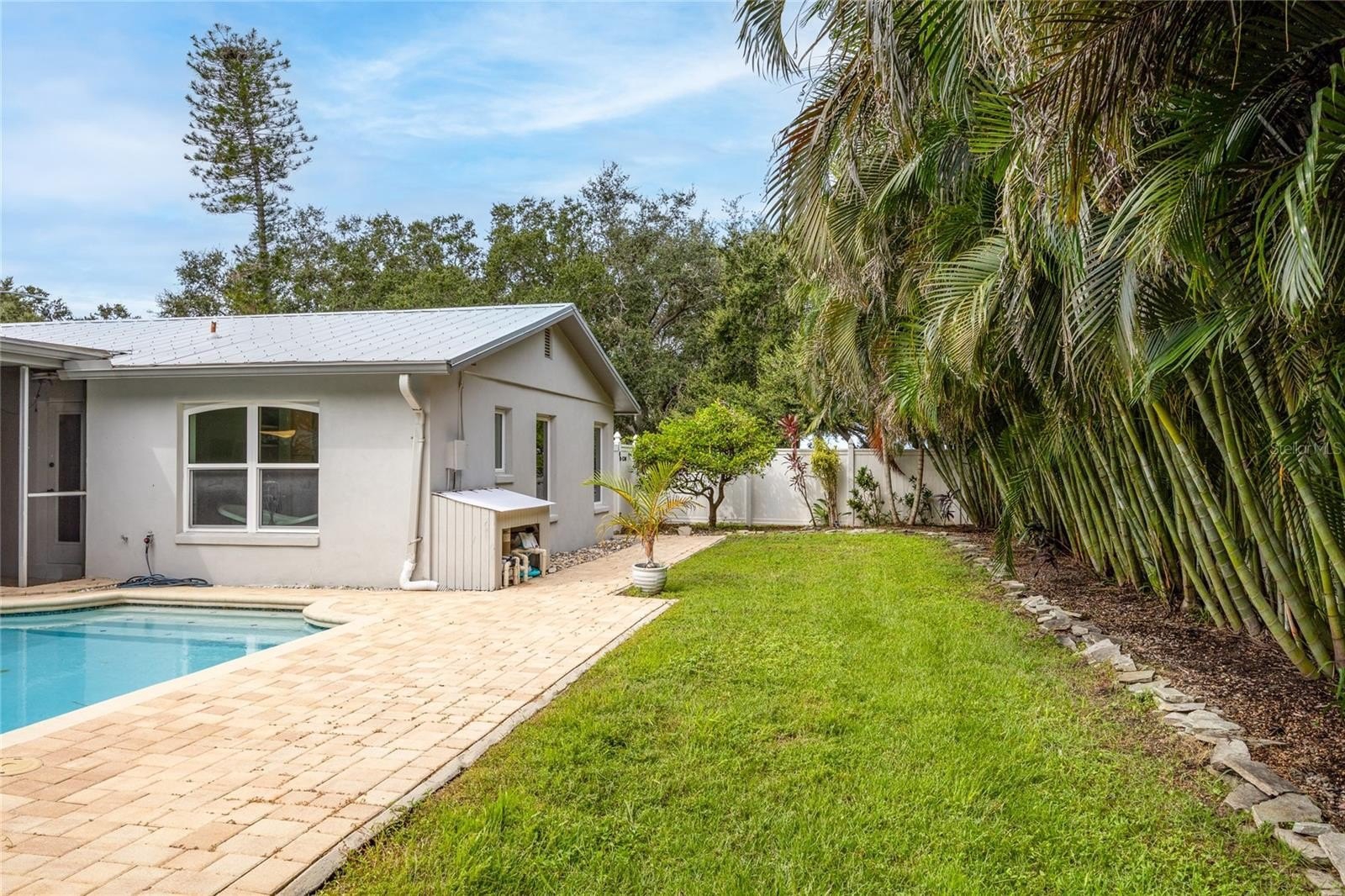 Enjoy glimpses of Boca Ciega Bay from the dining area and the primary suite and prepare for sunsets that will take your breath away. Arrive through the garage to a charming laundry/mudroom with a custom farmhouse sink. Outdoors, Florida living shines: a large screened porch (accessed by a sliding pocket door) overlooks the sparkling pool and fully fenced, private backyard, complete with a Meyer lemon tree.
