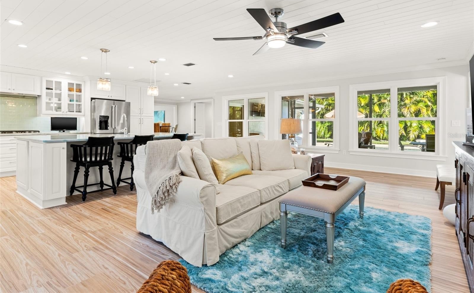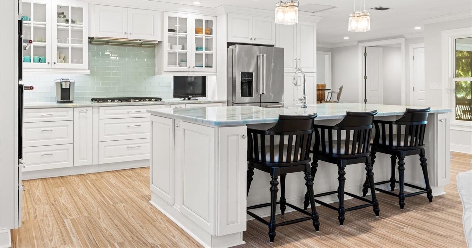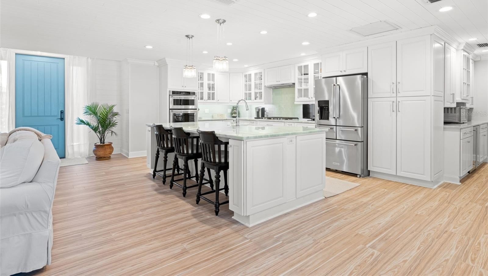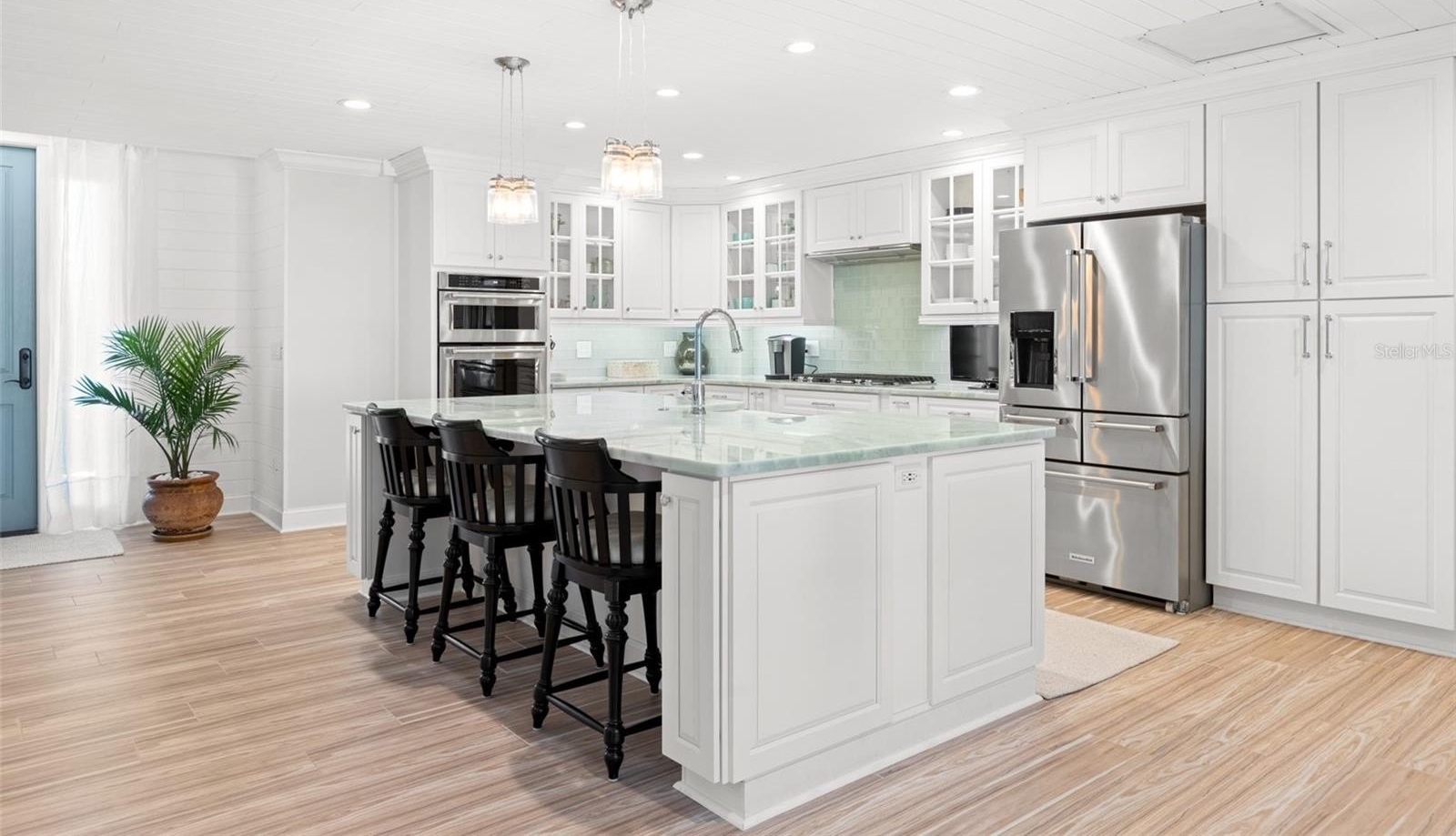 No stone was left unturned in this thoughtful, top-to-bottom remodel. Set on an oversized corner lot, this block-construction 2 bedroom, 2.5 bath ranch-style POOL home lives large with an open concept layout where the living room and chef’s kitchen flow seamlessly together. Walls of oversized, impact windows frame the tropical backyard oasis and bathe the interiors in natural light. The entertainer’s kitchen features custom wood cabinetry with oversized soft-close and spice drawers, a dramatic 10x5 island with farmhouse sink, dishwasher and extra storage/seating, striking quartzite countertops, and premium KitchenAid appliances—including a 36" 6-burner gas range, 5-door refrigerator, combo wall oven/microwave, plus a wine fridge and ice maker in the butler’s pantry.
