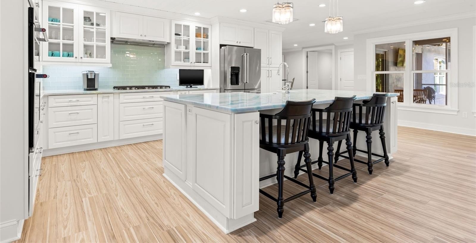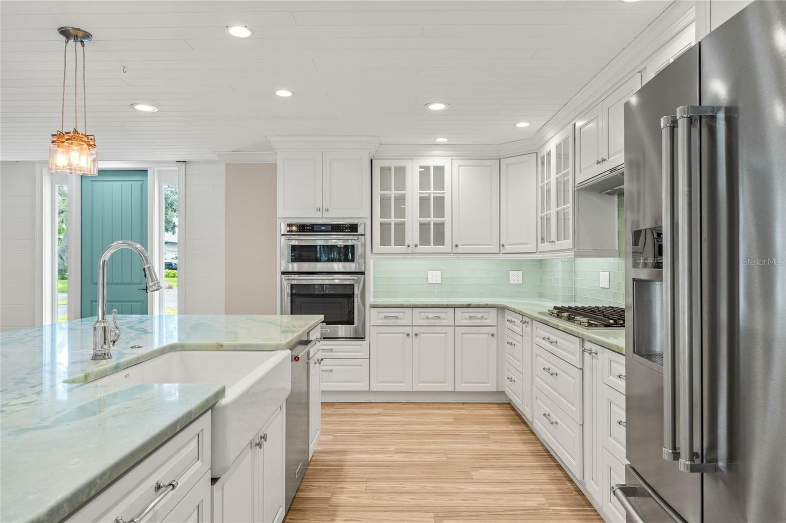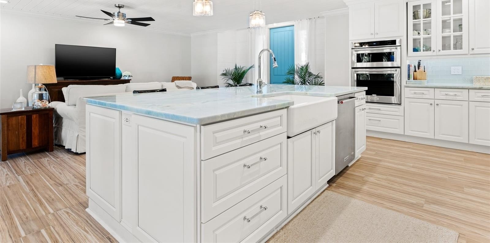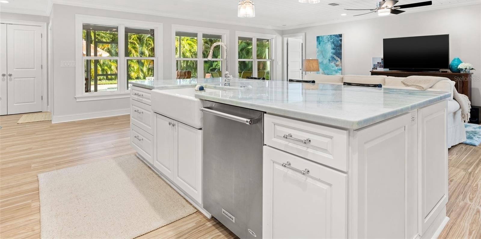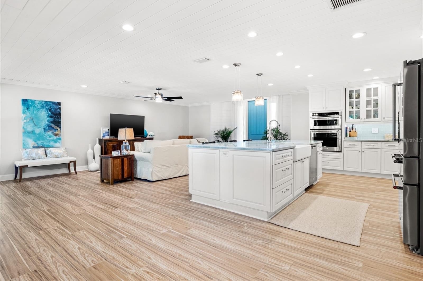 No stone was left unturned in this thoughtful, top-to-bottom remodel. Set on an oversized corner lot, this block-construction 2 bedroom, 2.5 bath ranch-style POOL home lives large with an open concept layout where the living room and chef’s kitchen flow seamlessly together. Walls of oversized, impact windows frame the tropical backyard oasis and bathe the interiors in natural light. The entertainer’s kitchen features custom wood cabinetry with oversized soft-close and spice drawers, a dramatic 10x5 island with farmhouse sink, dishwasher and extra storage/seating, striking quartzite countertops, and premium KitchenAid appliances—including a 36" 6-burner gas range, 5-door refrigerator, combo wall oven/microwave, plus a wine fridge and ice maker in the butler’s pantry.