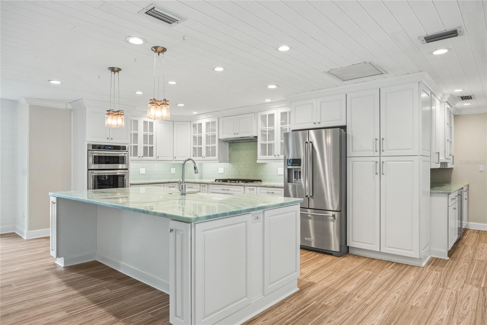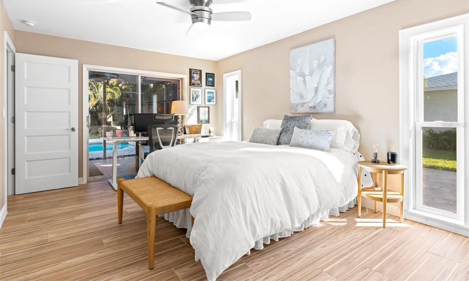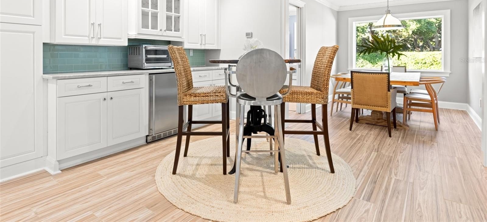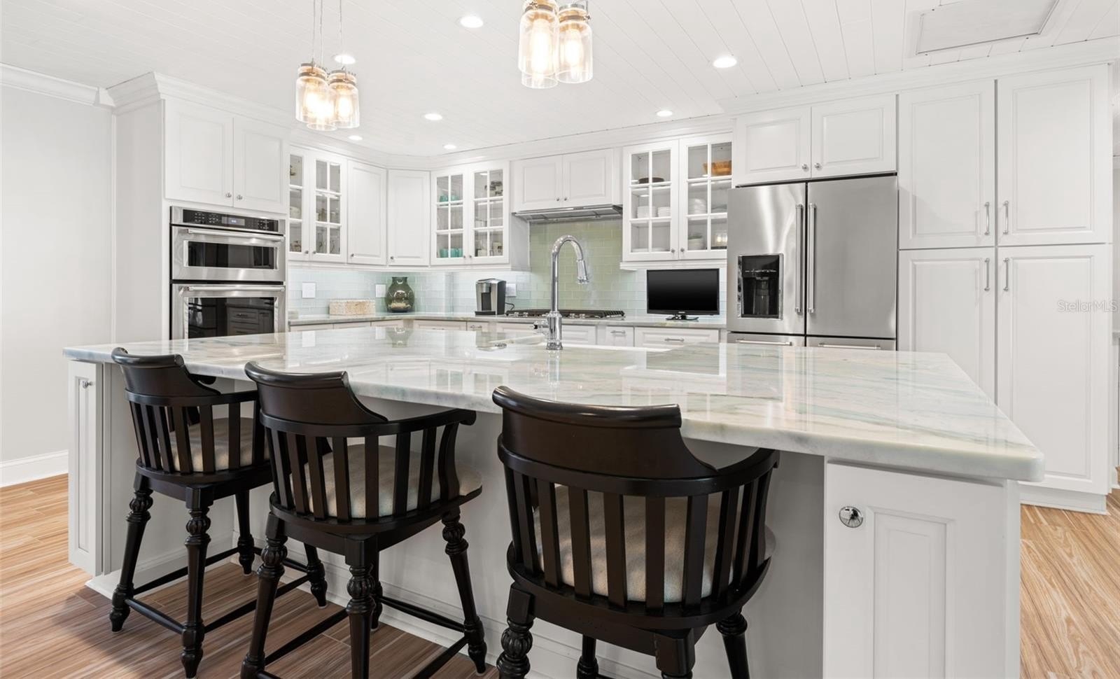 No stone was left unturned in this thoughtful, top-to-bottom remodel. Set on an oversized corner lot, this block-construction 2 bedroom, 2.5 bath ranch-style POOL home lives large with an open concept layout where the living room and chef’s kitchen flow seamlessly together. Walls of oversized, impact windows frame the tropical backyard oasis and bathe the interiors in natural light. The entertainer’s kitchen features custom wood cabinetry with oversized soft-close and spice drawers, a dramatic 10x5 island with farmhouse sink, dishwasher and extra storage/seating, striking quartzite countertops, and premium KitchenAid appliances—including a 36" 6-burner gas range, 5-door refrigerator, combo wall oven/microwave, plus a wine fridge and ice maker in the butler’s pantry.