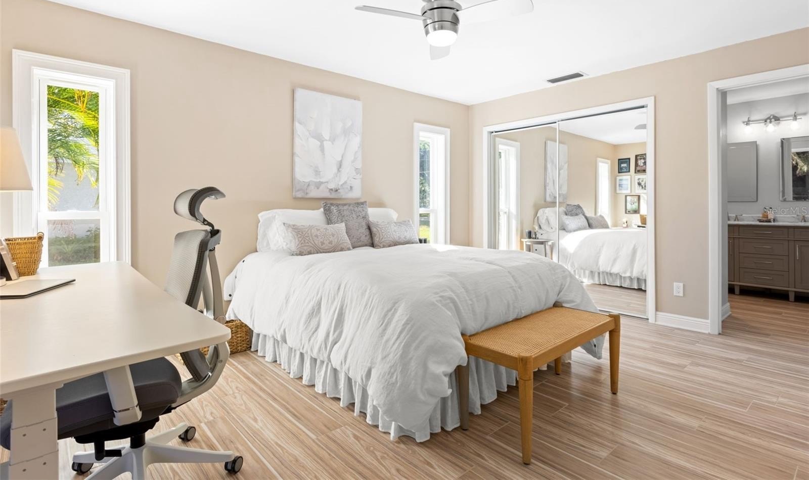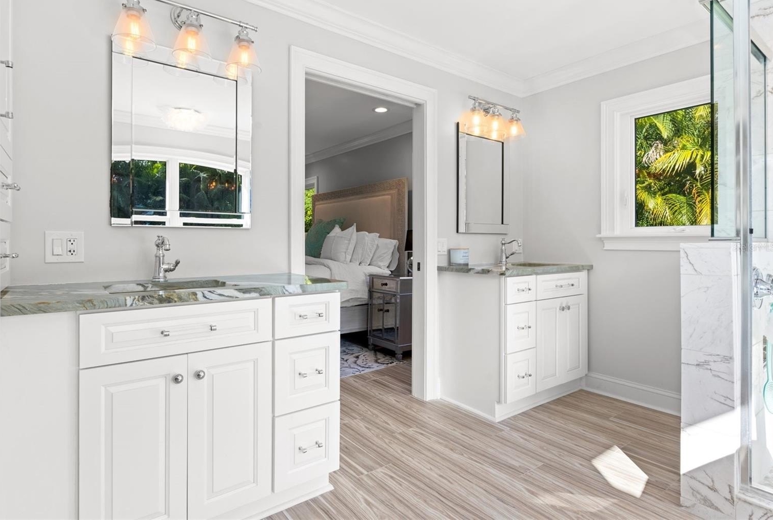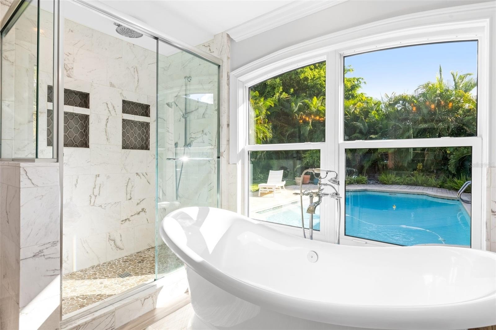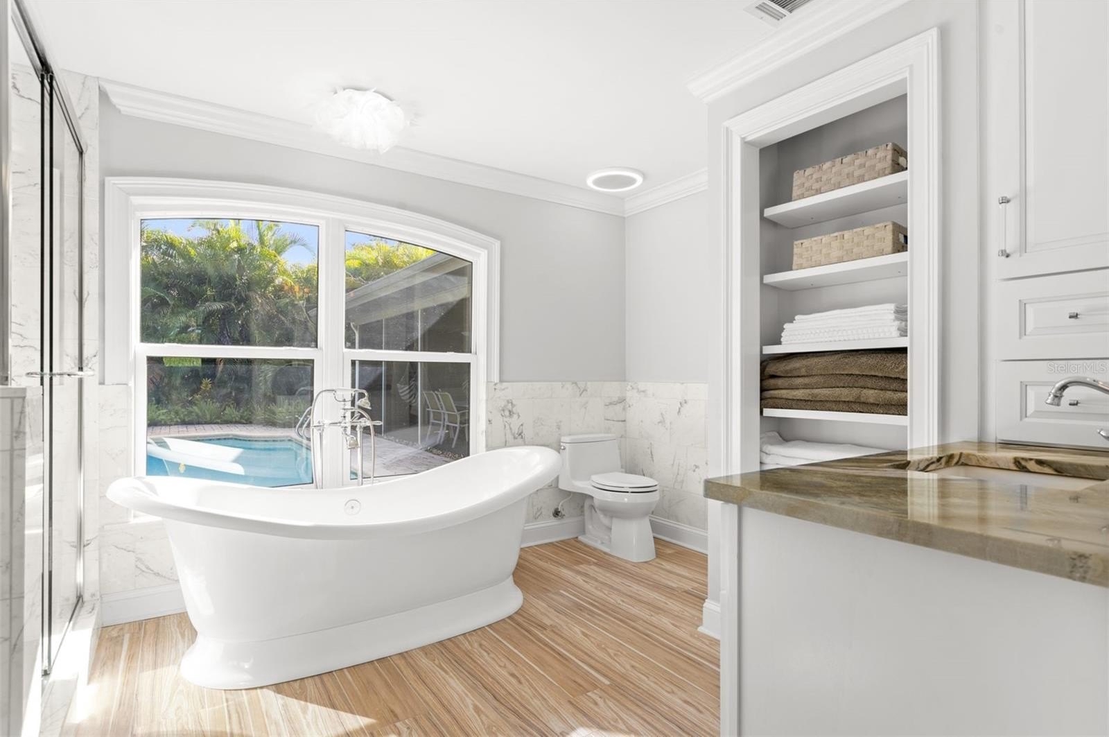 Porcelain tile flooring carries throughout. The split plan offers two spacious bedrooms, each with an ensuite bath, plus a convenient half bath that opens to the screened lanai for easy pool access. The serene primary suite provides a custom walk-in closet, sitting area, and a spa-worthy bath with dual vanities with quartzite countertops, a marble walk-in shower boasting four niches, and a Victoria + Albert Marlborough double-ended slipper tub overlooking the lush landscape including 30+ Eureka palms—designed for everyday resort living.