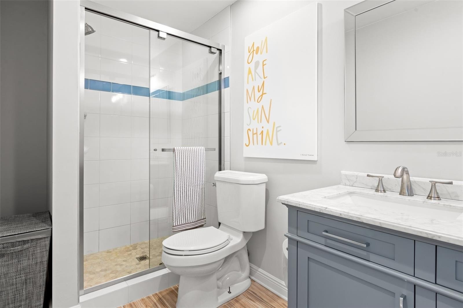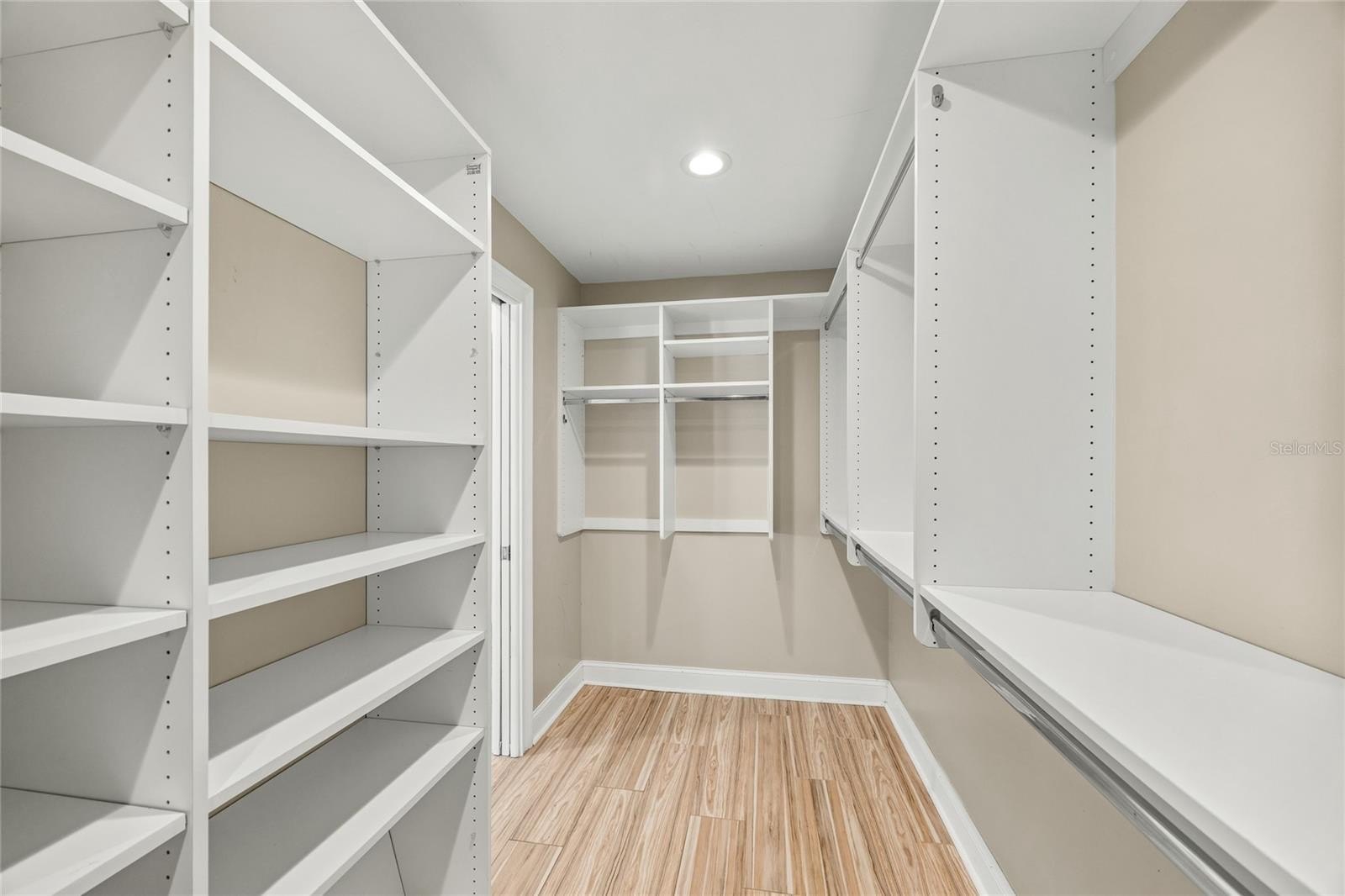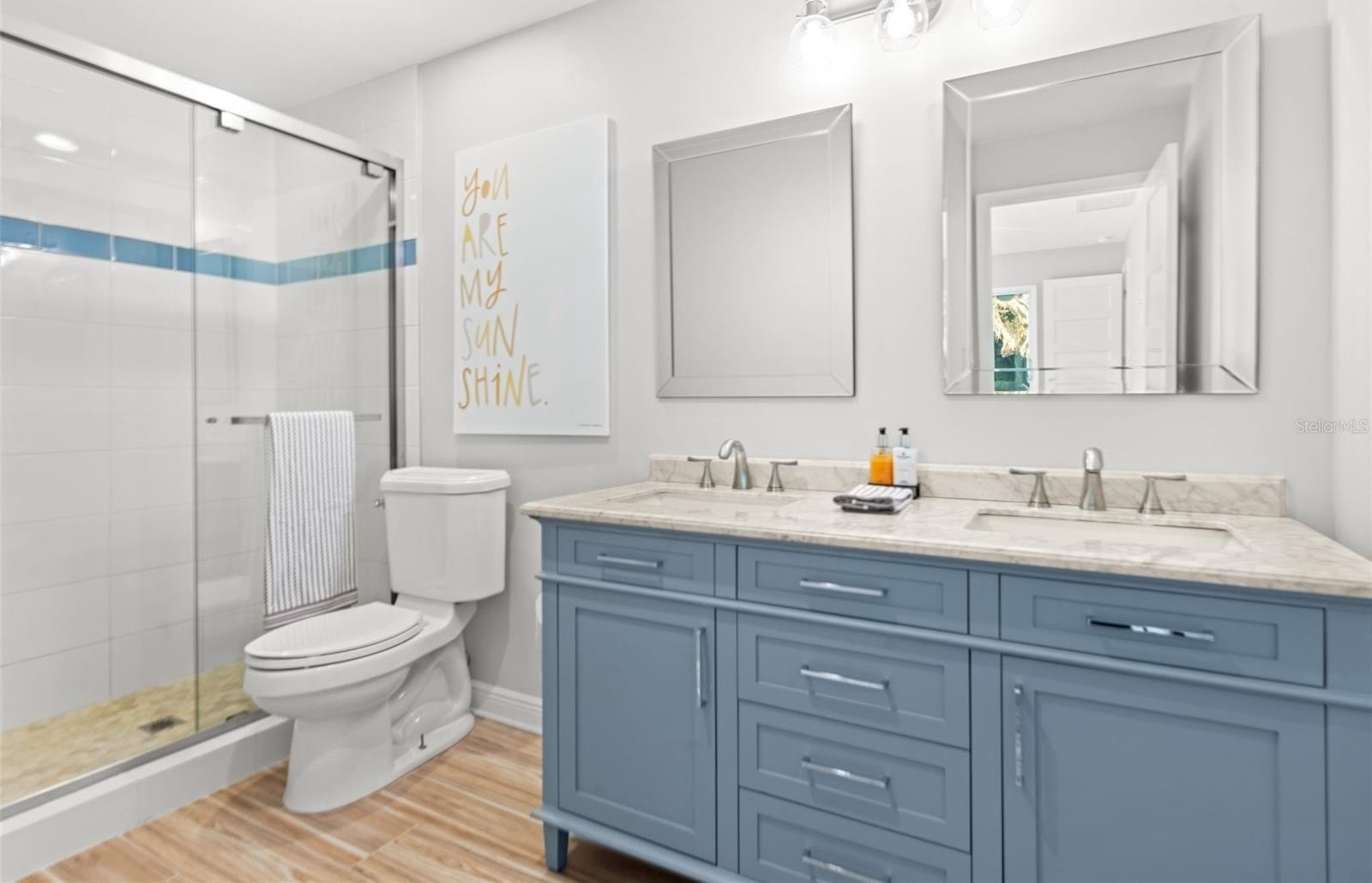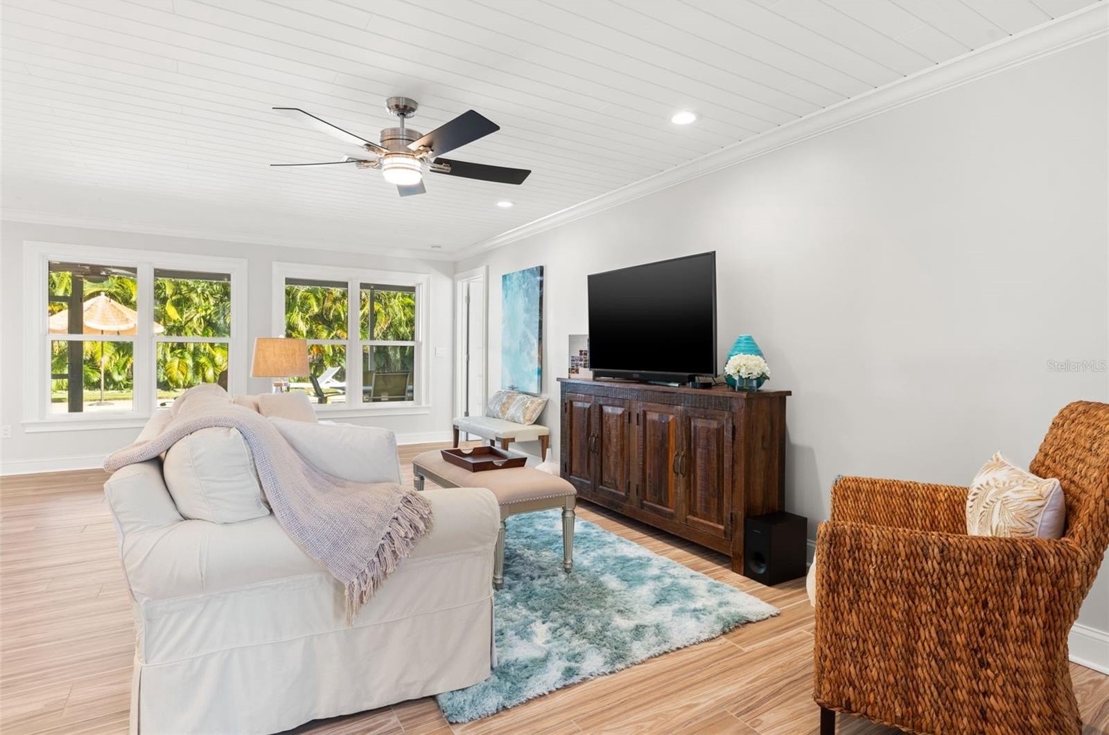 Porcelain tile flooring carries throughout. The split plan offers two spacious bedrooms, each with an ensuite bath, plus a convenient half bath that opens to the screened lanai for easy pool access. The serene primary suite provides a custom walk-in closet, sitting area, and a spa-worthy bath with dual vanities with quartzite countertops, a marble walk-in shower boasting four niches, and a Victoria + Albert Marlborough double-ended slipper tub overlooking the lush landscape including 30+ Eureka palms—designed for everyday resort living.