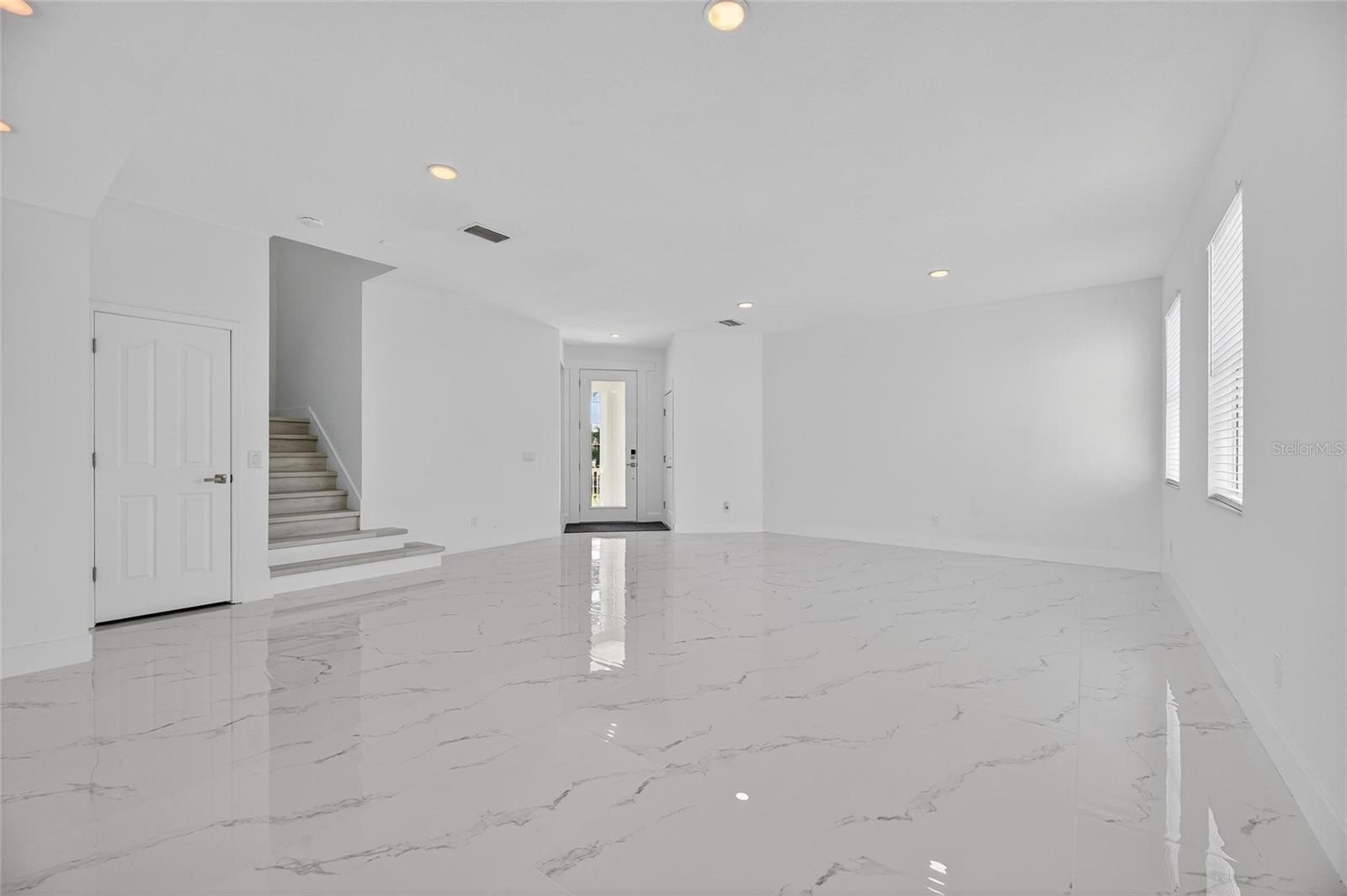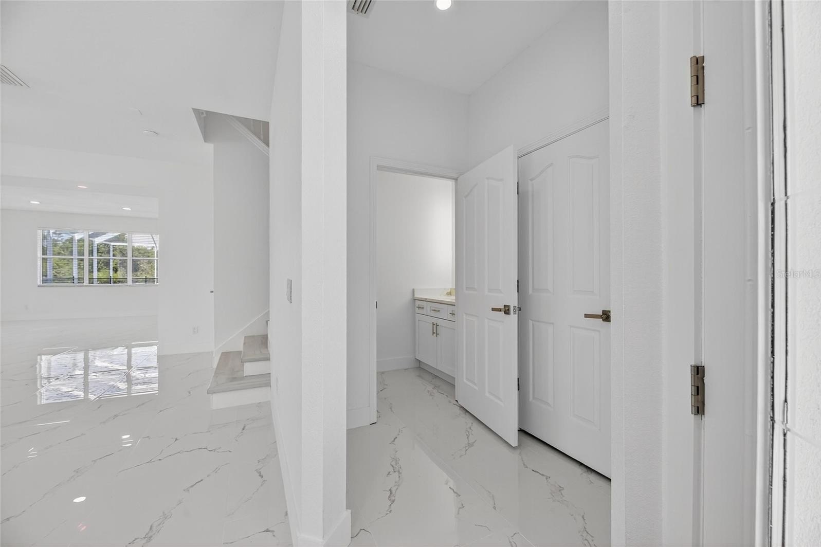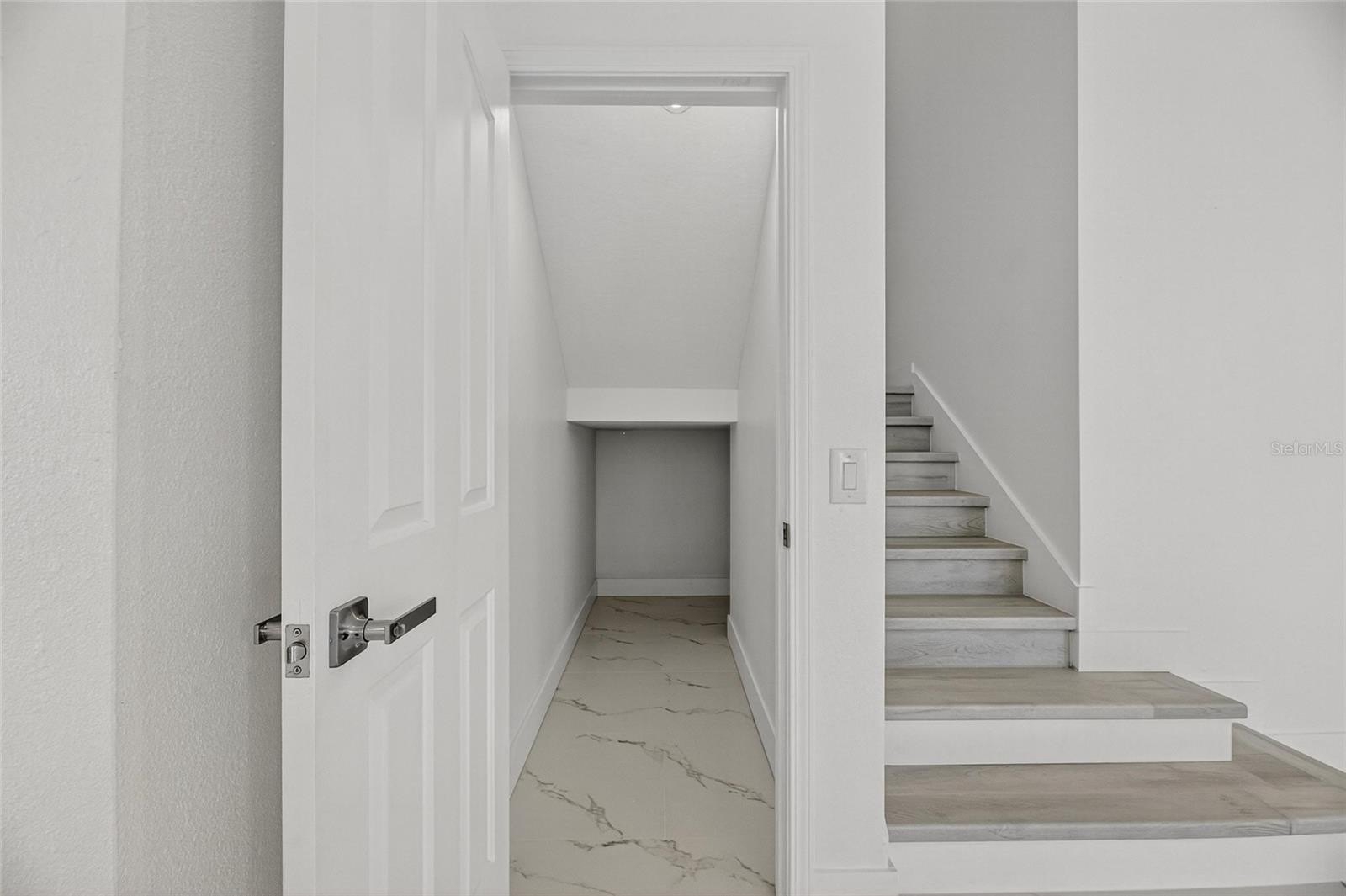 From the kitchen, step outside to the screened-in pool and spa, where you’ll enjoy tranquil views of the lake and surrounding conservation area—an inviting space to unwind or entertain year-round. A convenient storage closet is tucked beneath the staircase on the main floor.