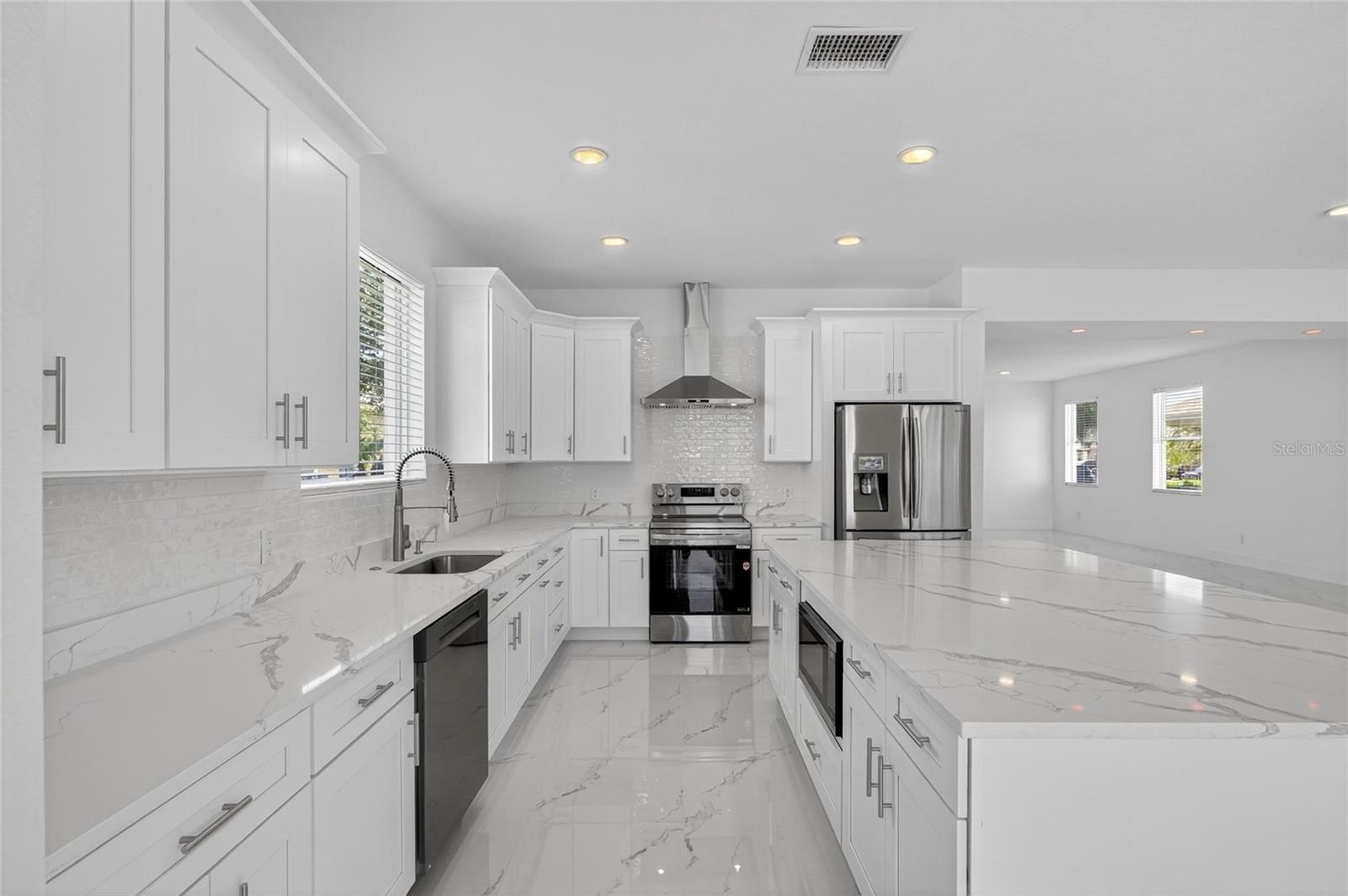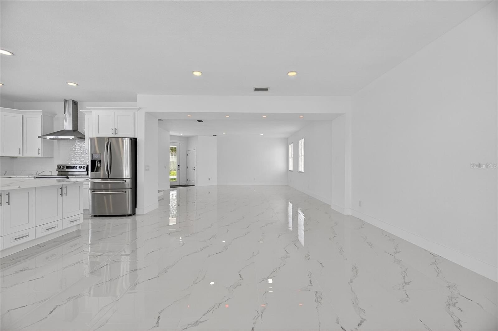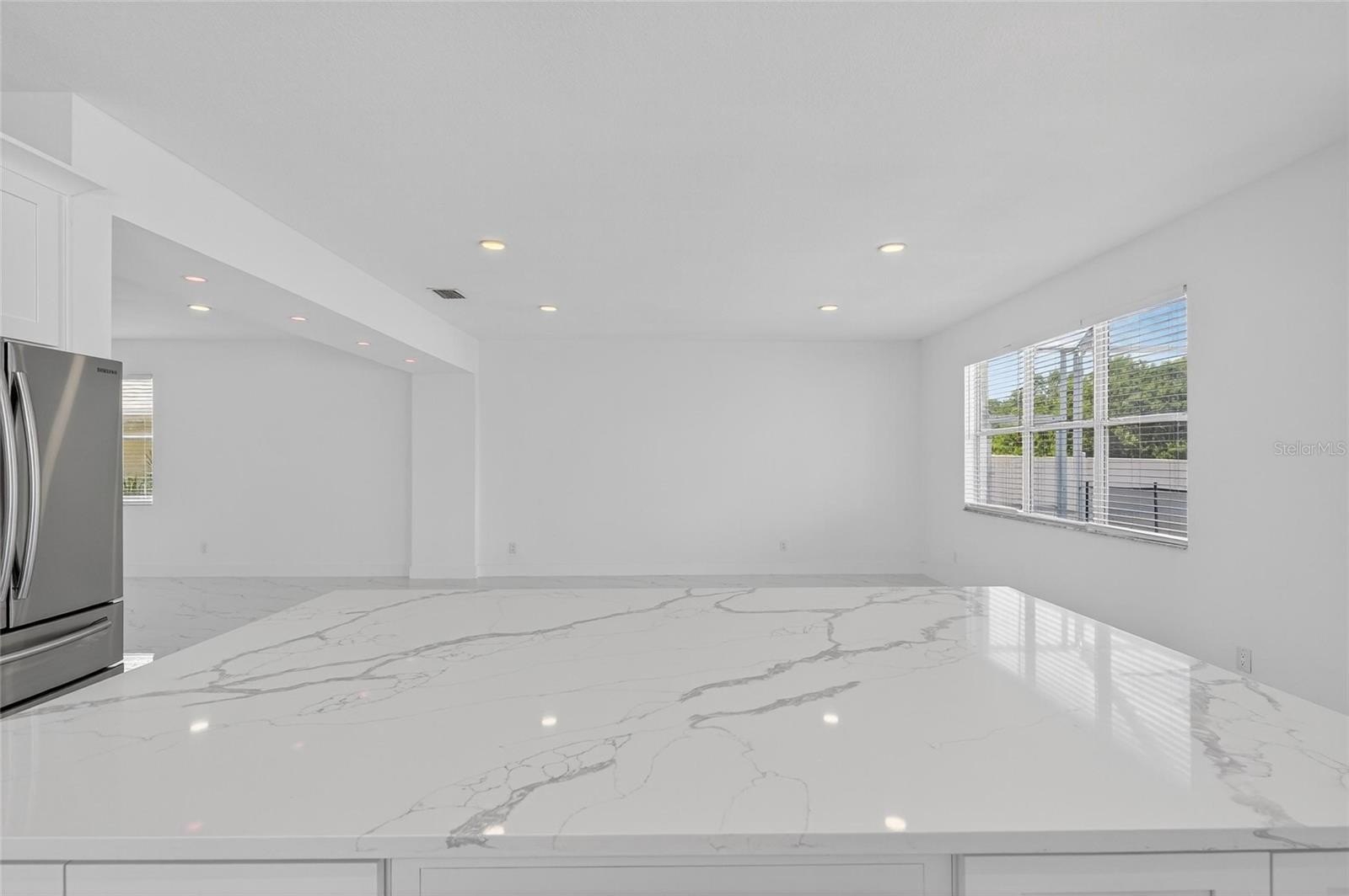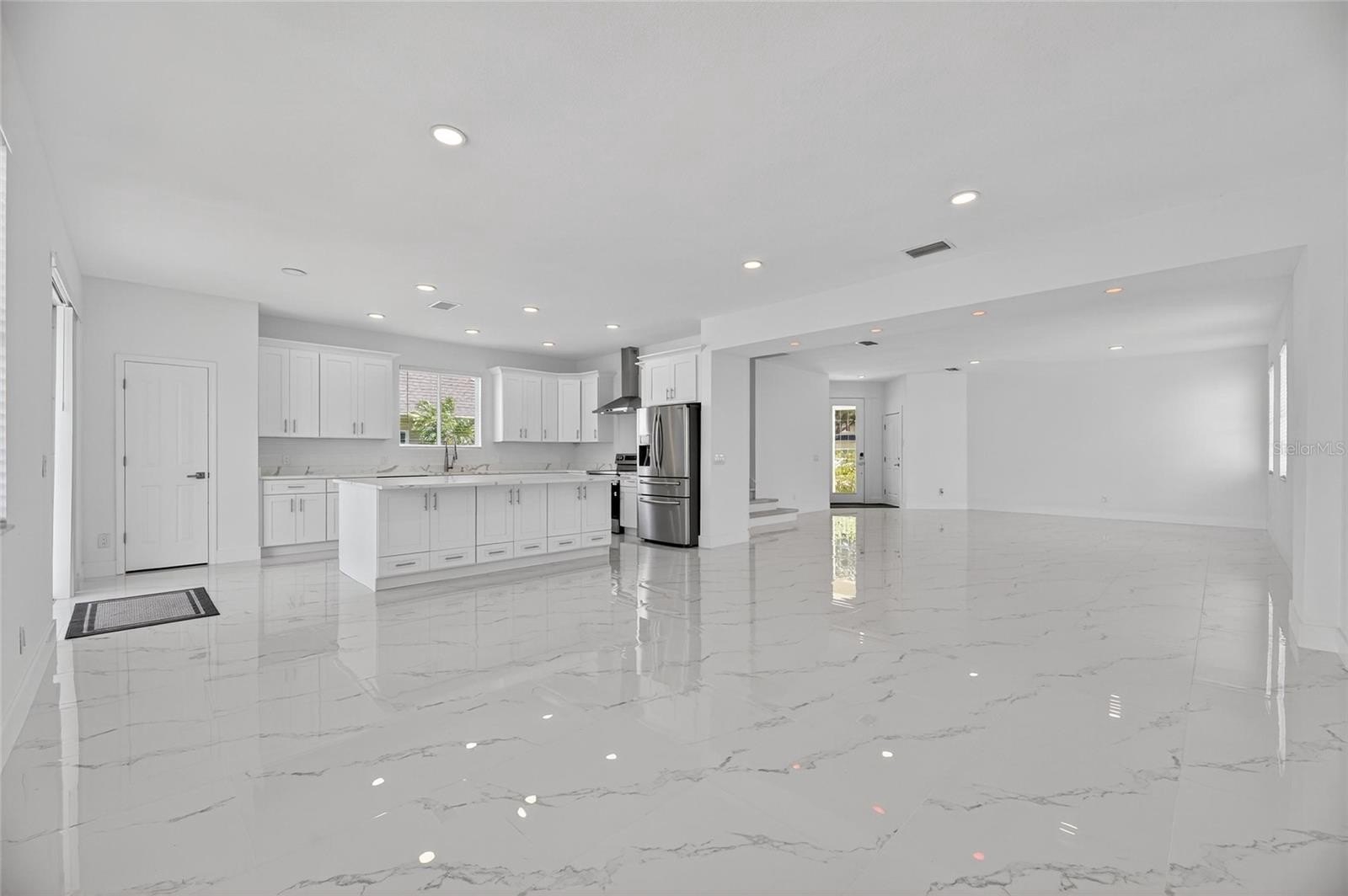 Step inside to an expansive open-concept design where the kitchen, living, and dining areas blend seamlessly, creating the ideal setting for gatherings with family and friends. The kitchen serves as the heart of the home, featuring brand-new stainless steel appliances, a quartz island with built-in microwave, and a state-of-the-art touchscreen refrigerator that syncs with your phone—allowing you to stream music throughout the lower level. The island doubles as a breakfast bar and offers abundant storage with cabinets on both sides, complemented by additional upper and lower cabinetry for maximum functionality and style.