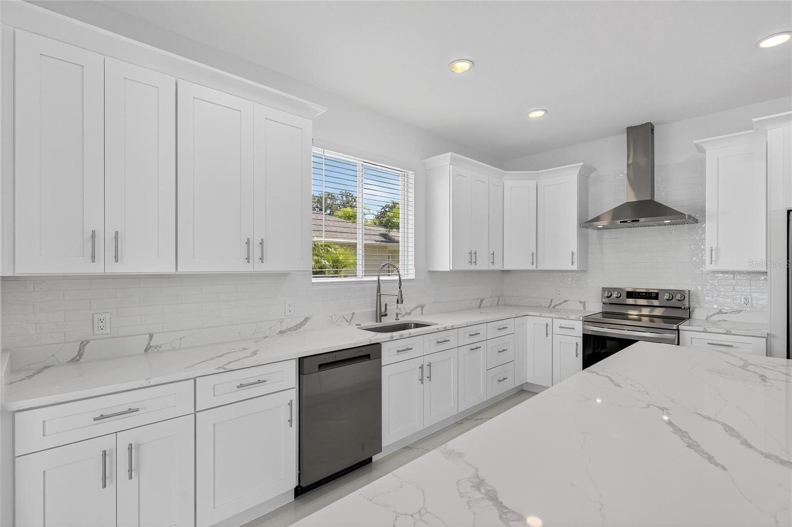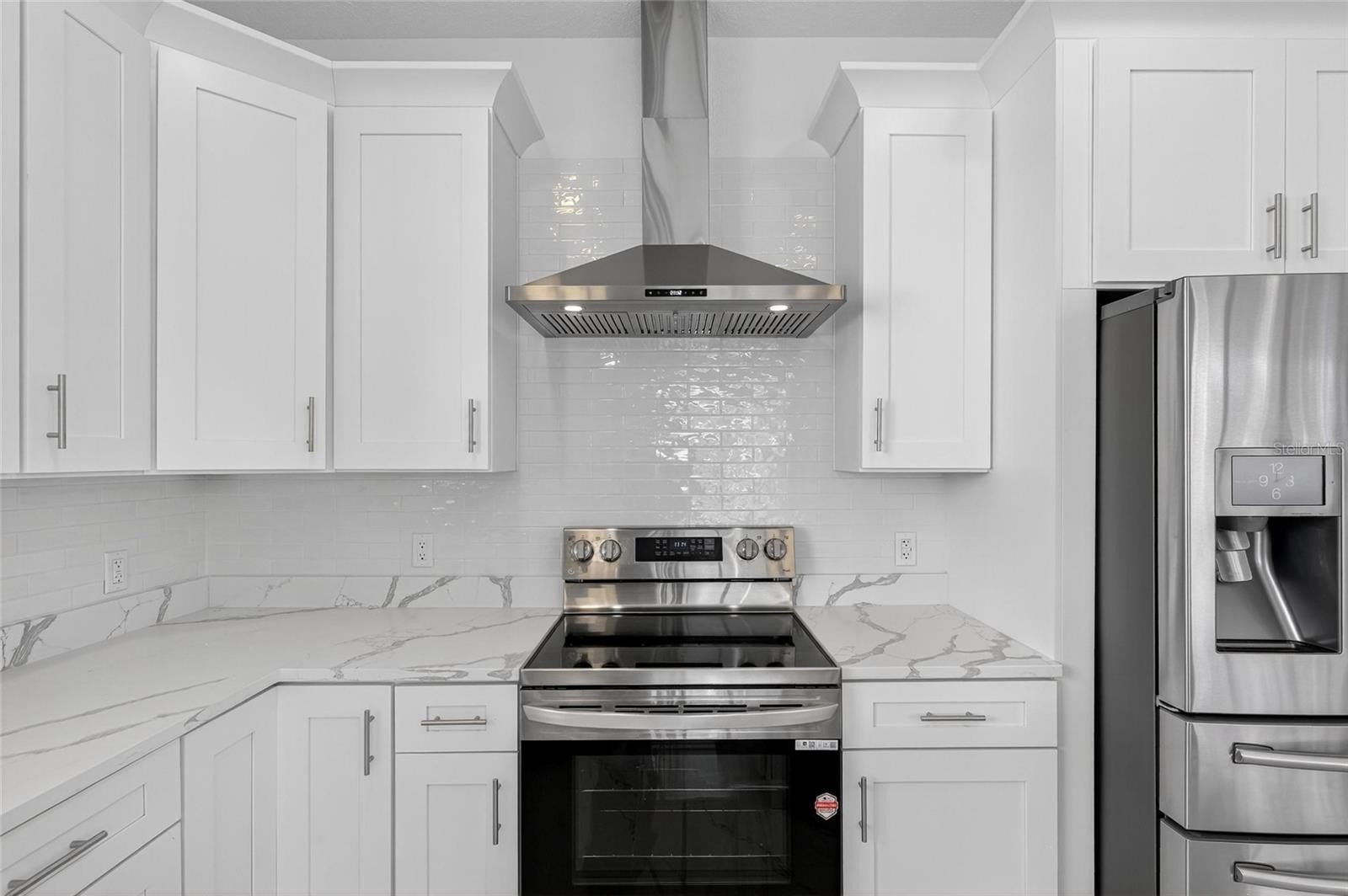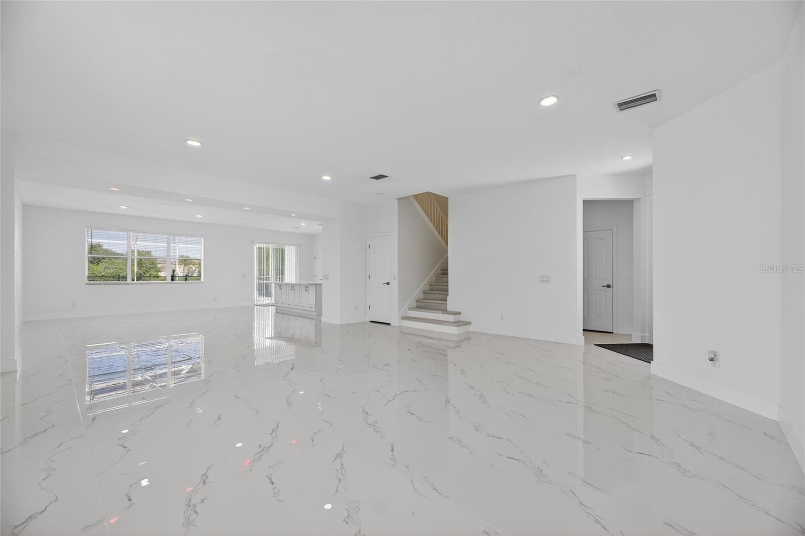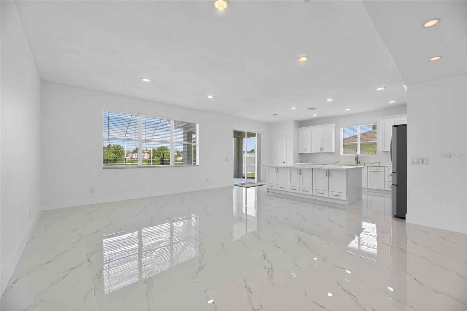 Step inside to an expansive open-concept design where the kitchen, living, and dining areas blend seamlessly, creating the ideal setting for gatherings with family and friends. The kitchen serves as the heart of the home, featuring brand-new stainless steel appliances, a quartz island with built-in microwave, and a state-of-the-art touchscreen refrigerator that syncs with your phone—allowing you to stream music throughout the lower level. The island doubles as a breakfast bar and offers abundant storage with cabinets on both sides, complemented by additional upper and lower cabinetry for maximum functionality and style.