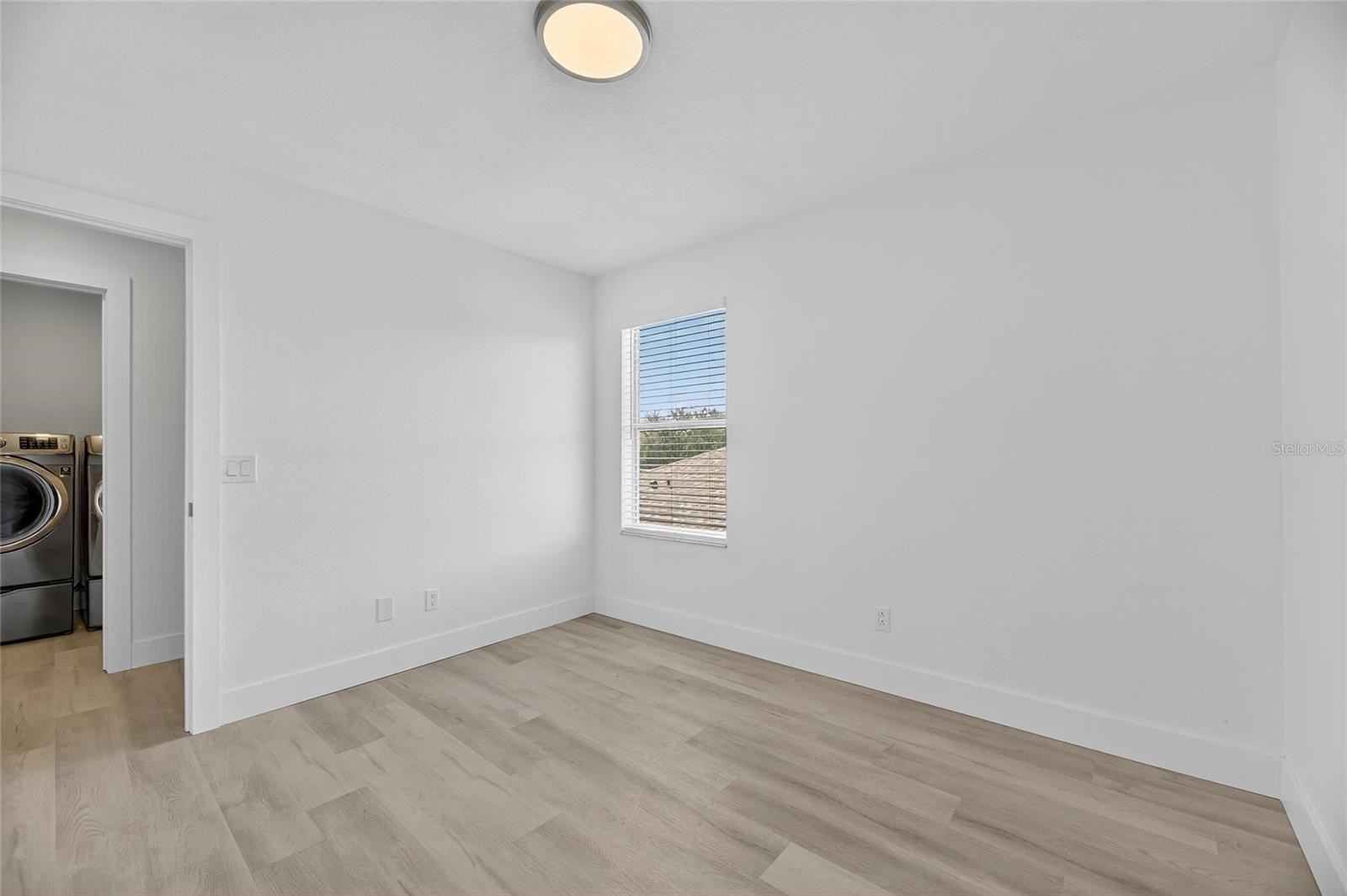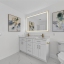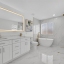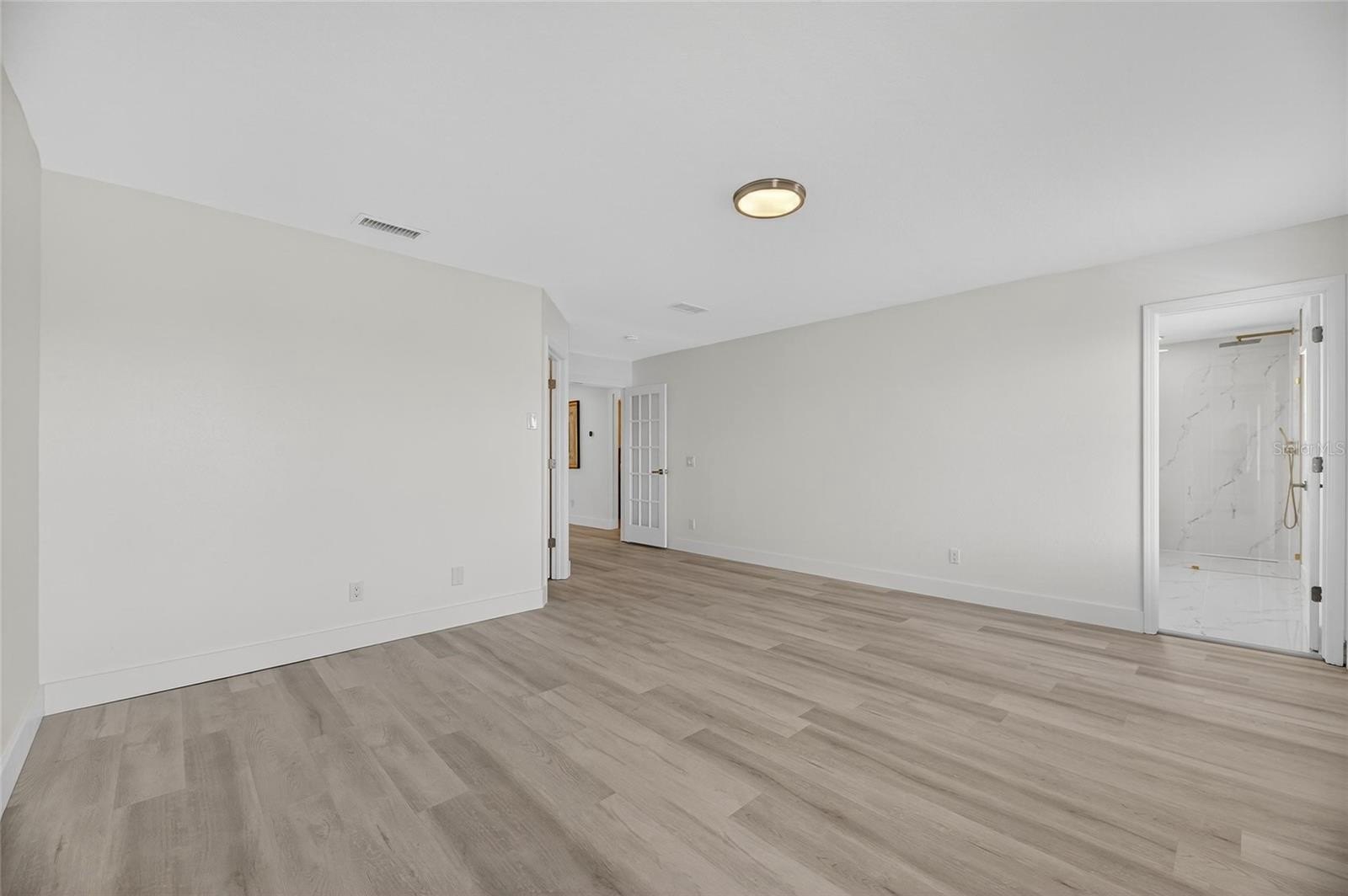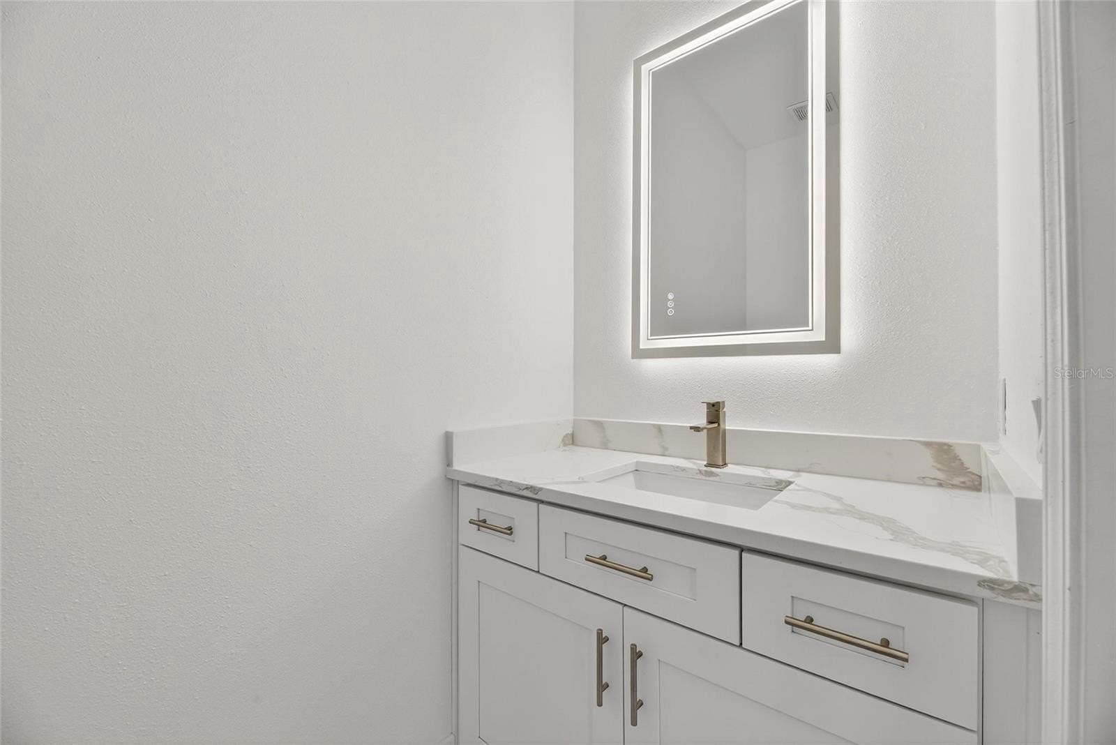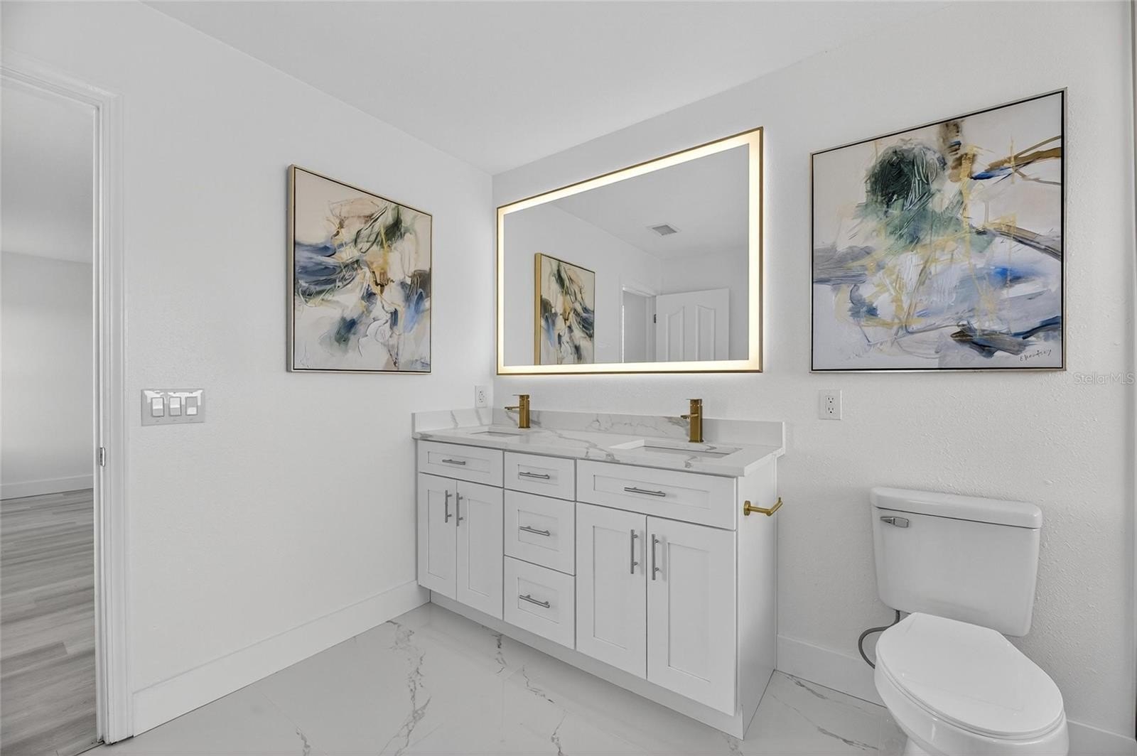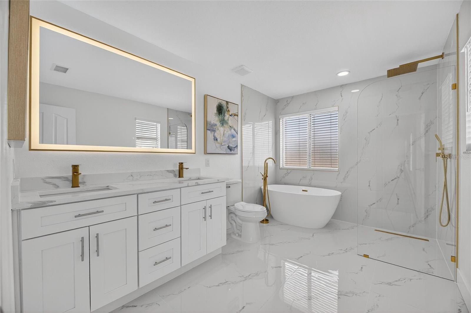 Upstairs, the spacious primary suite overlooks the pool, lake, and lush greenery. Its spa-inspired bathroom showcases floor-to-ceiling marble tile, gold faucets and fixtures, and a luxurious wet room featuring a walk-in shower, freestanding tub, and rain showerhead. Three additional generously sized bedrooms share a stylish hall bathroom with a tub-shower combo and rain showerhead.