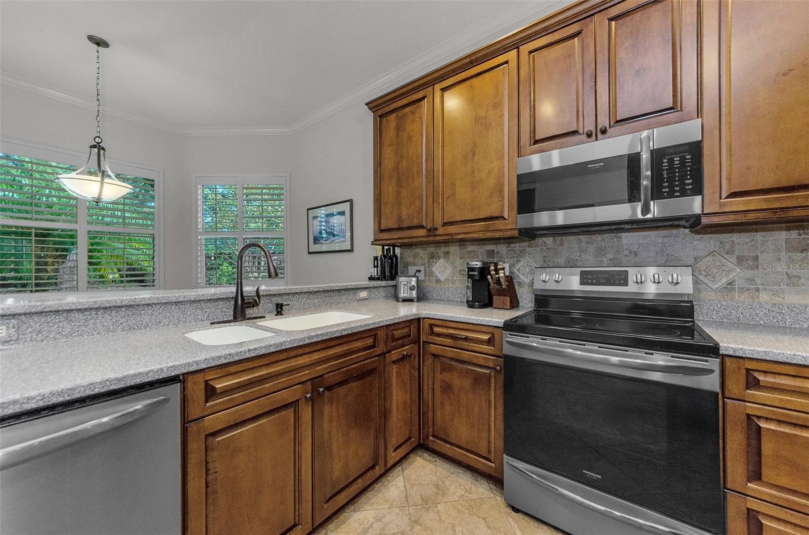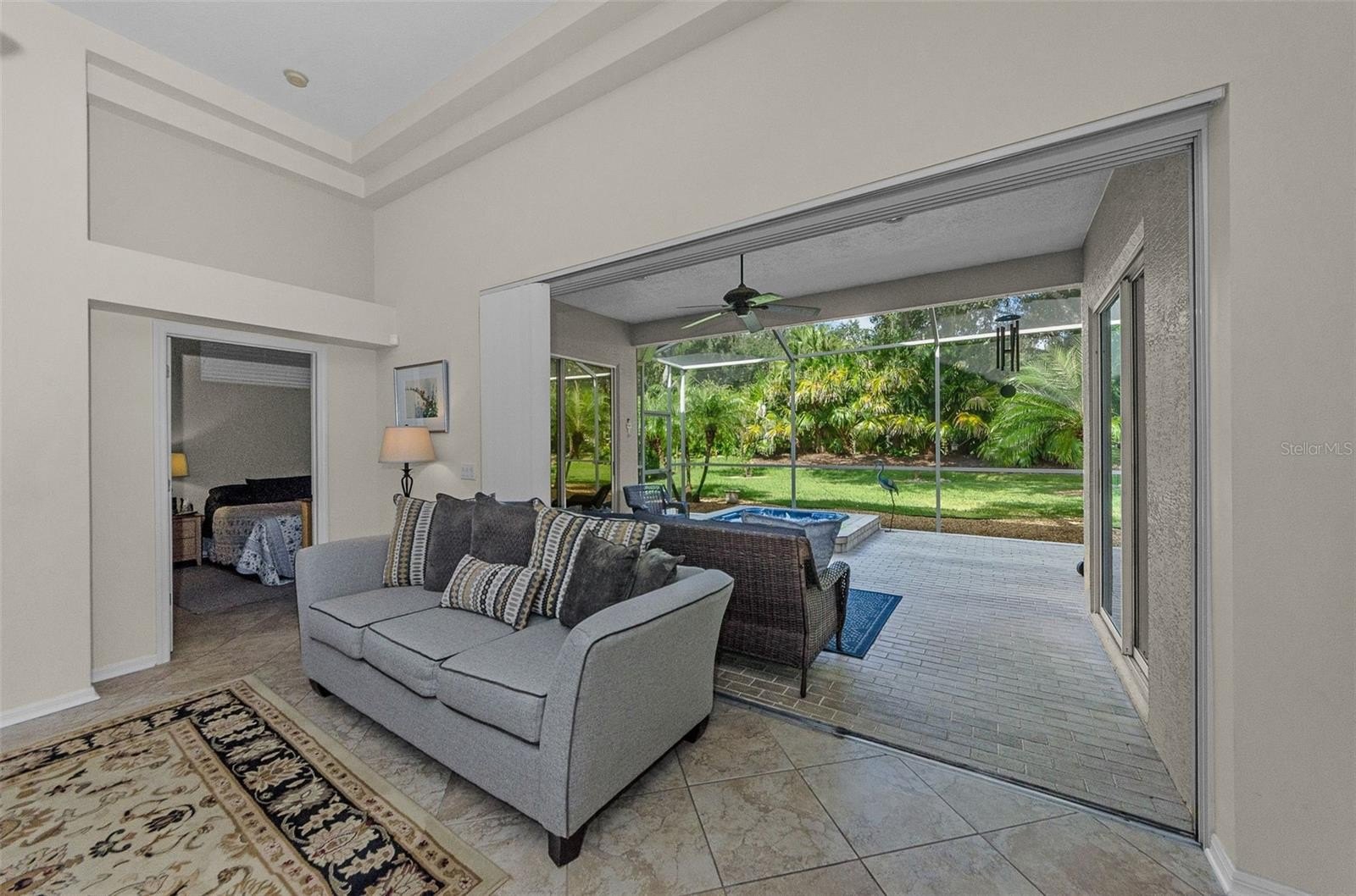 The spacious kitchen boasts 42-inch cabinetry, newer stainless steel appliances, and a breakfast nook overlooking the screened-in patio. The adjacent living room features a pocket sliding glass door that opens fully to the outdoor living area, allowing for seamless indoor-outdoor enjoyment. The patio itself is a private oasis with paver flooring, a covered and screened area, an inground spa, and an additional open-air space ideal for grilling and soaking up the Florida sun.
