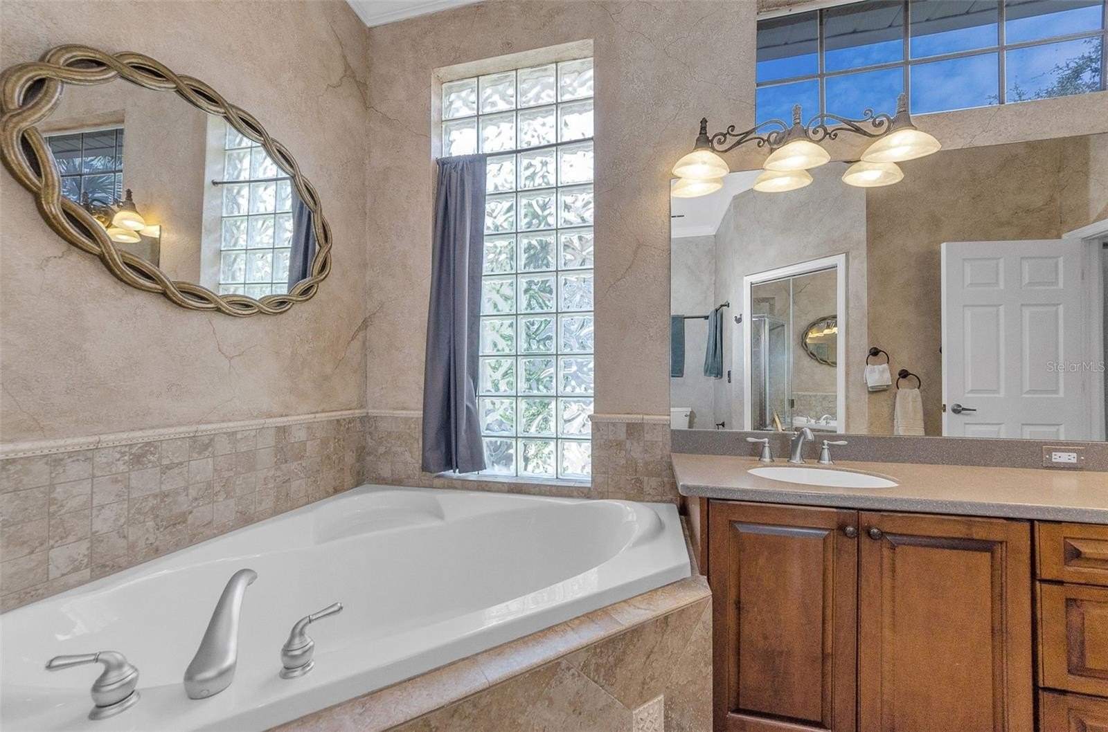 The oversized primary suite includes dual closets and a luxurious en-suite bathroom with a double sink vanity, garden tub, and an expansive walk-in shower with built-in bench seating. The two additional bedrooms are located on the opposite side of the home with a shared full bath featuring a tub-shower combo, offering privacy and flexibility for guests or family.