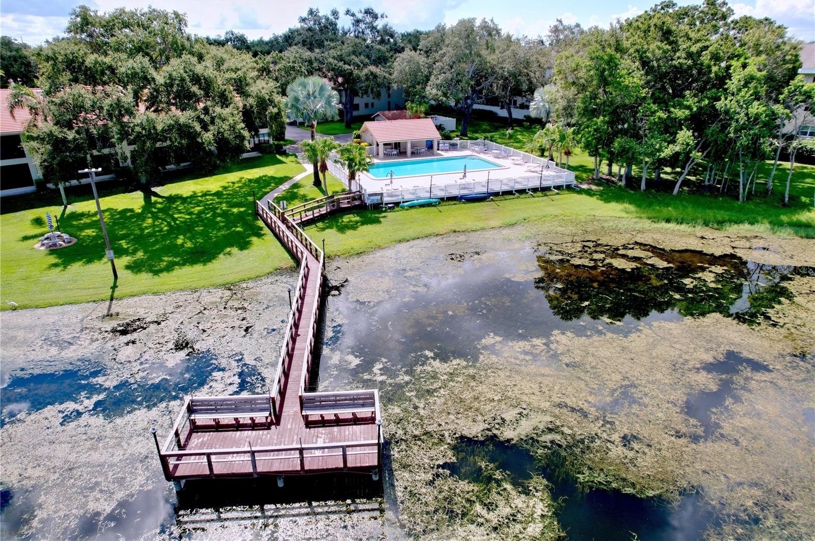 MUST SEE! Experience serene lakeside living in this charming 2BR/2BA second-floor condo, located in the beautifully maintained 55+ community of Villas of Lake Arbor. Enjoy breathtaking water views from the heated community pool or take a peaceful stroll along the fishing pier overlooking the sparkling lake. This light-filled condo features vaulted ceilings, a spacious living/dining area with wet bar, and an eat-in kitchen with stainless steel appliances, newer wood-look LVP flooring, and a convenient breakfast bar. The private primary suite offers a walk-in closet, en-suite bath with walk-in shower, and direct access to the screened, covered lanai—perfect for enjoying the gentle lake breeze. Additional highlights include a full-size laundry room, assigned covered carport, outdoor storage closet, and ample guest parking. HOA covers water, trash, cable, internet, roof, exterior maintenance, and building insurance. Pet-friendly. New roof in 2023. NO FLOOD ZONE or EVACUATION ZONE. Minutes to Clearwater & Dunedin Beaches, Countryside Mall, top recreation, dining, and airport. Carefree Florida living at its finest—schedule your private showing today!