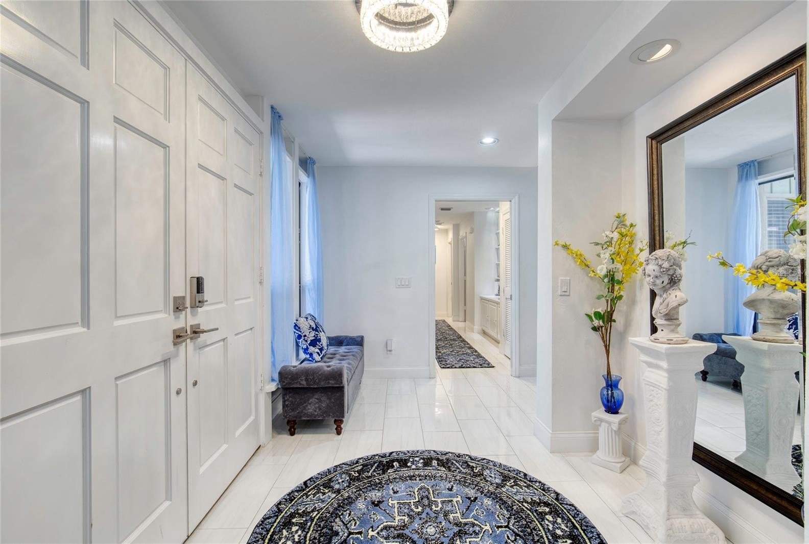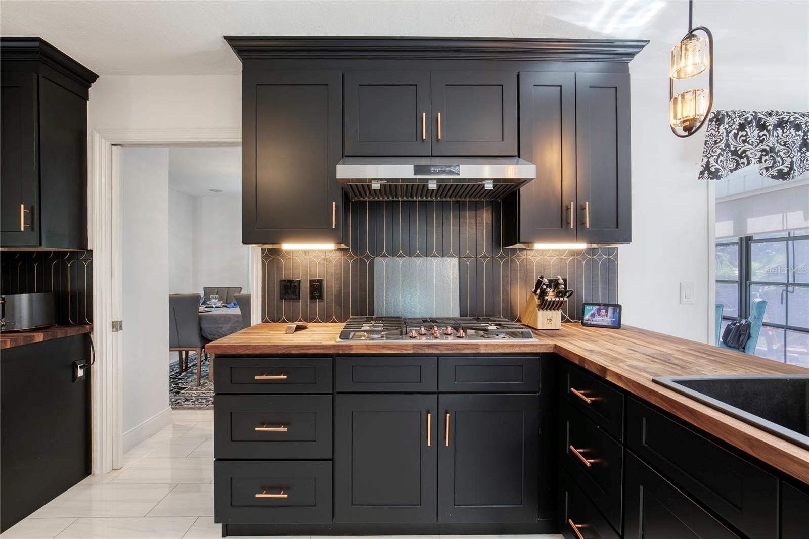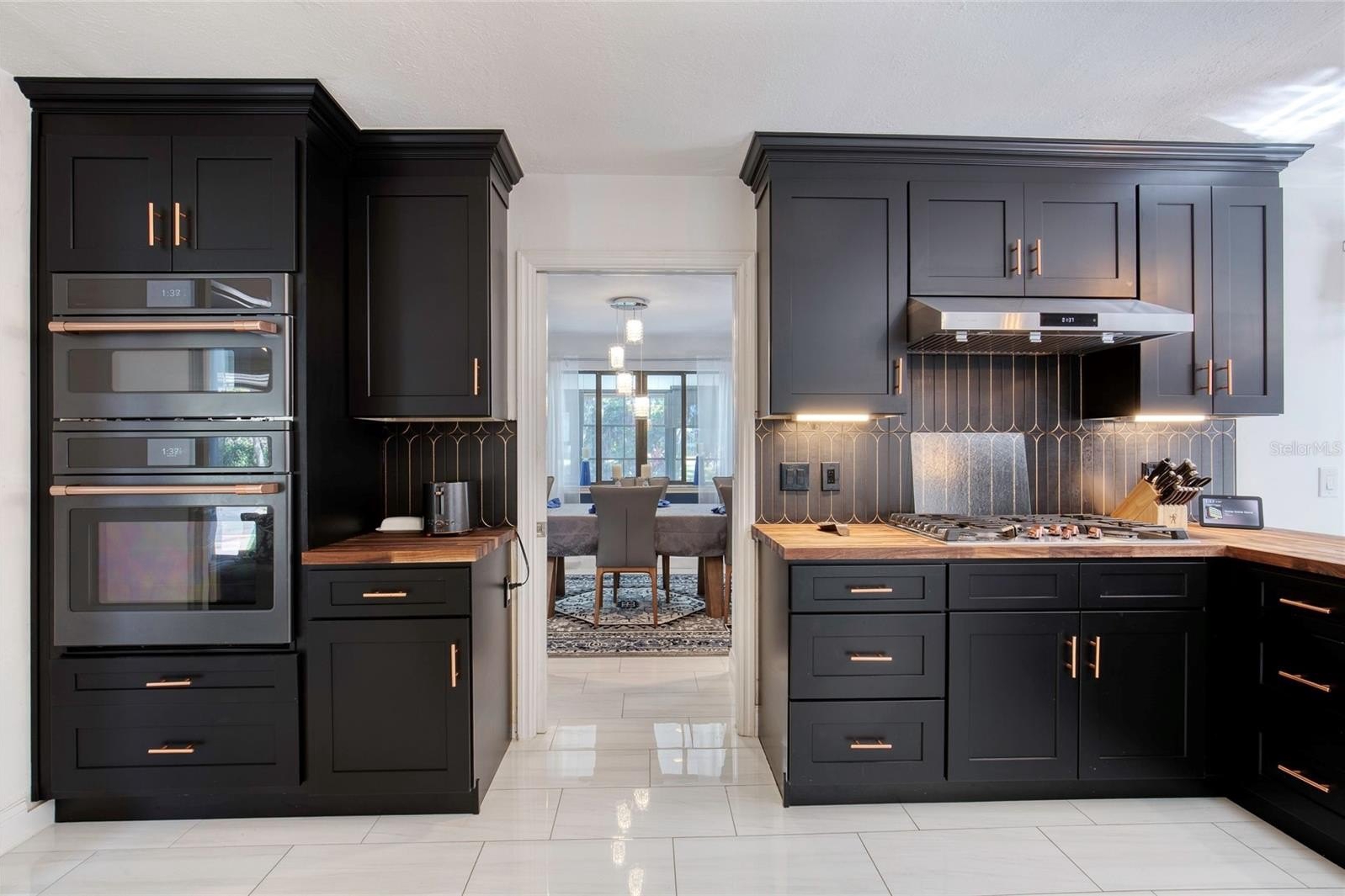 This extraordinary, designer-renovated 4-bedroom, 3-bath residence offers over 2,600 square feet of luxurious living space, modern efficiency, and breathtaking golf course views in beautiful New Smyrna Beach. From the moment you arrive, the inviting curb appeal, upgraded landscaping, and spacious circular driveway showcase the quality and care invested in this home. Inside, soaring architectural ceilings reach up to 15 feet, filling the space with natural light that highlights the polished white porcelain tile flowing seamlessly throughout and the upgraded lighting that illuminates every detail. The home's gourmet kitchen is a true showpiece—completely renovated in 2024 with high-end Café brand appliances featuring a black and rose-gold finish, a gas stove with stainless-steel vent hood, butcher block countertops, double ovens with one doubling as a microwave, a wine cooler, and abundant cabinetry offering exceptional storage. The living room features a stunning blue porcelain-tiled fireplace, creating a cozy and stylish focal point for gatherings. The main wing of the home includes spacious bedrooms with excellent storage, while the primary suite offers a lavish, spa-inspired bathroom showcasing premium 4' x 4' porcelain tile, a large walk-in shower, and gorgeous finishes throughout. An instant hot water system ensures you will never run out of hot water, and dual-zoned A/C allows you to close off areas of the home when not in use, promoting energy efficiency without sacrificing comfort.