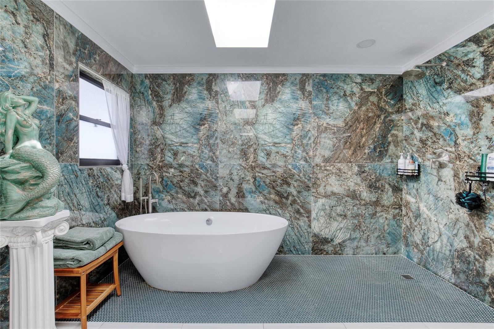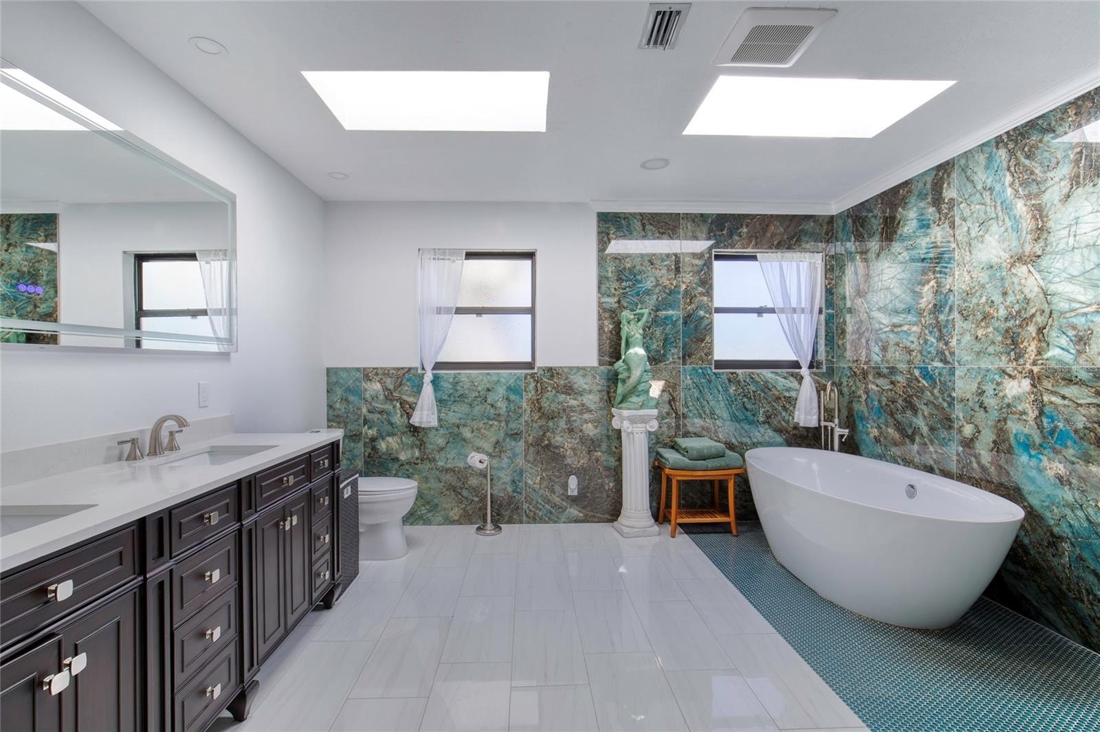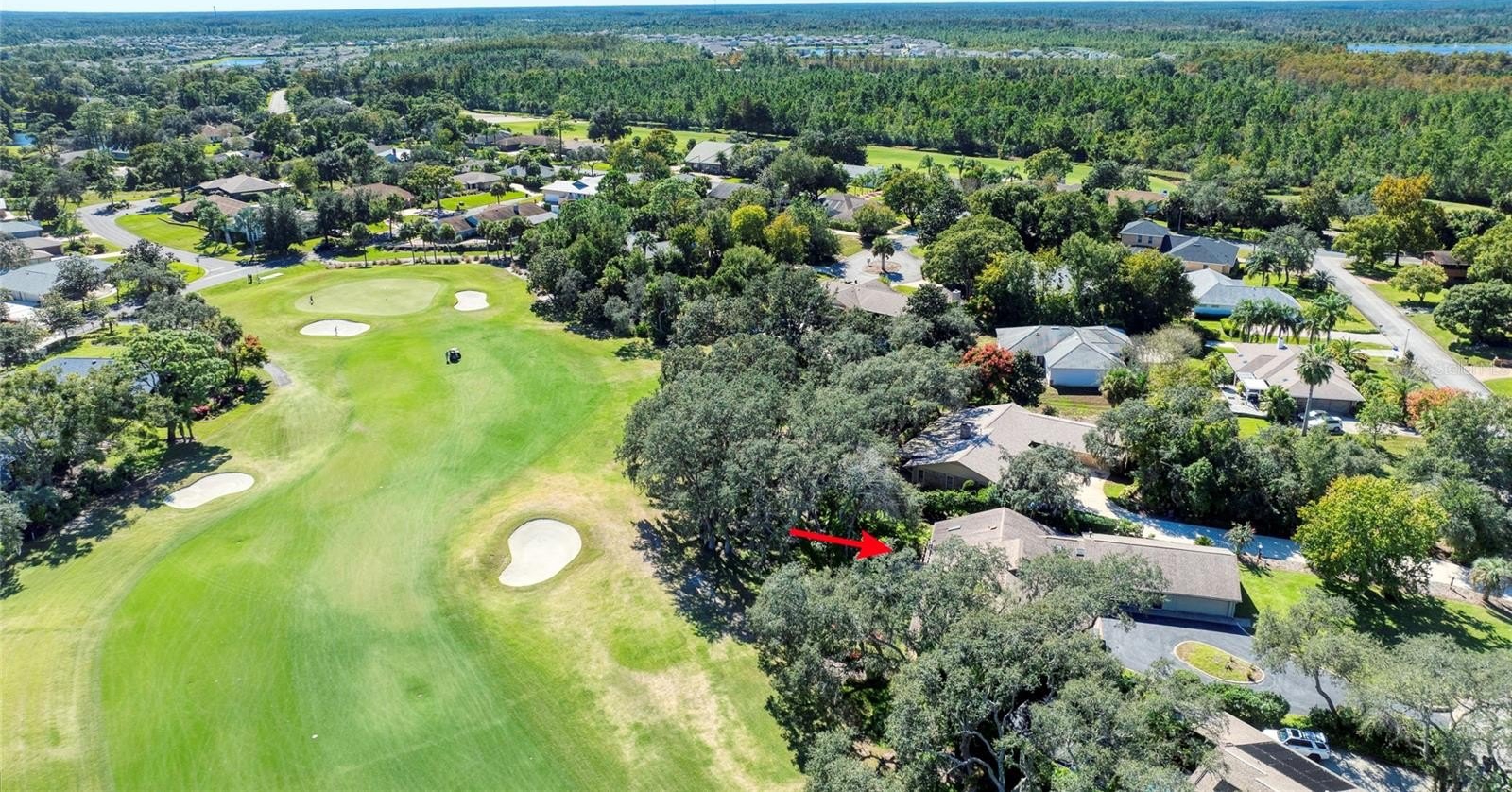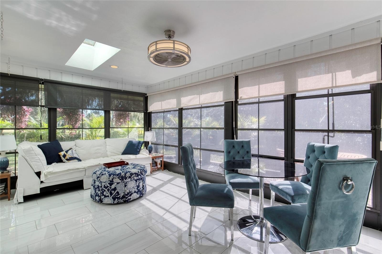 This extraordinary, designer-renovated 4-bedroom, 3-bath residence offers over 2,600 square feet of luxurious living space, modern efficiency, and breathtaking golf course views in beautiful New Smyrna Beach. From the moment you arrive, the inviting curb appeal, upgraded landscaping, and spacious circular driveway showcase the quality and care invested in this home. Inside, soaring architectural ceilings reach up to 15 feet, filling the space with natural light that highlights the polished white porcelain tile flowing seamlessly throughout and the upgraded lighting that illuminates every detail. The home's gourmet kitchen is a true showpiece—completely renovated in 2024 with high-end Café brand appliances featuring a black and rose-gold finish, a gas stove with stainless-steel vent hood, butcher block countertops, double ovens with one doubling as a microwave, a wine cooler, and abundant cabinetry offering exceptional storage. The living room features a stunning blue porcelain-tiled fireplace, creating a cozy and stylish focal point for gatherings. The main wing of the home includes spacious bedrooms with excellent storage, while the primary suite offers a lavish, spa-inspired bathroom showcasing premium 4' x 4' porcelain tile, a large walk-in shower, and gorgeous finishes throughout. An instant hot water system ensures you will never run out of hot water, and dual-zoned A/C allows you to close off areas of the home when not in use, promoting energy efficiency without sacrificing comfort.