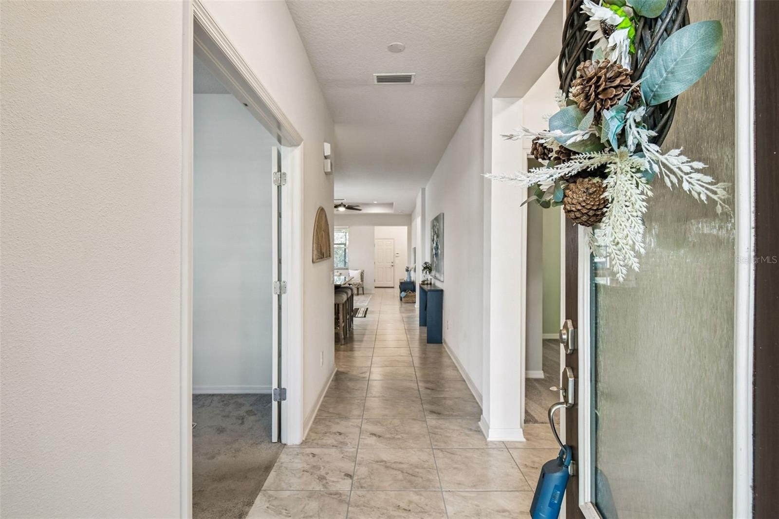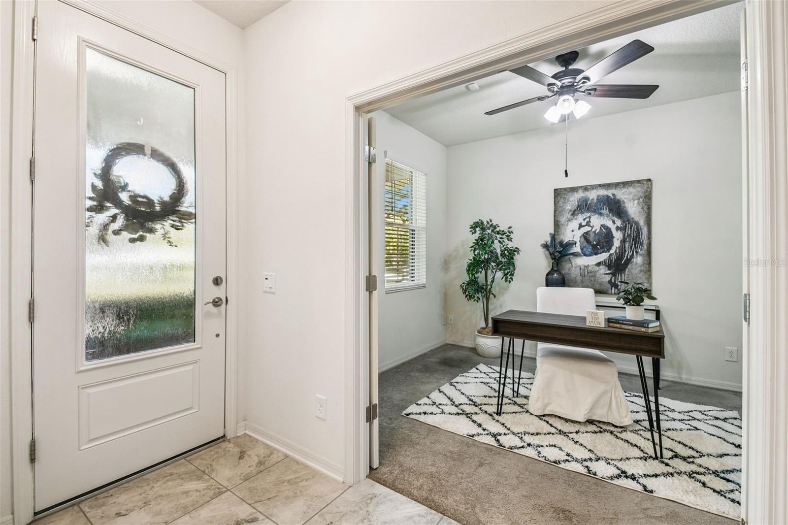 Wanting that small home town feel in Florida? Welcoming this STUNNING west facing Avalon by MI Homes with 3 bedrooms PLUS a dedicated office, 2 full bathrooms, a 2-car rear garage with over 1750 sq ft in the community of Starkey Ranch in Odessa, FL. Beautifully tucked away on a semi-private lot, this home is situated on a green space shared by only a lucky few. Single-story with a mediterranean exterior style, you will LOVE enjoying the spacious covered front porch. Once inside, take note of the open, modern, yet cozy feel of the home. Neutral tile flooring throughout the main area. To your left is room #1, this could be a bedroom (no closet), an office, a playroom, a craft room, whatever fits your needs. Has modern glass paned french doors. To your right, is room #2 and #3 with lots of natural light and privacy. A full bathroom with tub/shower combo is conveniently placed for both rooms. Come into the heart of the home and find yourself an open floor plan with a stunning kitchen. Dark espresso 42 inch cabinets with deluxe crown molding. Ample granite counter space, stainless steel appliances, and gas range. Center island for additional seating. The living room/kitchen concept makes it easy to converse and entertain. Large picturesque windows showcase a beautiful view of the surroundings. Tray ceiling details. Down the hallway is the primary retreat. Cozy and inviting with tall ceilings and an ensuite with tiled shower and glass doors. Walk-in closet. The laundry room is off the primary retreat tucked away by the garage entry door. Built-in cabinets provided even more storage. The screened-in lanai is perfect for reading a book, easy conversation with drinks, and adds to the useable living space. Faces east so it will not get overly hot during the day. Keep the doors open during the cooler months and don't worry about the bugs! The 2 car garage has the epoxy flooring and water softener. Full irrigation-reclaimed water. No neighbors on one side and a gorgeous green space right off of your front porch to enjoy. A-rated Starkey Ranch K-8 school is located within the community a short distance. Across the street, is Cunningham Lake which provides a trail around it to walk, bike, or run along with a multi-purpose space for all activities. Small playground as well. Starkey offers 3 community state-of-the-art pools, one with a spray park, TONS of green space, playgrounds, dog parks, a public library, tennis courts, basketball courts, a track, and Pasco county's district park for baseball, soccer and lacrosse. Gorgeous community landscaping with not only palm trees but northern trees; you can still enjoy the leaves during the fall. Wood fence encompasses the community for that "ranch" feel.