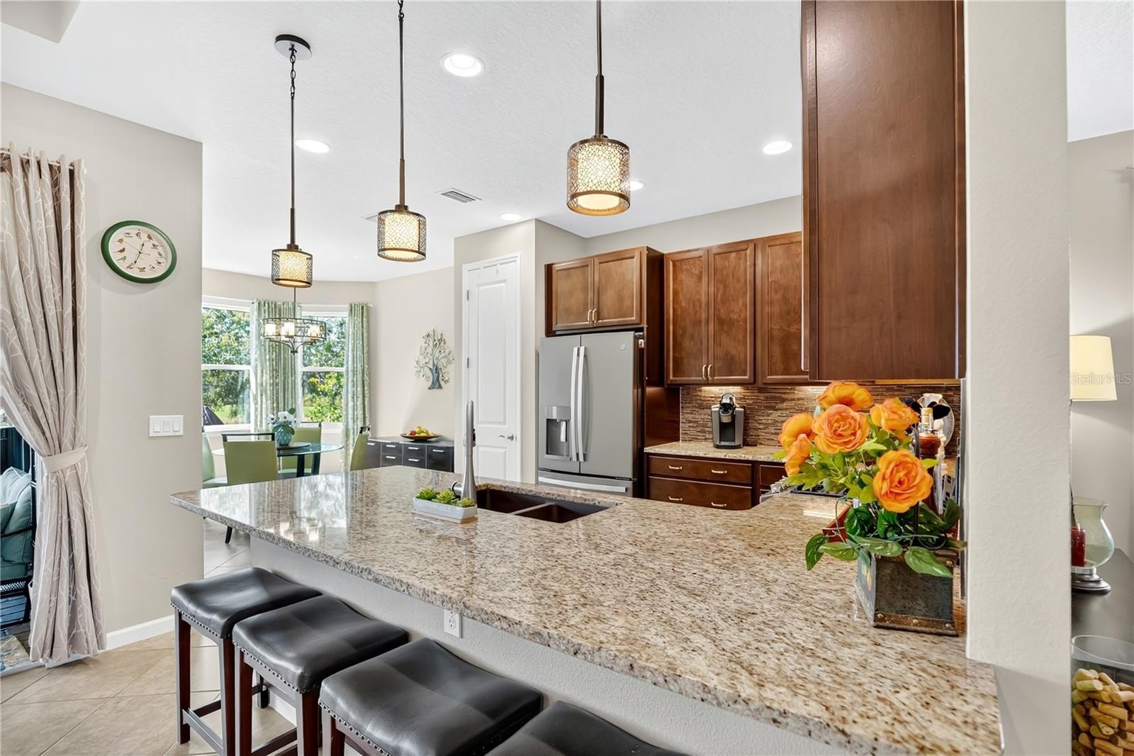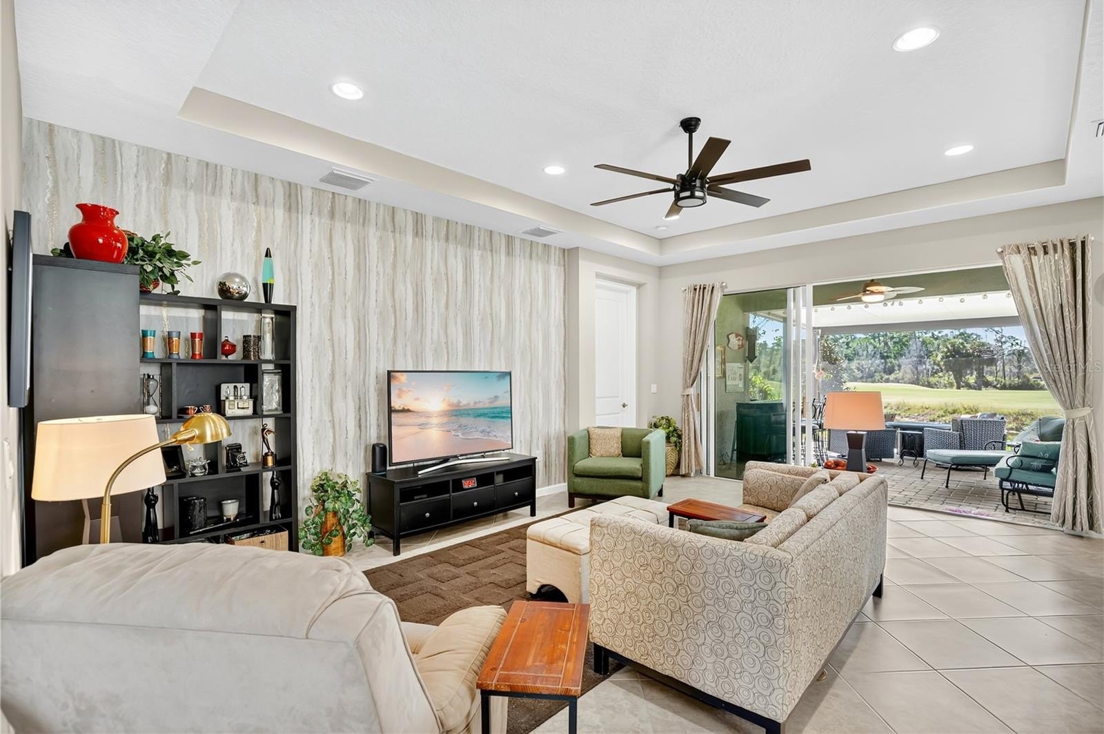 Sliding glass doors lead out to the recently added expansive 15’ x 22’ screened-in porch with roof and unobstructed views that overlook a small pond and panoramic golf course views. Included are a wall-mounted TV and a bar with 4 bar stools. The 9,235 square feet lot provides a peaceful outdoor retreat.