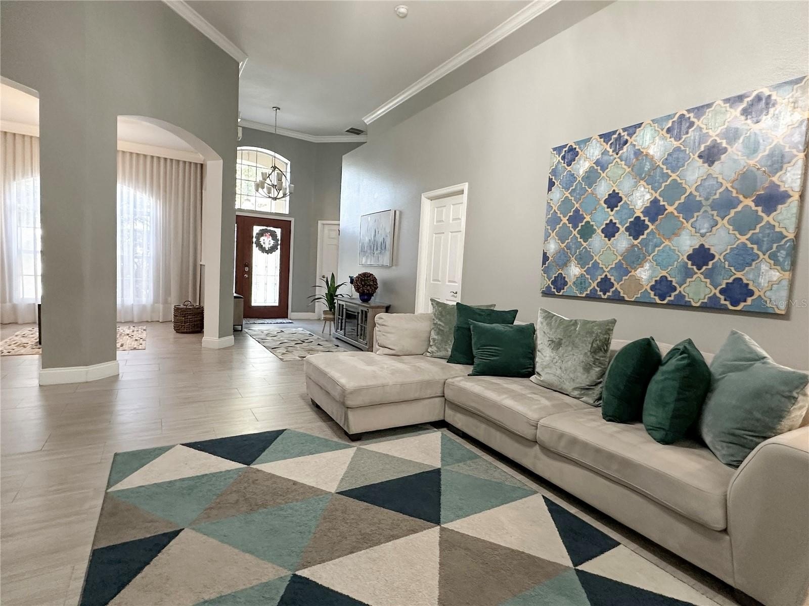 Welcome to your dream retreat—an elegant 4-bedroom, 2-bath residence nestled within this sought after 24-hour guard-gated golf community. This thoughtfully designed home blends luxury, comfort, and style, offering an atmosphere that feels both refined and warmly inviting. Step inside to discover a bright, open floor plan enhanced by high ceilings, graceful architectural details, and expansive windows that bathe every room in natural light. The spacious living area flows effortlessly into a modern kitchen, with bright finishes and updated appliances and updated chandeliers—perfect for everyday living and entertaining alike. A dedicated office provides the ideal setting for productivity and quiet focus, while the bedrooms ensure restful nights with all custom closet designs, room darkening shades and plenty of space for family or guests. The primary suite serves as a tranquil haven, with walk-in dual closets complete with a well-appointed ensuite bath that exudes spa-like serenity. In the back of the home you will find a spacious private covered lanai that invites you to unwind and enjoy peaceful views, creating the perfect setting for morning coffee, evening relaxation, or outdoor dining. Surrounded by private fence, dining and relaxing areas with lush landscaping, this home offers a lifestyle defined by leisure, elegance, and security. Experience refined living at its finest—where resort-style amenities and the beauty of Florida's golf-course surroundings come together in perfect harmony. You will enjoy an Jr. olympic size community pool, state of-the-art FITNESS center, Pickleball, basketball and tennis courts, playground and fishing pier. The home has newer Roof 2023, AC 2019, Water Heater 2020 and fresh Exterior paint 2024. Conveniently located within minutes of fabulous shopping, dining, hospitals and medical facilities and major roadways. TESLA CHARGER IN GARAGE DOES NOT CONVEY.