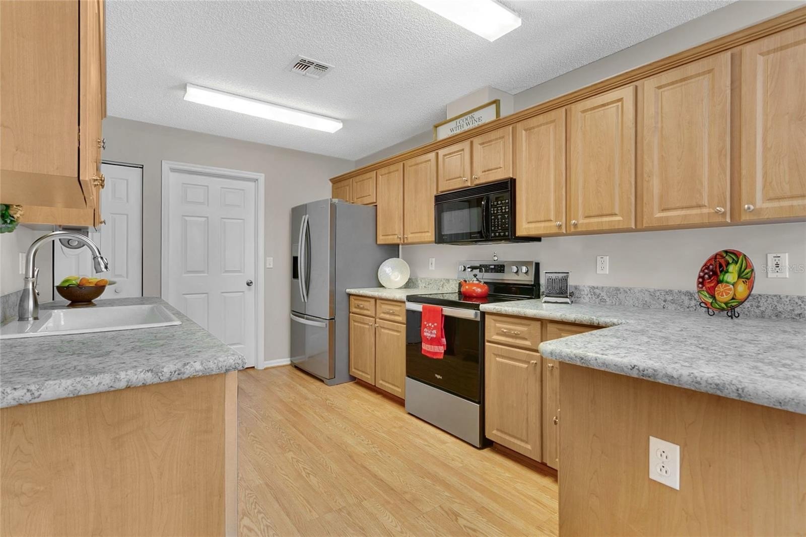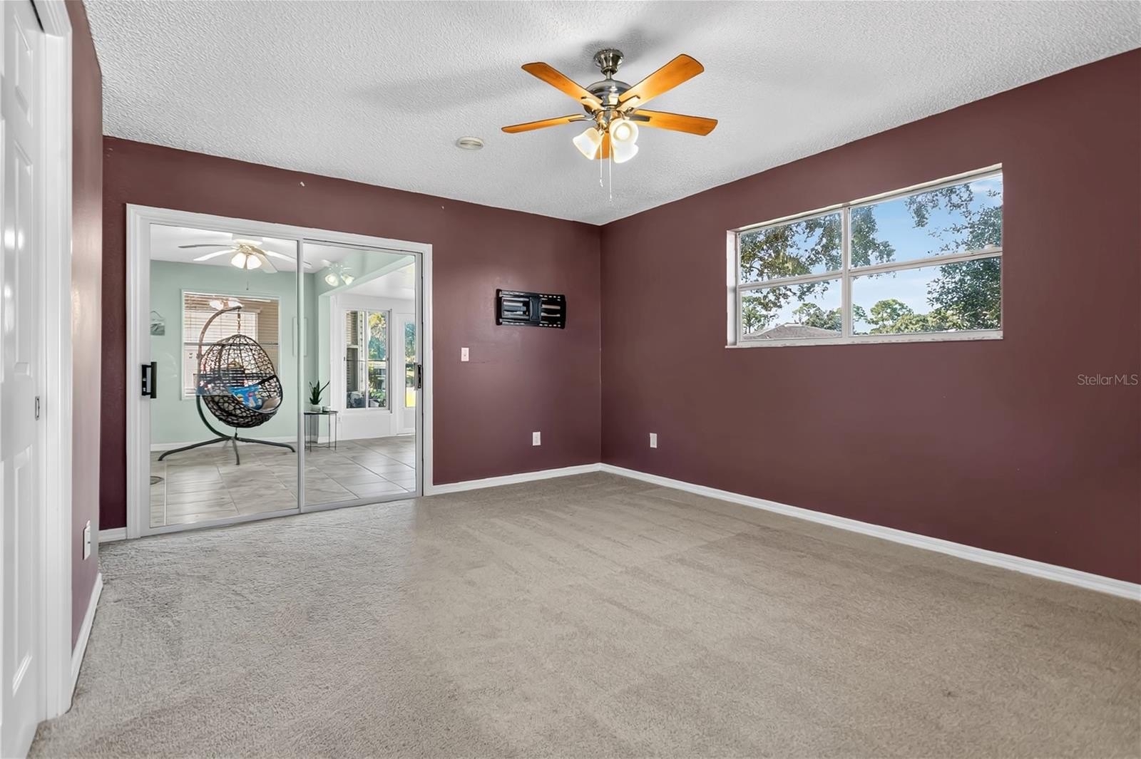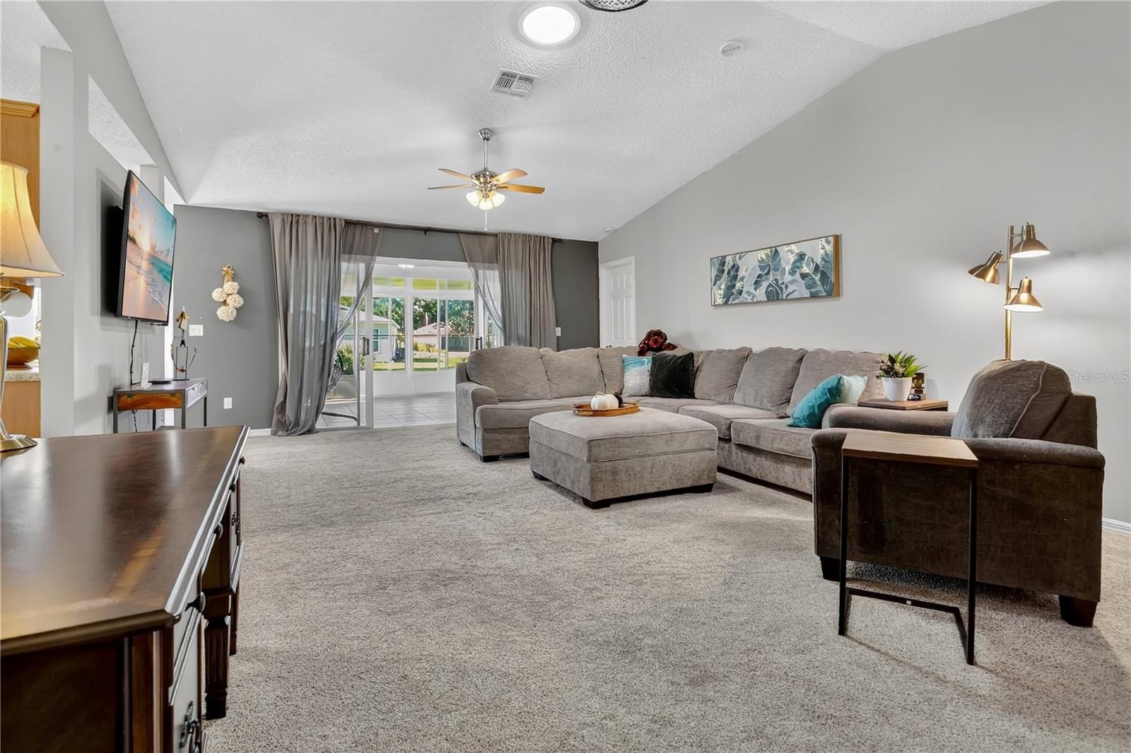 Step inside to a bright, open living area featuring a tube light that fills the space with natural sunlight and sliding glass doors leading to the outdoor area—also accessible from the primary bedroom. The laundry room boasts lots of cabinet storage and a wash sink, making daily tasks easy and organized. One of the standout features is the extra-spacious garage, complete with plenty of storage and perfect for Florida-style commuting.
