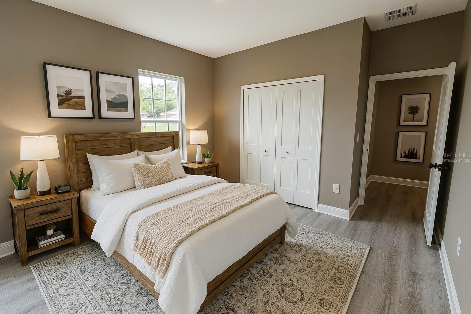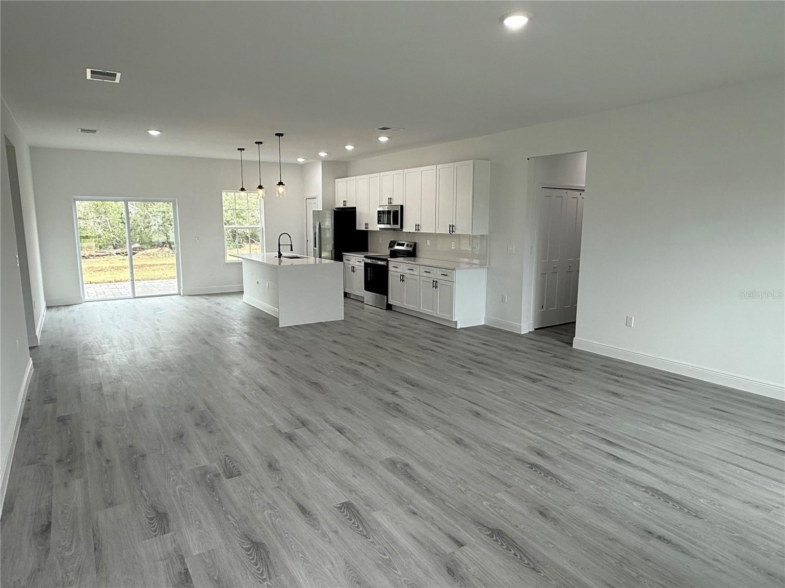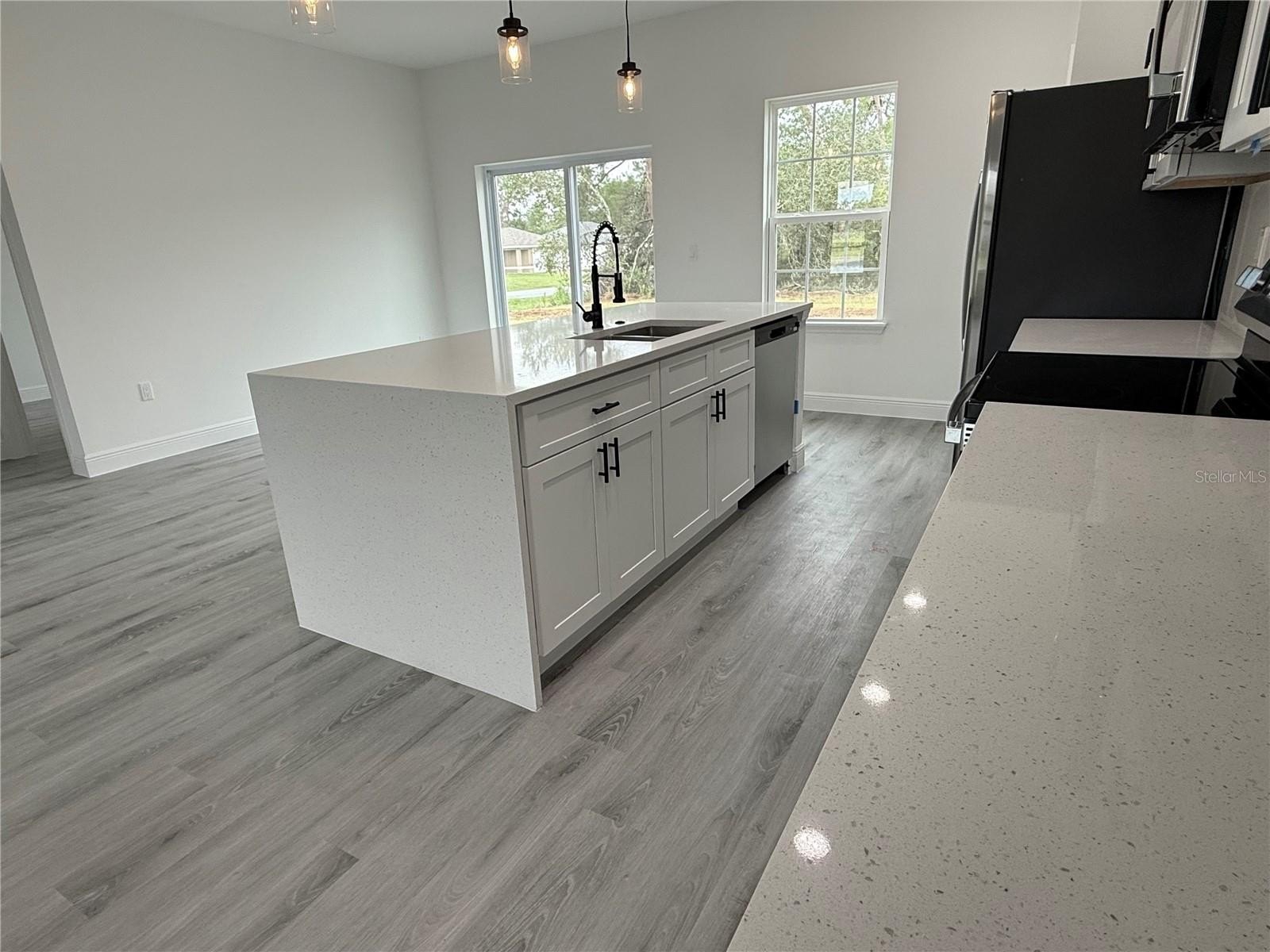 One or more photo(s) has been virtually staged. OVERSIZED CORNER UNIT! No HOA Fee! No CDD Fee! Located on a calm street, 2 minutes from DG Market, and 5 minutes from Walgreens! Discover your brand-new dream home in beautiful Ocala! PAVED DRIVEWAY AND BACK PORCH! This modern 4-bedroom, 2-bathroom residence boasts 1,774 sqft of comfortable living within a welcoming community. Step inside to an inviting open-concept design, perfect for entertaining. The stunning kitchen features sleek 42-inch cabinets, elegant quartz countertops, a spacious island with pendant lighting, and convenient closet pantry. A full suite of stainless steel appliances—stove, refrigerator, garbage disposal, dishwasher, and microwave—completesthis culinary haven. Sliding glass doors open to the backyard, extending your living space. Enjoy the seamless beauty of luxury vinyl flooringthroughout—no carpet anywhere! Additional highlights include a dedicated laundry room with hookups and a spacious 2-car garage. Conveniently located minutes from parks, schools, and shopping, this home offers the perfect blend of comfort and convenience. Don't miss this exceptional opportunity! Schedule your private showing today.
