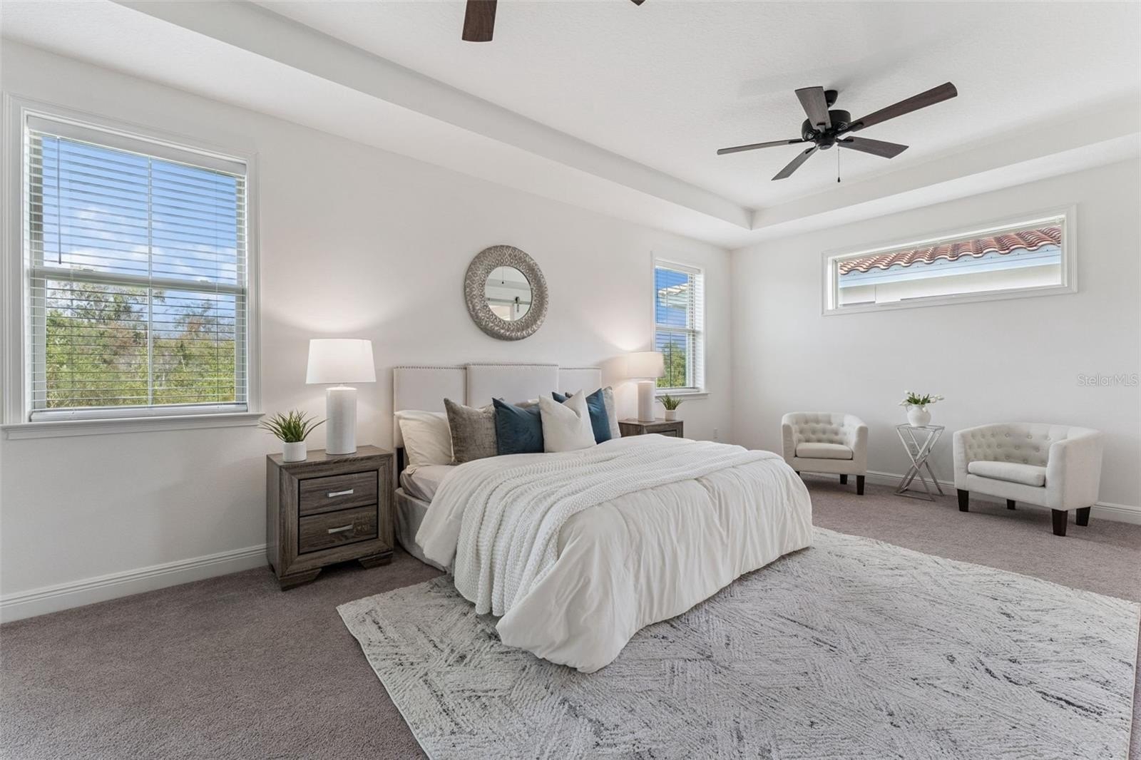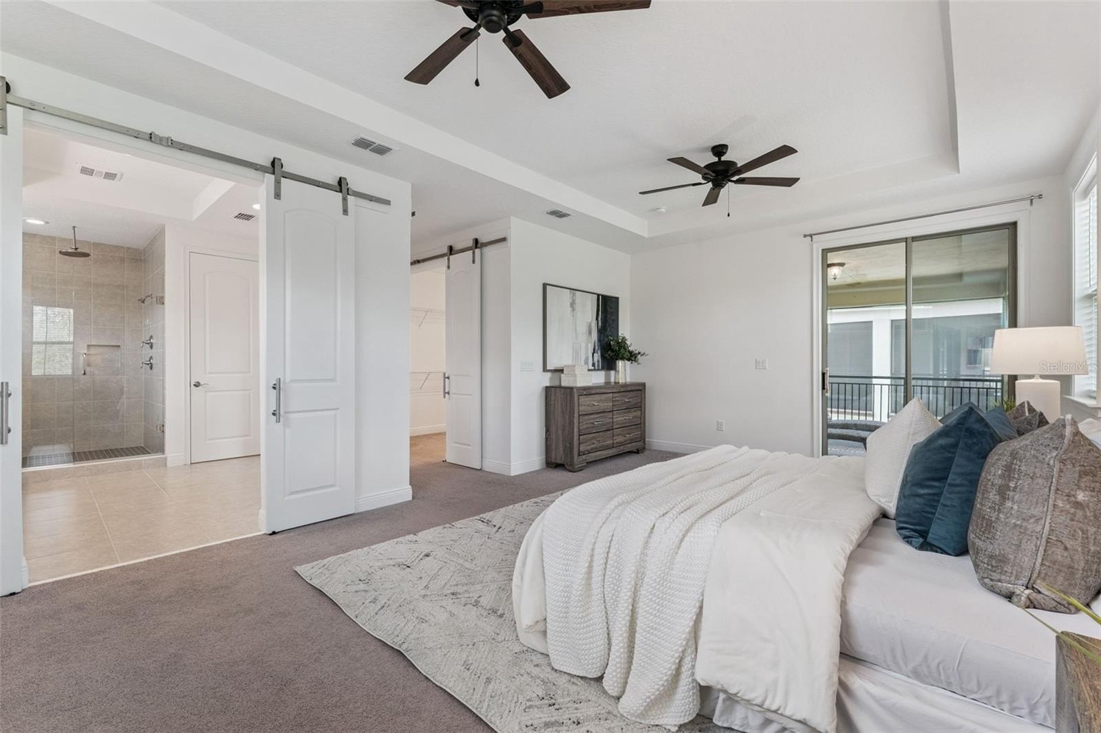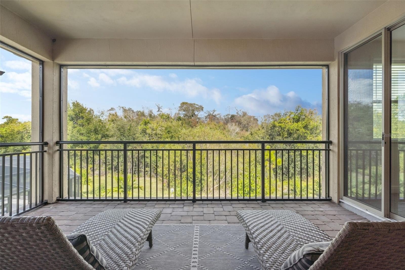 Venture upstairs to discover a versatile loft area, perfect for a media room, play zone, or an additional living space. The primary suite is a true retreat, showcasing a spa-style ensuite bathroom complete with dual vanities, a luxurious walk-in shower equipped with modern fixtures, and an impressive walk-in closet that provides ample storage. Sliding glass doors lead to a large screened balcony, offering tranquil wooded conservation views that enhance your privacy. This balcony is conveniently shared with the third bedroom, which would also make an ideal home office with its quiet ambiance.