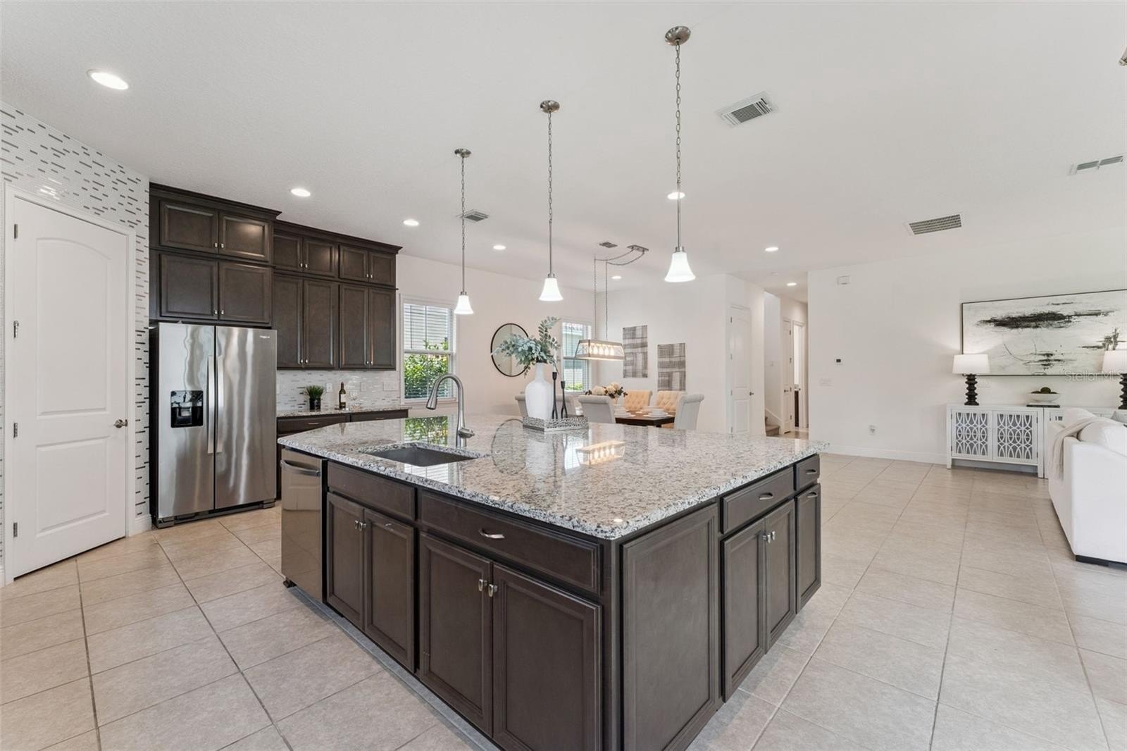 As you enter, you are greeted by high ceilings and an abundance of natural light that flows throughout the thoughtfully planned open-concept layout. This design harmoniously connects the welcoming foyer with the expansive living room, elegant dining area, and gourmet kitchen, making it perfect for both daily family life and entertaining guests. The chef’s kitchen is a dream, featuring state-of-the-art premium stainless steel appliances, stunning granite countertops, and a large central island with seating, ideal for culinary adventures and social gatherings.