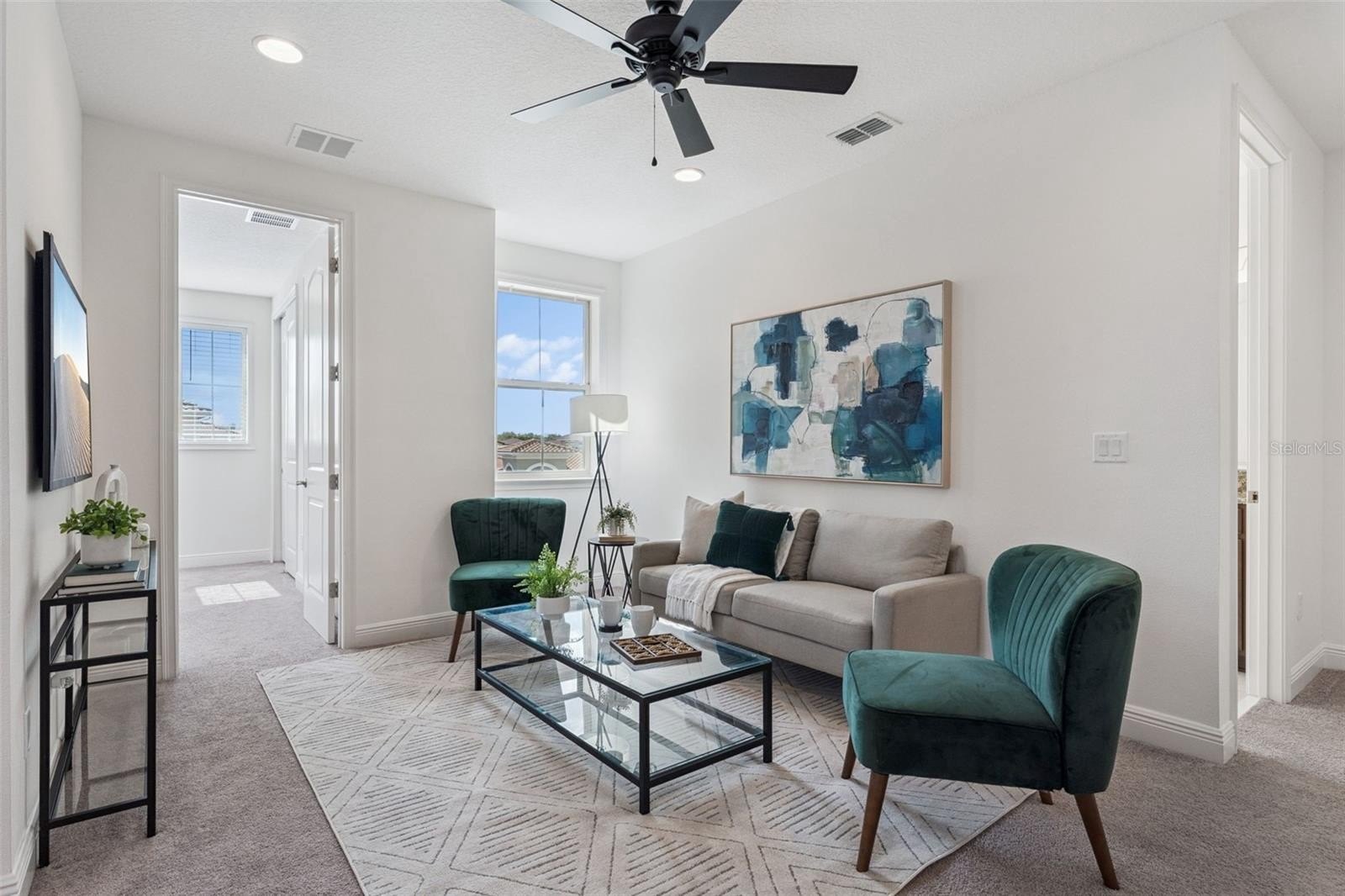 The fourth sizeable bedroom features ample closet space, its own private balcony, and shares access to a split full bathroom. The fifth bedroom, located off the loft area, includes a private ensuite bathroom, adding an extra level of comfort for guests.
