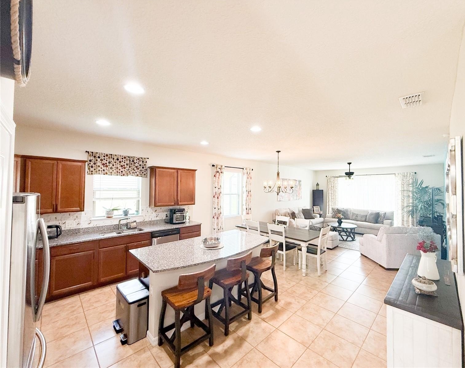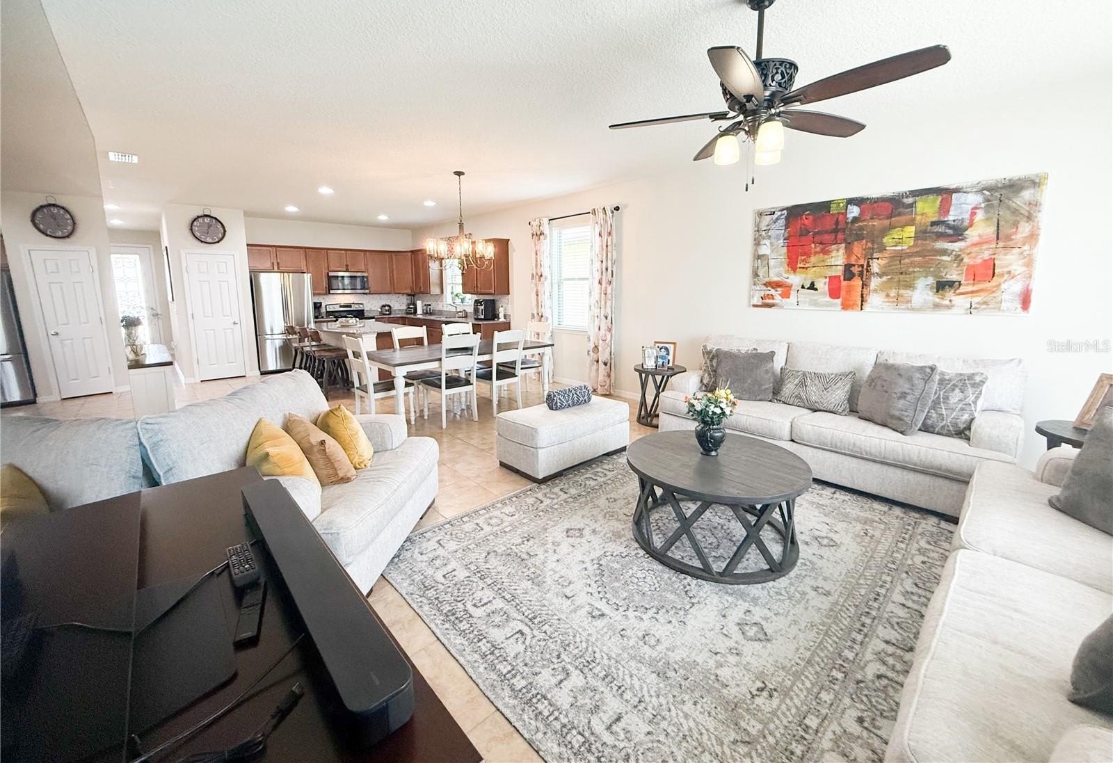 As you walk in, you are greeted by a bright and inviting living space where the living room, dining area, and kitchen flow seamlessly together, creating the perfect setting for family gatherings and entertaining friends. The kitchen offers a central hub of the home, ideal for cooking and socializing at the same time.