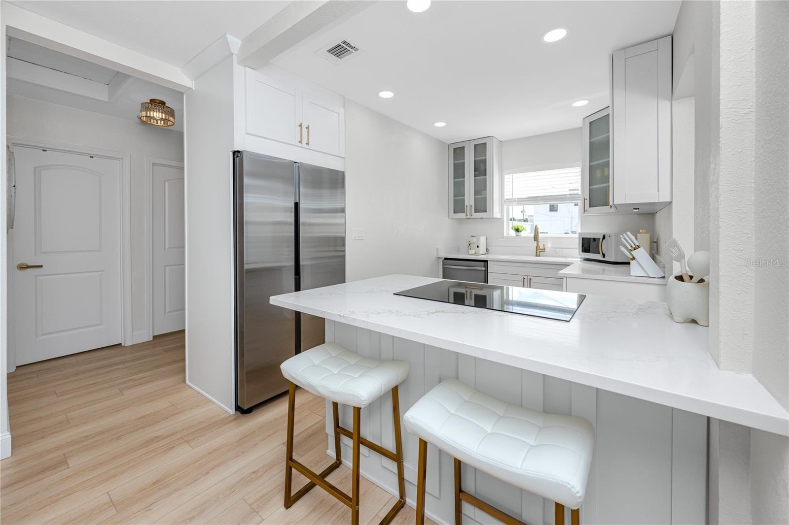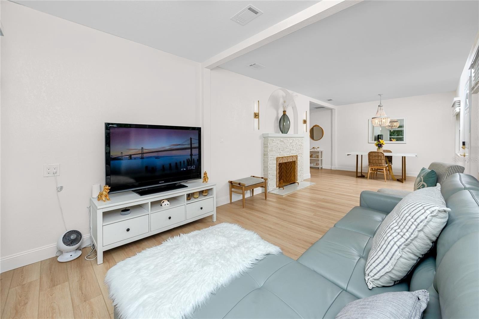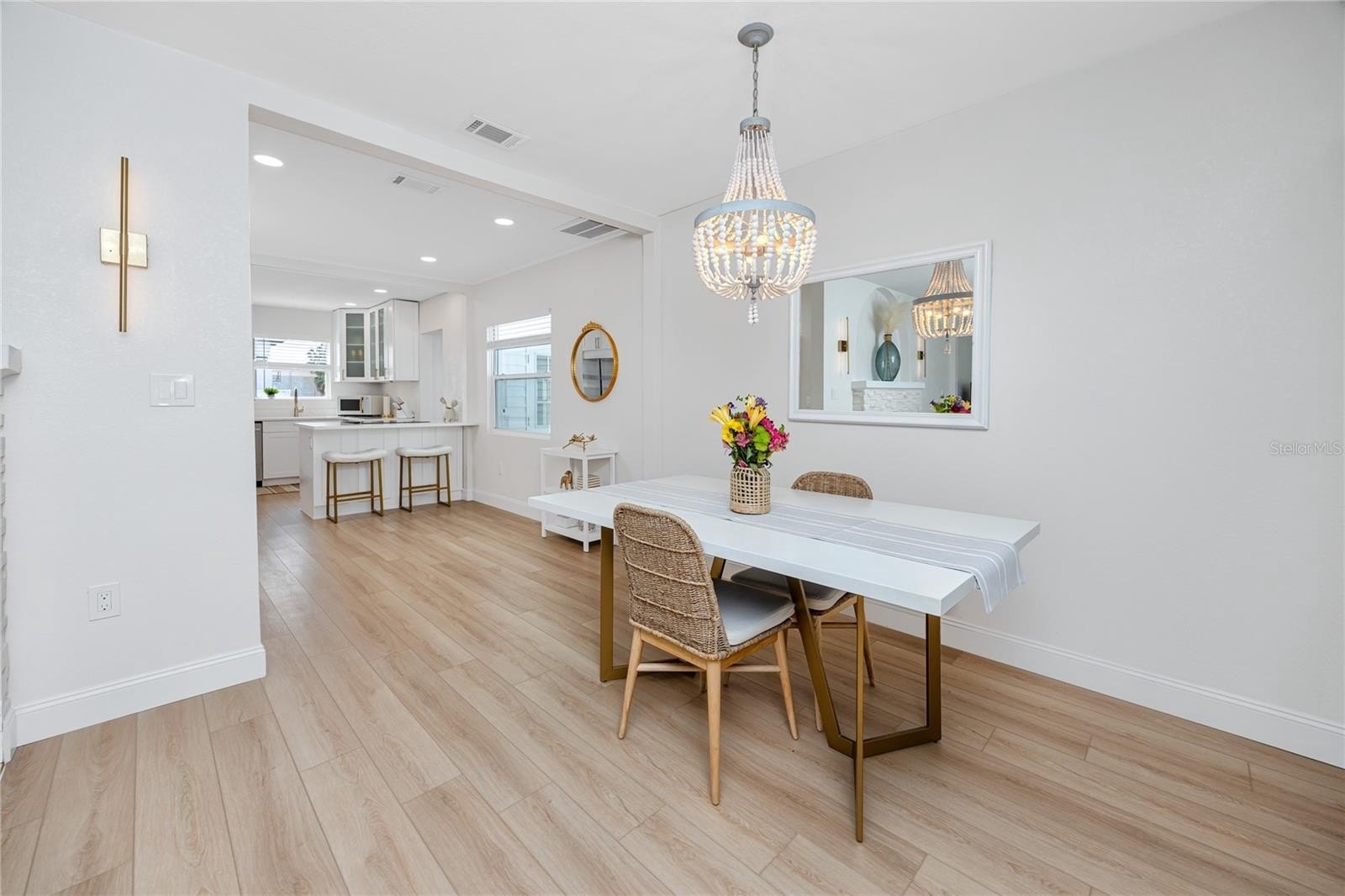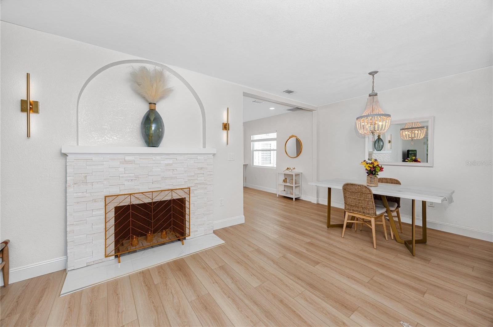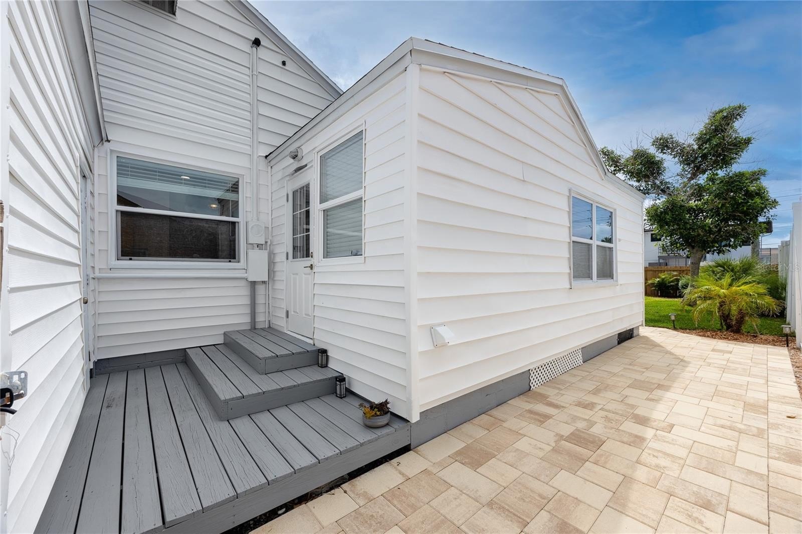 Better than new this beautifully renovated single-family home offers new electrical, plumbing, insulation, roof (2023), hurricane-rated windows, and luxury vinyl plank flooring. The open-concept floor plan features a bright living area with a modern stone fireplace and a coastal vibe. The kitchen stands out with quartz countertops, upgraded white cabinetry, a built-in oven, glass cooktop range, and a large island with breakfast bar seating. The rear bedrooms provide flexible options for today’s needs. One includes a barn door closet and private slider to the backyard, while the second can easily convert into a private-entry guest suite—ideal for multigenerational living, long-term guests, or rental potential. Both bathrooms feature fully updated tiled showers and modern vanities. Outdoor living is just as impressive, with a newly installed brick paver patio, landscaped private fenced yard, outdoor shower, and plenty of space to add a pool. The elevated HVAC condenser and built-in garage storage—perfect for bikes, paddleboards, or kayaks—add both functionality and peace of mind.