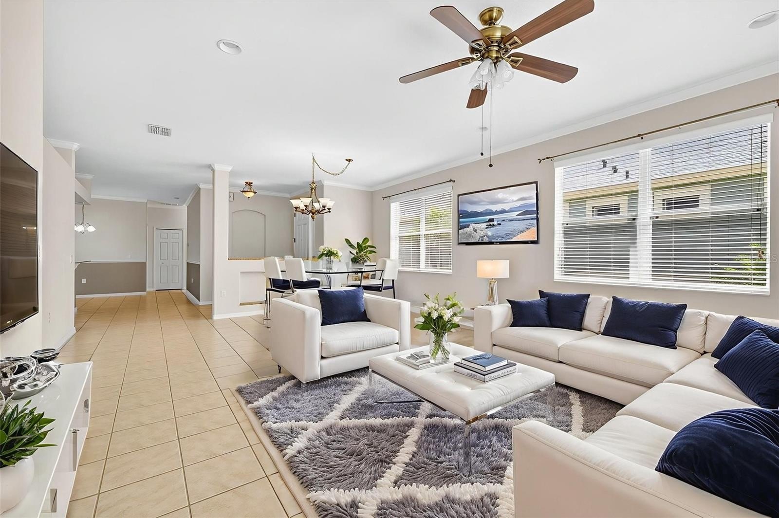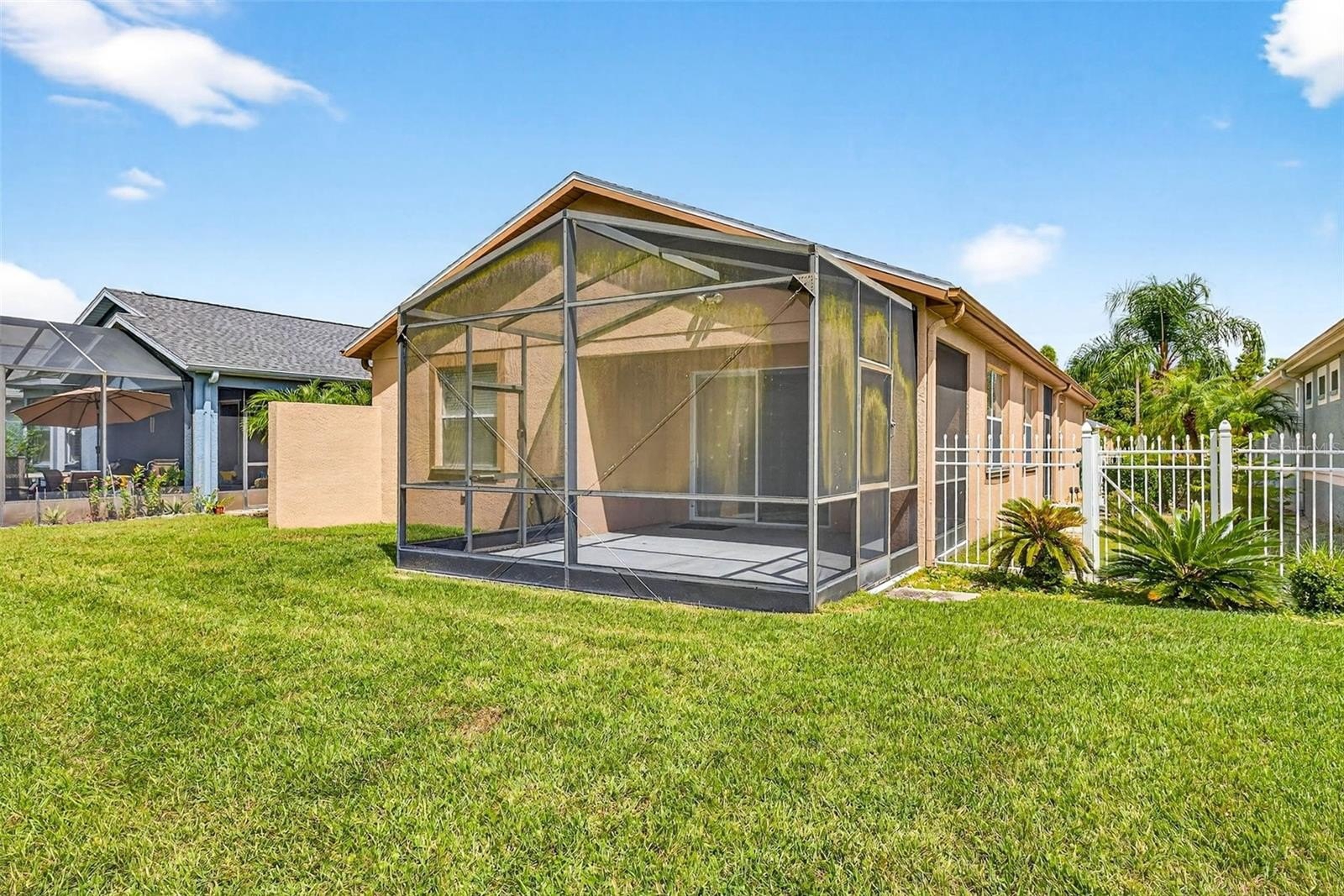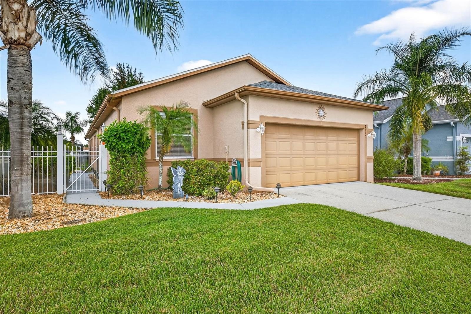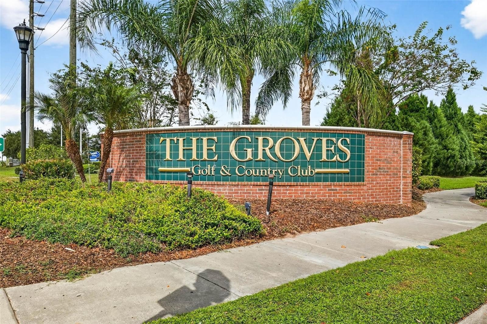 One or more photo(s) has been virtually staged. Welcome to this beautifully maintained, light-filled home in The Groves! This 3-bedroom, 2-bath residence features a spacious open floor plan with a living/dining area, large kitchen with eat-in space, and a screened lanai that extends your living outdoors. The primary bedroom offers serene conservation views, an en-suite bath with dual sinks and walk-in shower, plus an oversized walk-in closet. Highlights include quartz countertops, stainless appliances, indoor laundry, two-car garage with storage, a 2024 range, 2025 water heater, 2019 roof, ceiling fans in all bedrooms, tile flooring in main areas, and vinyl plank in bedrooms. The split-bedroom design ensures privacy for you and your guests. Situated on a quiet cul-de-sac with no through traffic. Homes can be leased for a minimum of 30 days, up to 4 times per year. HOA will begin painting home exteriors January 2026 - New owner can CHOOSE PAINT COLOR! The Groves is a premier gated 55+ golf course community with resort-style amenities: clubhouse, heated pool and spa, fitness center, restaurant and bar, 18-hole golf course with pro shop, plus tennis, pickleball, bocce, shuffleboard, and a dog park. Shops and restaurants are nearby—Publix is just a golf cart ride away. Call today to tour and start enjoying the best of Florida living!
