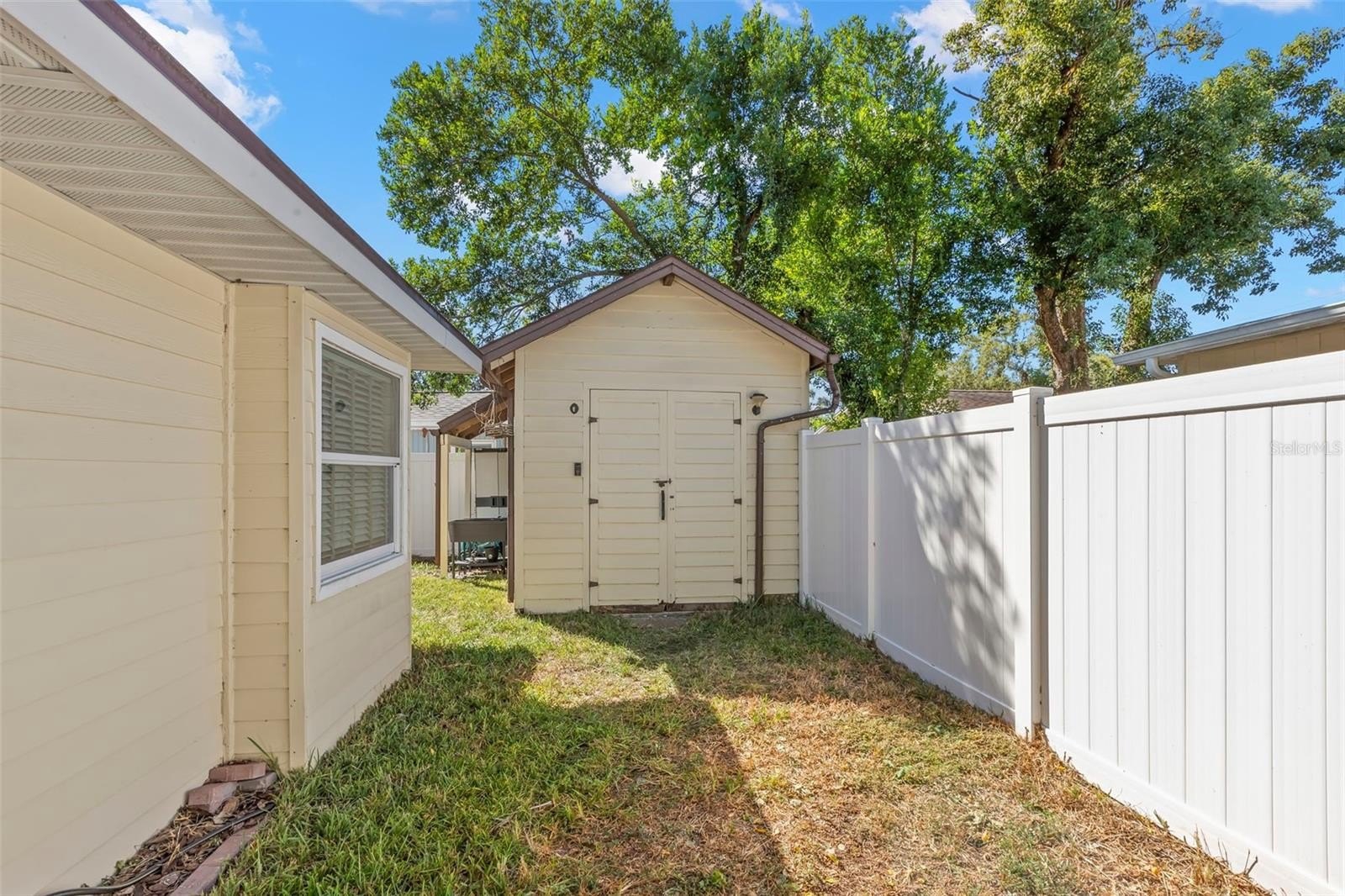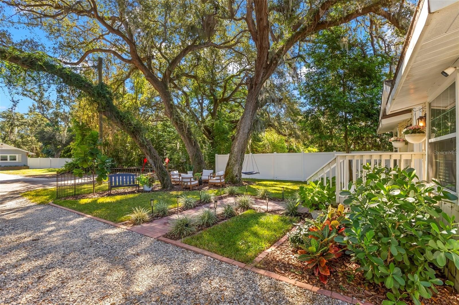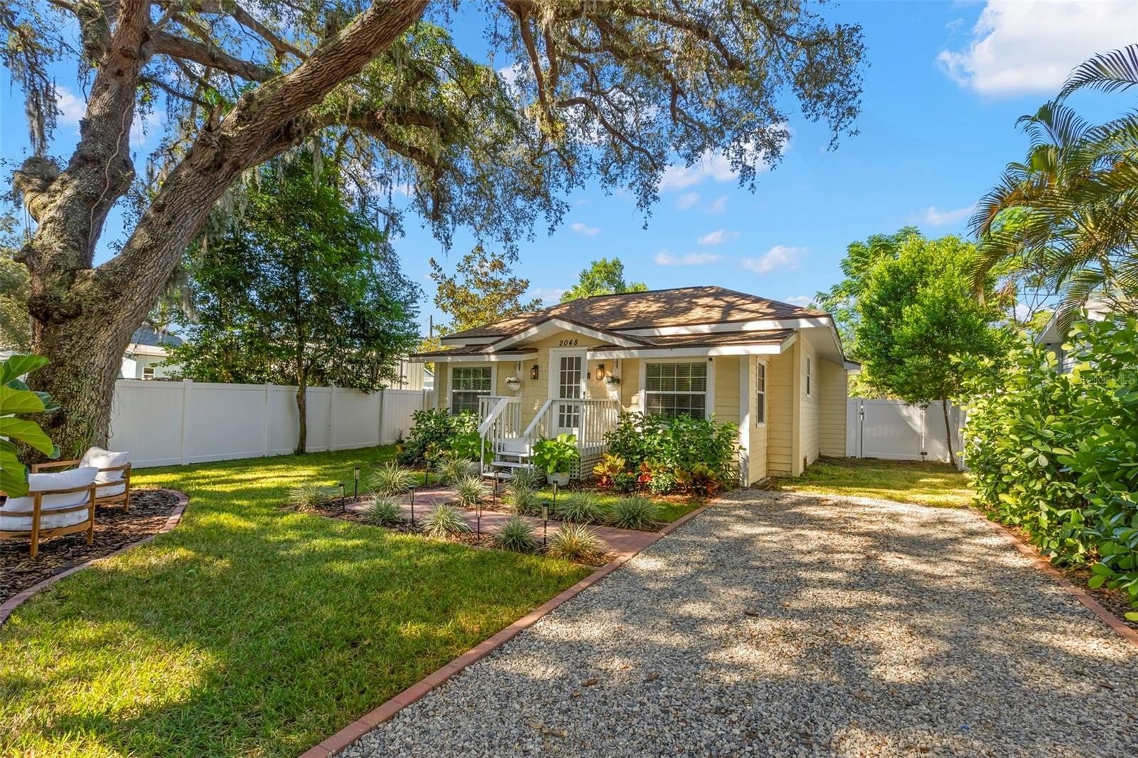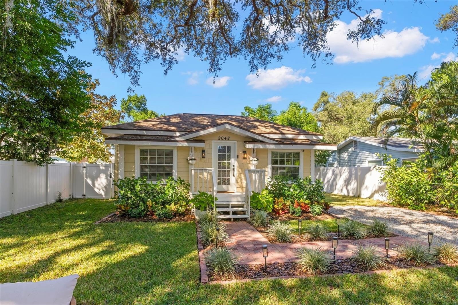 NO HOA AND NON-FLOOD ZONE! HUGE STORAGE SHED INCLUDED! LOCATED ONE BLOCK FROM DUNEDIN and only 5 MINUTES TO VIBRANT DOWNTOWN DUNEDIN, this FULLY UPGRADED 3-bedroom / 2-bath 1930's BUNGALOW perfectly blends HISTORIC CHARM with modern comforts. Tucked quietly at the end of the street, this home’s curb appeal shines with a BRICK PAVERED WALKWAY accented by landscape lighting, and a spacious front yard with classic wrought-iron fence separating the front yard from the street. Mature shade trees with vines create a storybook setting with room for outdoor seating and even a tree swing. A welcoming front porch and decorative glass front door set the tone. Inside, an inviting OPEN FLOOR PLAN filled with warmth and character showcases gorgeous TEXTURED WIDE-PLANK LAMINATE WOOD FLOORING throughout the main living areas. Timeless WOOD-TRIMMED WINDOW CASINGS on all windows add character and window blinds are installed throughout. The UPGRADED EAT-IN KITCHEN features MULTI-LEVEL WOOD CABINETRY, STAINLESS STEEL APPLIANCES and a pantry. The primary bedroom suite includes a BUILT-IN CLOSET SYSTEM with drawers and shelves and a modern EN SUITE BATH with a tiled step-in shower. Two additional bedrooms share a beautifully updated full bath with DECORATIVE WAINSCOTING, a tub/shower combo, and linen storage. The 3rd bedroom stands out with CROWN MOLDING, WAINSCOTING and a COZY WINDOW BENCH making the perfect reading nook! EVERY CLOSET THROUGHOUT THE HOME HAS BEEN THOUGHTFULLY CUSTOMIZED WITH BUILT-IN SHELVING for maximum organization. The OVERSIZED INTERIOR LAUNDRY ROOM offers extra space that can EASILY DOUBLE AS AN OFFICE/DEN, extra storage or additional closet. Step outside to a VINYL FENCED PRIVATE BACKYARD OASIS partially XERISCAPED with LUSH LANDSCAPING, BRICK PAVERED WALKWAYS, wooden benches, planters, and a huge detached storage shed with tall ceilings — perfect for bikes, tools, hobbies, or recreational gear. ADDITIONAL UPGRADES INCLUDE: NEW VINYL FENCE (2024), NEWER DOUBLE PANE WINDOWS, NEWER HVAC & ALL NEW DUCTWORK (2020), NEW TANKLESS WATER HEATER, NEW STAINLESS DISHWASHER & FRIDGE (2023), CUSTOM BUILT SHELVES IN GUEST BEDROOM CLOSETS, LINEN CLOSETS AND PANTRY, NEW SUBFLOOR IN PRIMARY SUITE, NEW TOILETS IN BATHROOMS, RESEALED TUB IN GUEST BATH, SIX-PANEL INTERIOR DOORS THROUGHOUT, RECESSED LIGHTING, WINDOW BLINDS THROUGHOUT, NEW PLUSH CARPETS IN BEDROOMS, NEW TILE FLOOR IN LAUNDRY ROOM and ROOF ONLY 6 YEARS OLD (2019)! TRANSFERRABLE TERMITE BOND WITH TERMINIX INCLUDED! Enjoy the Florida lifestyle JUST A COUPLE MINUTES FROM THE PINELLAS TRAIL and the WATERFRONT EDGEWATER DRIVE for DOLPHIN WATCHING and BREATHTAKING SUNSETS! 5 MINUTES TO DOWNTOWN DUNEDIN to enjoy SHOPS, RESTAURANTS and EVENTS! 15 MINUTES TO THE BEAUTIFUL GULF BEACHES OF HONEYMOON ISLAND AND CLEARWATER BEACH! This home checks every box — location, charm, upgrades, and outdoor living — all wrapped in the heart of Dunedin’s coastal community. Welcome home!