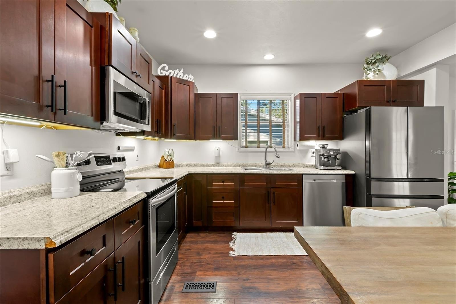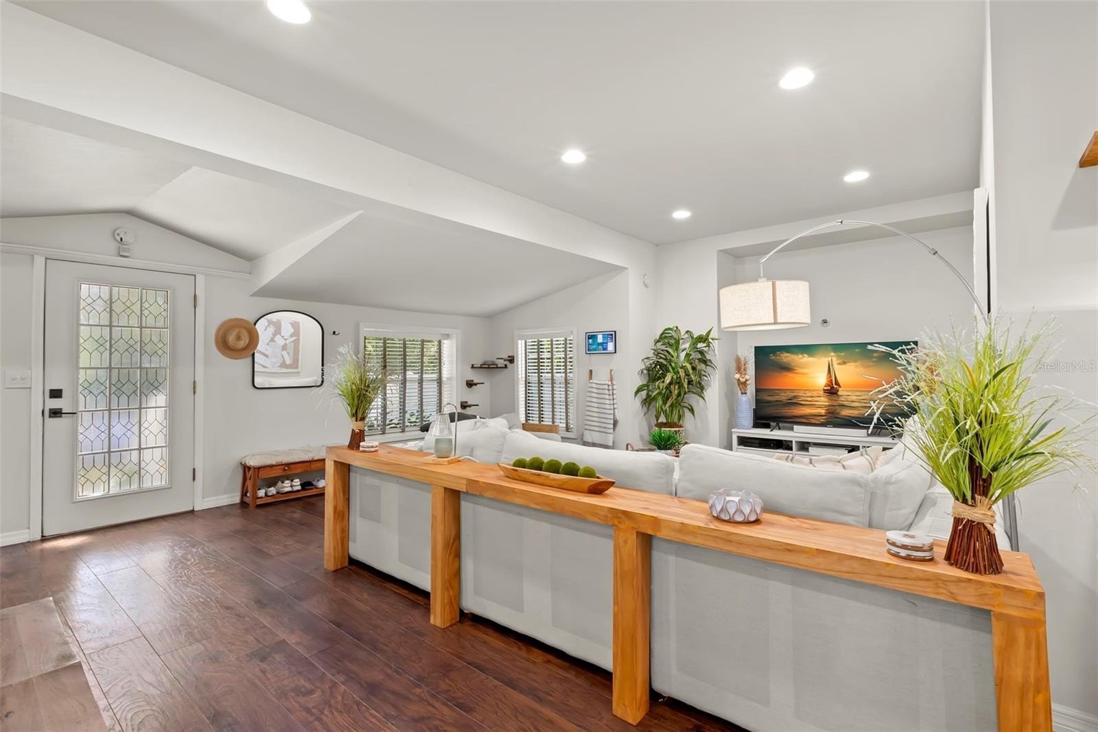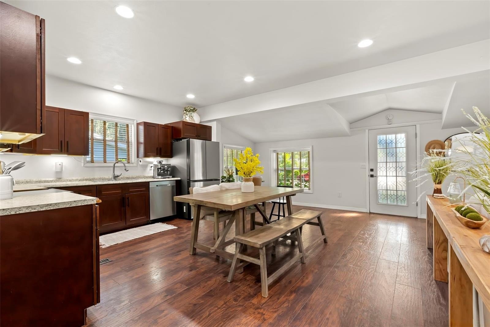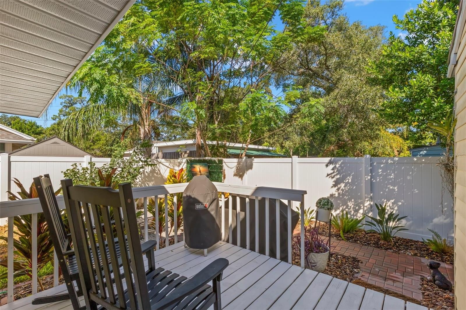 NO HOA AND NON-FLOOD ZONE! HUGE STORAGE SHED INCLUDED! LOCATED ONE BLOCK FROM DUNEDIN and only 5 MINUTES TO VIBRANT DOWNTOWN DUNEDIN, this FULLY UPGRADED 3-bedroom / 2-bath 1930's BUNGALOW perfectly blends HISTORIC CHARM with modern comforts. Tucked quietly at the end of the street, this home’s curb appeal shines with a BRICK PAVERED WALKWAY accented by landscape lighting, and a spacious front yard with classic wrought-iron fence separating the front yard from the street. Mature shade trees with vines create a storybook setting with room for outdoor seating and even a tree swing. A welcoming front porch and decorative glass front door set the tone. Inside, an inviting OPEN FLOOR PLAN filled with warmth and character showcases gorgeous TEXTURED WIDE-PLANK LAMINATE WOOD FLOORING throughout the main living areas. Timeless WOOD-TRIMMED WINDOW CASINGS on all windows add character and window blinds are installed throughout. The UPGRADED EAT-IN KITCHEN features MULTI-LEVEL WOOD CABINETRY, STAINLESS STEEL APPLIANCES and a pantry. The primary bedroom suite includes a BUILT-IN CLOSET SYSTEM with drawers and shelves and a modern EN SUITE BATH with a tiled step-in shower. Two additional bedrooms share a beautifully updated full bath with DECORATIVE WAINSCOTING, a tub/shower combo, and linen storage. The 3rd bedroom stands out with CROWN MOLDING, WAINSCOTING and a COZY WINDOW BENCH making the perfect reading nook! EVERY CLOSET THROUGHOUT THE HOME HAS BEEN THOUGHTFULLY CUSTOMIZED WITH BUILT-IN SHELVING for maximum organization. The OVERSIZED INTERIOR LAUNDRY ROOM offers extra space that can EASILY DOUBLE AS AN OFFICE/DEN, extra storage or additional closet. Step outside to a VINYL FENCED PRIVATE BACKYARD OASIS partially XERISCAPED with LUSH LANDSCAPING, BRICK PAVERED WALKWAYS, wooden benches, planters, and a huge detached storage shed with tall ceilings — perfect for bikes, tools, hobbies, or recreational gear. ADDITIONAL UPGRADES INCLUDE: NEW VINYL FENCE (2024), NEWER DOUBLE PANE WINDOWS, NEWER HVAC & ALL NEW DUCTWORK (2020), NEW TANKLESS WATER HEATER, NEW STAINLESS DISHWASHER & FRIDGE (2023), CUSTOM BUILT SHELVES IN GUEST BEDROOM CLOSETS, LINEN CLOSETS AND PANTRY, NEW SUBFLOOR IN PRIMARY SUITE, NEW TOILETS IN BATHROOMS, RESEALED TUB IN GUEST BATH, SIX-PANEL INTERIOR DOORS THROUGHOUT, RECESSED LIGHTING, WINDOW BLINDS THROUGHOUT, NEW PLUSH CARPETS IN BEDROOMS, NEW TILE FLOOR IN LAUNDRY ROOM and ROOF ONLY 6 YEARS OLD (2019)! TRANSFERRABLE TERMITE BOND WITH TERMINIX INCLUDED! Enjoy the Florida lifestyle JUST A COUPLE MINUTES FROM THE PINELLAS TRAIL and the WATERFRONT EDGEWATER DRIVE for DOLPHIN WATCHING and BREATHTAKING SUNSETS! 5 MINUTES TO DOWNTOWN DUNEDIN to enjoy SHOPS, RESTAURANTS and EVENTS! 15 MINUTES TO THE BEAUTIFUL GULF BEACHES OF HONEYMOON ISLAND AND CLEARWATER BEACH! This home checks every box — location, charm, upgrades, and outdoor living — all wrapped in the heart of Dunedin’s coastal community. Welcome home!