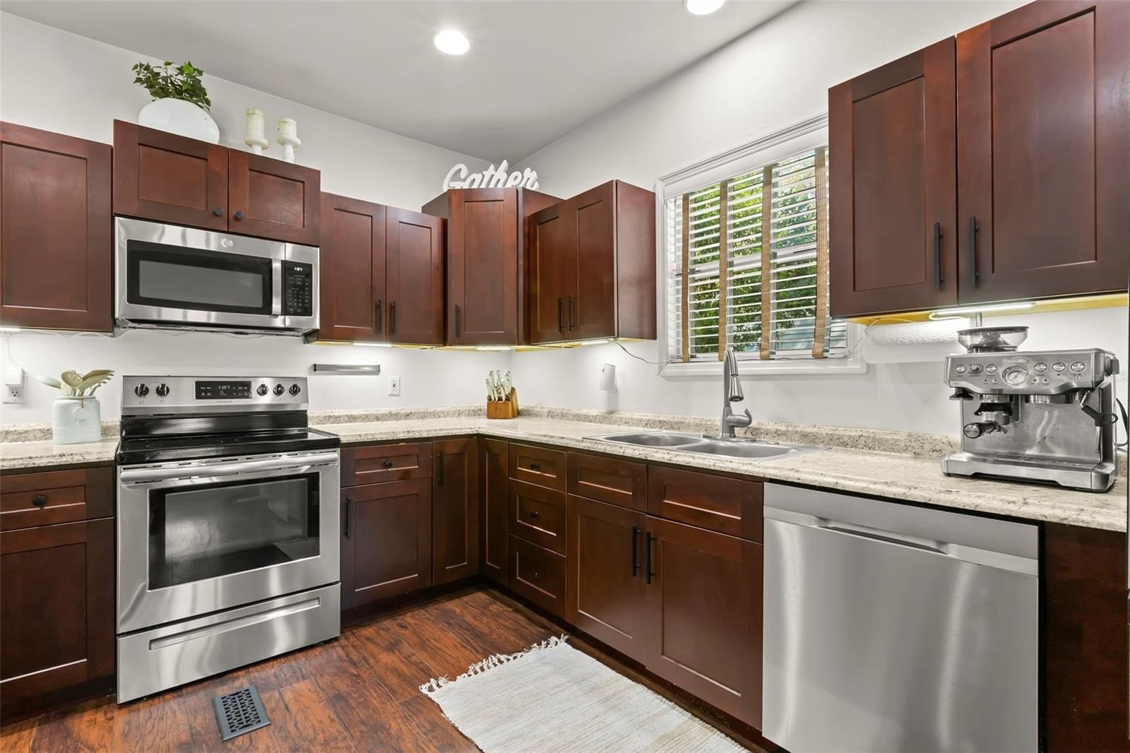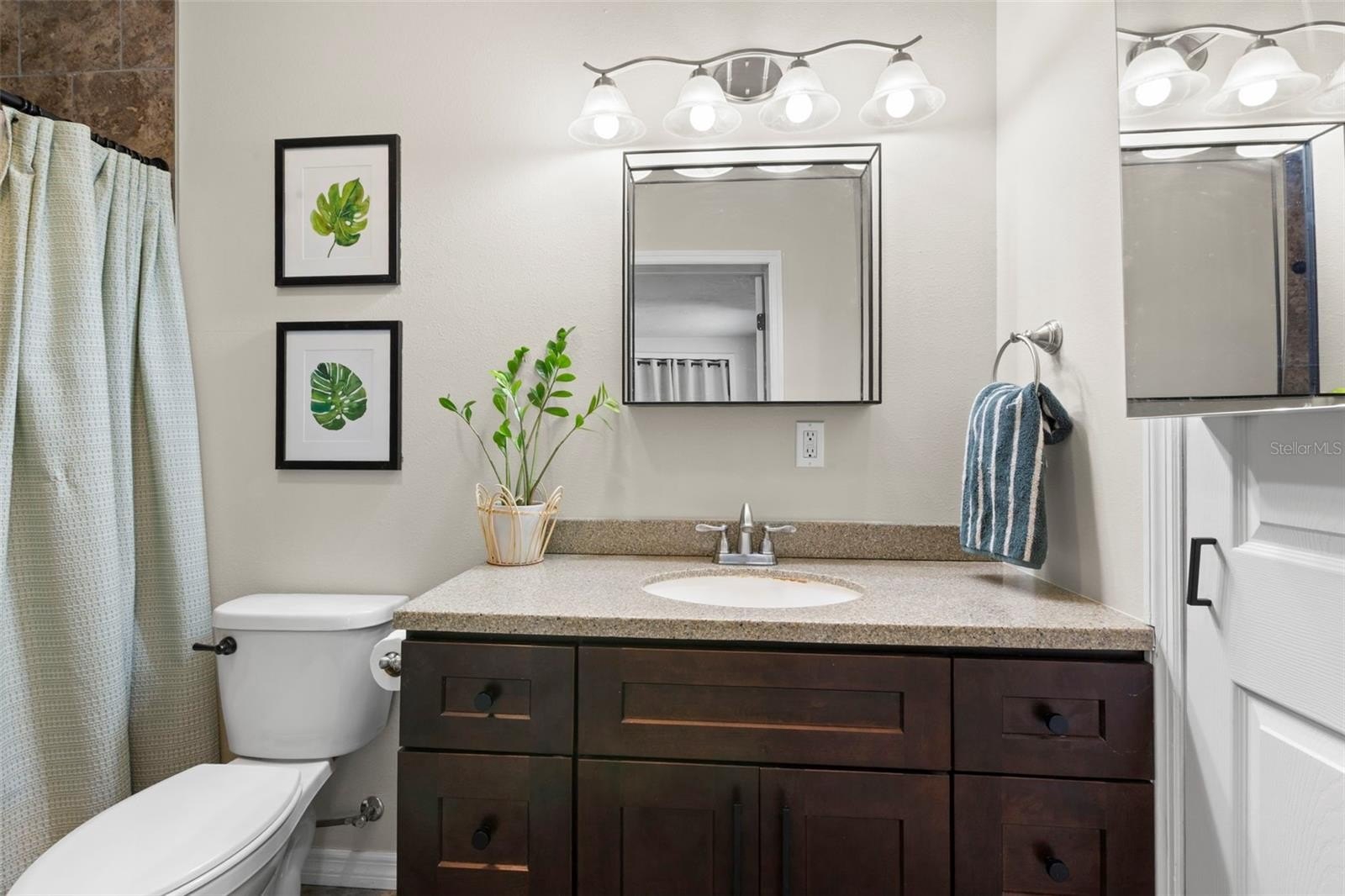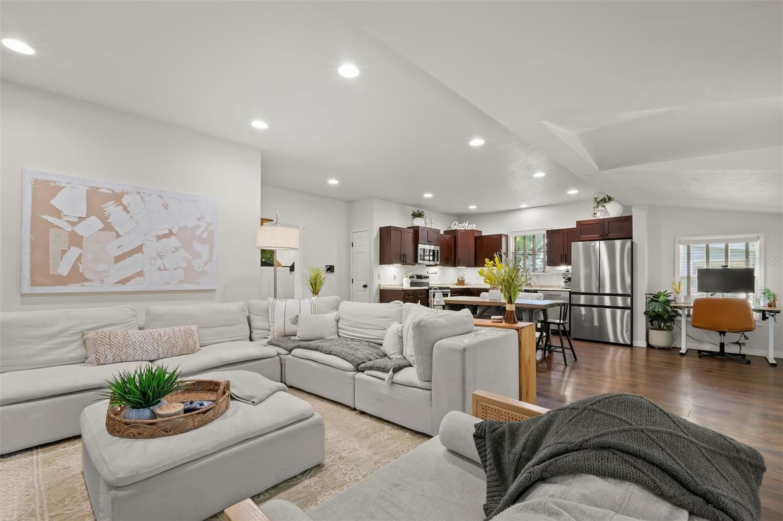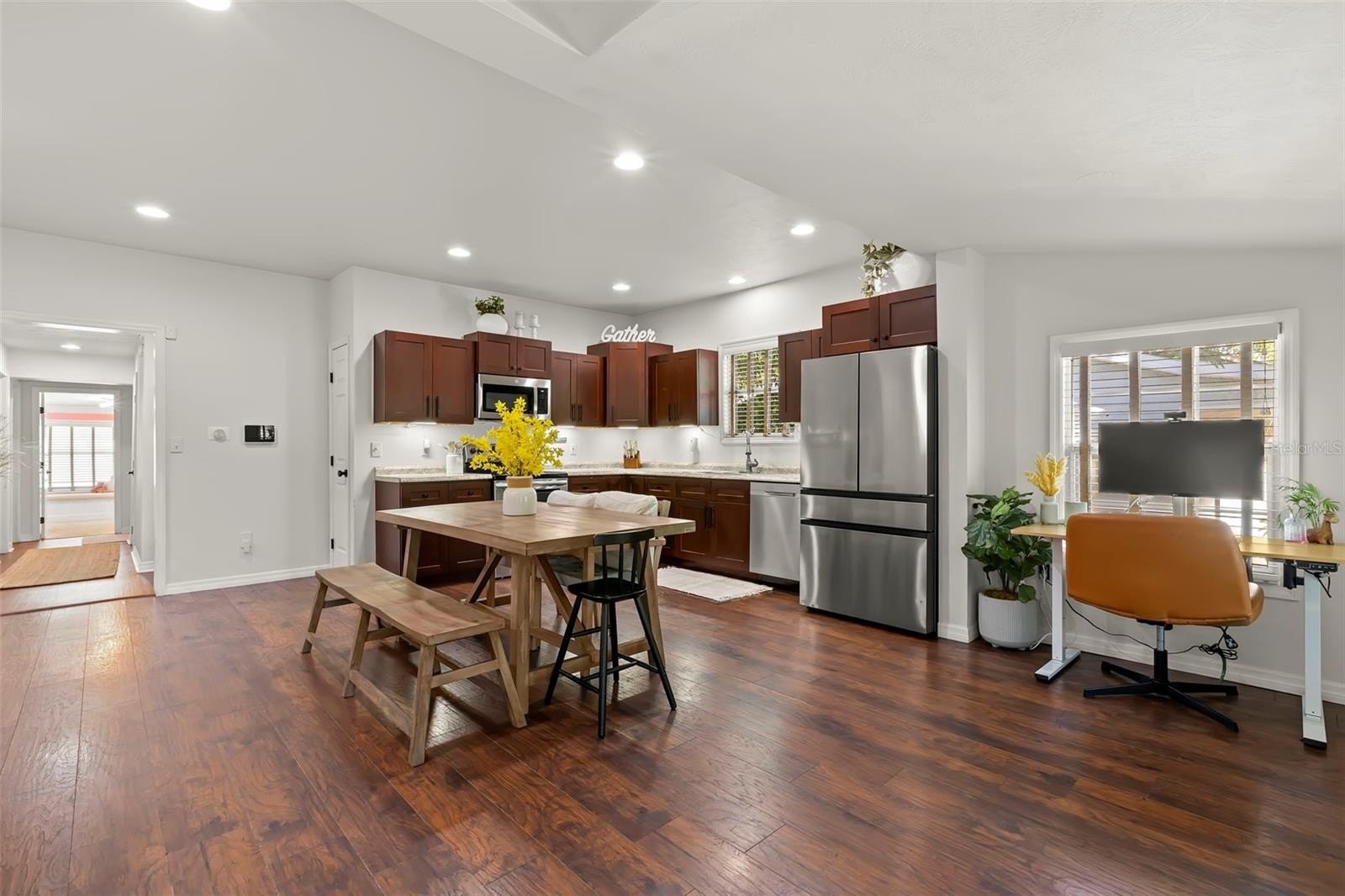 NO HOA AND NON-FLOOD ZONE! HUGE STORAGE SHED INCLUDED! LOCATED ONE BLOCK FROM DUNEDIN and only 5 MINUTES TO VIBRANT DOWNTOWN DUNEDIN, this FULLY UPGRADED 3-bedroom / 2-bath 1930's BUNGALOW perfectly blends HISTORIC CHARM with modern comforts. Tucked quietly at the end of the street, this home’s curb appeal shines with a BRICK PAVERED WALKWAY accented by landscape lighting, and a spacious front yard with classic wrought-iron fence separating the front yard from the street. Mature shade trees with vines create a storybook setting with room for outdoor seating and even a tree swing. A welcoming front porch and decorative glass front door set the tone. Inside, an inviting OPEN FLOOR PLAN filled with warmth and character showcases gorgeous TEXTURED WIDE-PLANK LAMINATE WOOD FLOORING throughout the main living areas. Timeless WOOD-TRIMMED WINDOW CASINGS on all windows add character and window blinds are installed throughout. The UPGRADED EAT-IN KITCHEN features MULTI-LEVEL WOOD CABINETRY, STAINLESS STEEL APPLIANCES and a pantry. The primary bedroom suite includes a BUILT-IN CLOSET SYSTEM with drawers and shelves and a modern EN SUITE BATH with a tiled step-in shower. Two additional bedrooms share a beautifully updated full bath with DECORATIVE WAINSCOTING, a tub/shower combo, and linen storage. The 3rd bedroom stands out with CROWN MOLDING, WAINSCOTING and a COZY WINDOW BENCH making the perfect reading nook! EVERY CLOSET THROUGHOUT THE HOME HAS BEEN THOUGHTFULLY CUSTOMIZED WITH BUILT-IN SHELVING for maximum organization. The OVERSIZED INTERIOR LAUNDRY ROOM offers extra space that can EASILY DOUBLE AS AN OFFICE/DEN, extra storage or additional closet. Step outside to a VINYL FENCED PRIVATE BACKYARD OASIS partially XERISCAPED with LUSH LANDSCAPING, BRICK PAVERED WALKWAYS, wooden benches, planters, and a huge detached storage shed with tall ceilings — perfect for bikes, tools, hobbies, or recreational gear. ADDITIONAL UPGRADES INCLUDE: NEW VINYL FENCE (2024), NEWER DOUBLE PANE WINDOWS, NEWER HVAC & ALL NEW DUCTWORK (2020), NEW TANKLESS WATER HEATER, NEW STAINLESS DISHWASHER & FRIDGE (2023), CUSTOM BUILT SHELVES IN GUEST BEDROOM CLOSETS, LINEN CLOSETS AND PANTRY, NEW SUBFLOOR IN PRIMARY SUITE, NEW TOILETS IN BATHROOMS, RESEALED TUB IN GUEST BATH, SIX-PANEL INTERIOR DOORS THROUGHOUT, RECESSED LIGHTING, WINDOW BLINDS THROUGHOUT, NEW PLUSH CARPETS IN BEDROOMS, NEW TILE FLOOR IN LAUNDRY ROOM and ROOF ONLY 6 YEARS OLD (2019)! TRANSFERRABLE TERMITE BOND WITH TERMINIX INCLUDED! Enjoy the Florida lifestyle JUST A COUPLE MINUTES FROM THE PINELLAS TRAIL and the WATERFRONT EDGEWATER DRIVE for DOLPHIN WATCHING and BREATHTAKING SUNSETS! 5 MINUTES TO DOWNTOWN DUNEDIN to enjoy SHOPS, RESTAURANTS and EVENTS! 15 MINUTES TO THE BEAUTIFUL GULF BEACHES OF HONEYMOON ISLAND AND CLEARWATER BEACH! This home checks every box — location, charm, upgrades, and outdoor living — all wrapped in the heart of Dunedin’s coastal community. Welcome home!