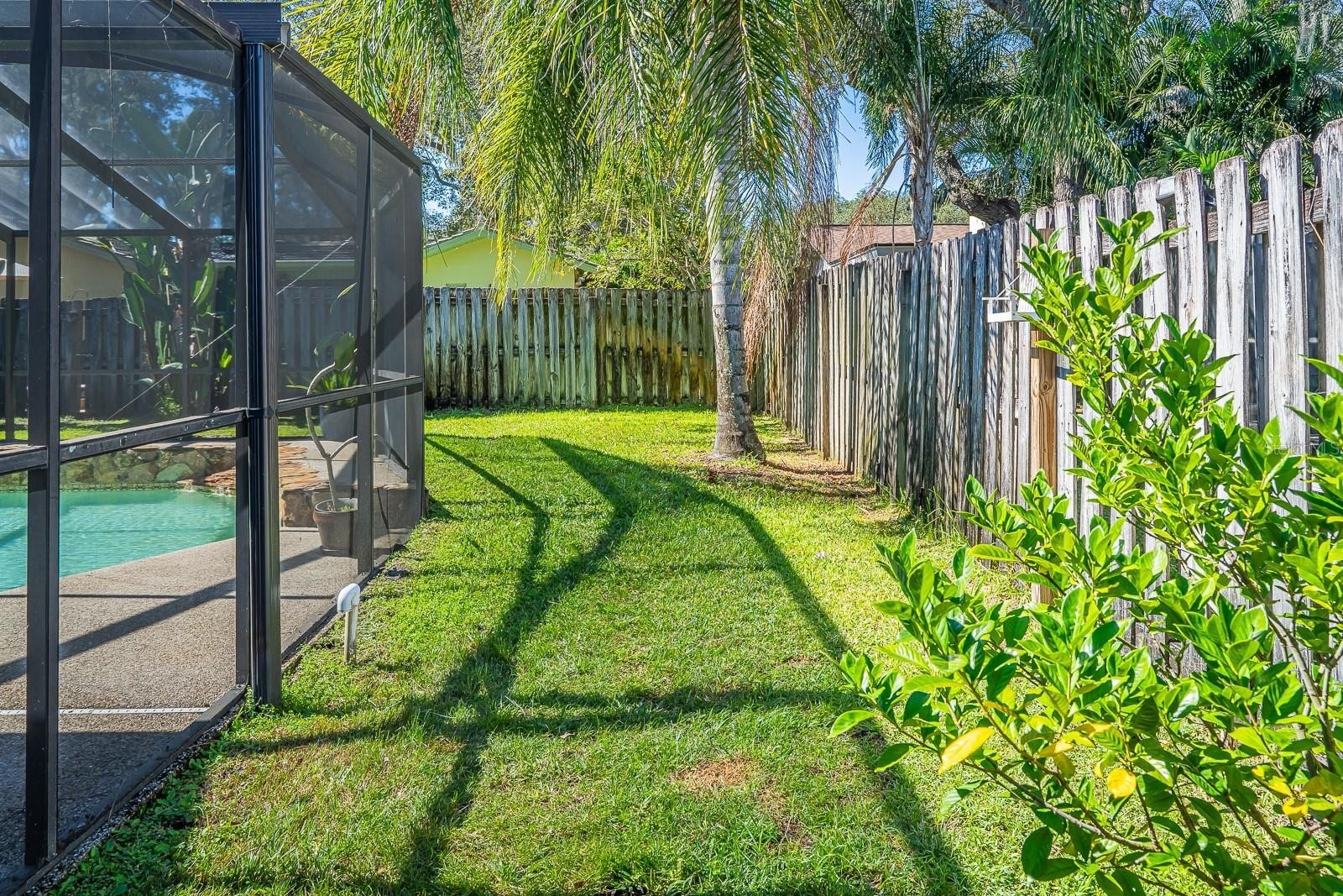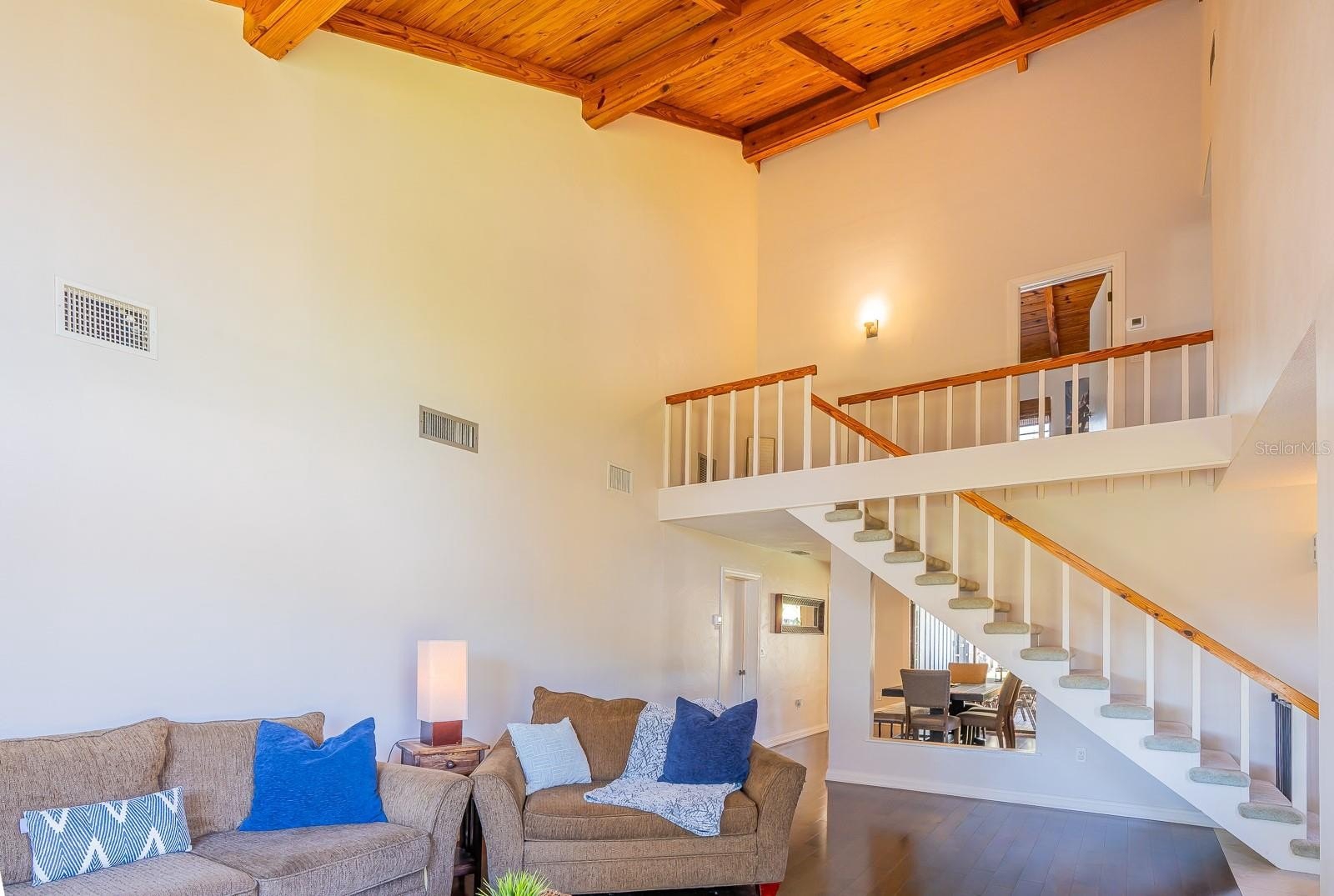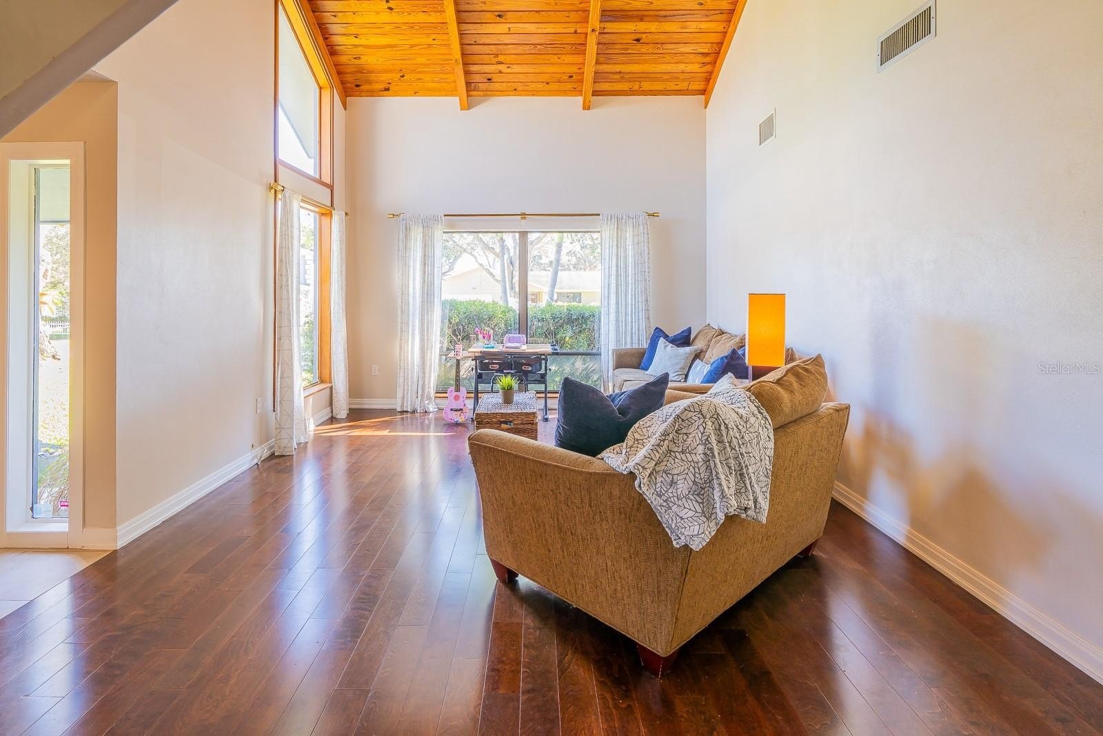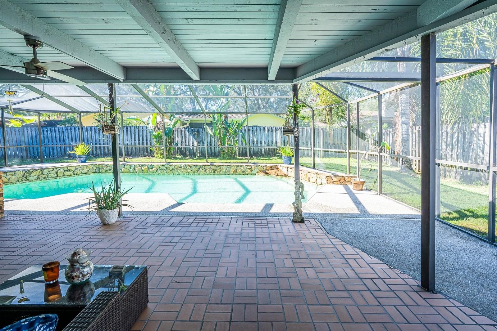 Welcome to Northwood Estates, one of Clearwater’s most established and sought-after communities, where timeless architecture meets relaxed Florida living. Recently painted on the exterior, this beautifully maintained two-story home blends warmth, light, and character in every detail. Inside, you’ll find soaring cedar-vaulted ceilings, rich hardwood floors, and expansive windows that flood the home with natural light. The open, airy layout offers defined yet connected spaces, including a grand family room framed by a dramatic sky window that seems to bring the outdoors in, creating a peaceful and welcoming atmosphere. The chef-inspired kitchen combines style and function with granite countertops, stainless steel appliances, a glass-tile backsplash, and a beamed ceiling crowned with elegant molding. A formal dining room and dedicated office provide ideal spaces for both connection and productivity. The primary suite is a true sanctuary, featuring a stunning wood-burning fireplace, a large walk-in closet, and a spa-like bathroom with dual sinks, a makeup vanity, and a walk-in shower. Upstairs, two additional bedrooms and a spacious guest bath offer comfort and privacy, while the open hallway overlooks the family room below, enhancing the sense of light and openness. Step outside to your private backyard oasis with a covered patio, screened lanai, sparkling pool, and lush green space perfect for entertaining or relaxing. Additional highlights include A/C (2023), architectural roof (2015), newer pool pump, fresh exterior paint, and an oversized two-car garage with ample storage.