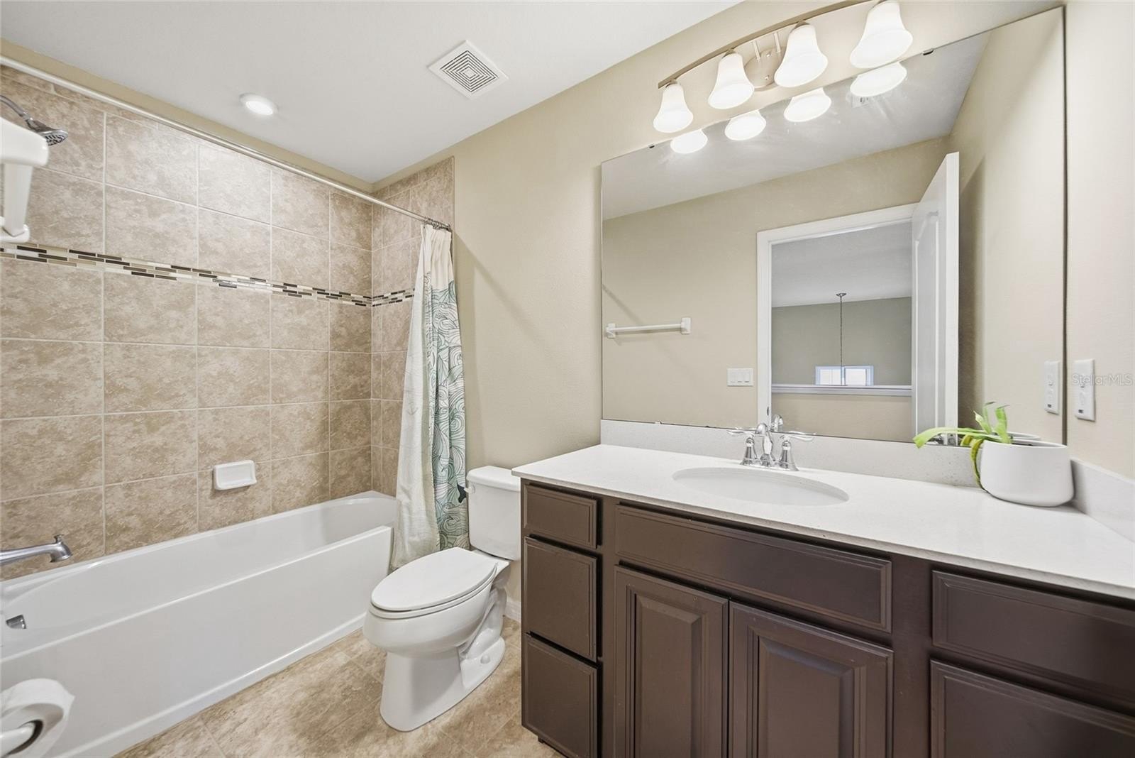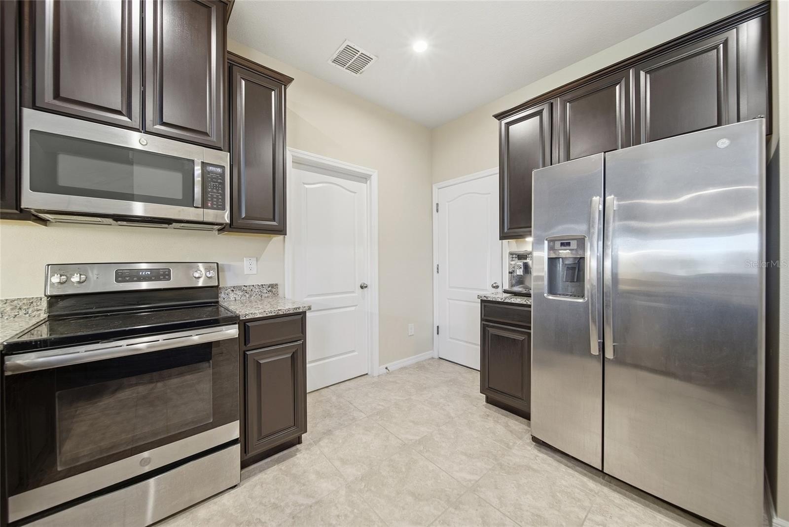 Inside, the open layout features soaring ceilings, abundant natural light, and a stylish kitchen with espresso cabinetry, granite counters, breakfast bar, and pantry. Upstairs, a spacious loft provides an ideal office or secondary living space, and the split-bedroom design offers privacy for guests or family. Tile flooring, recessed lighting, under-cabinet accents, and ceiling fans throughout add thoughtful detail.