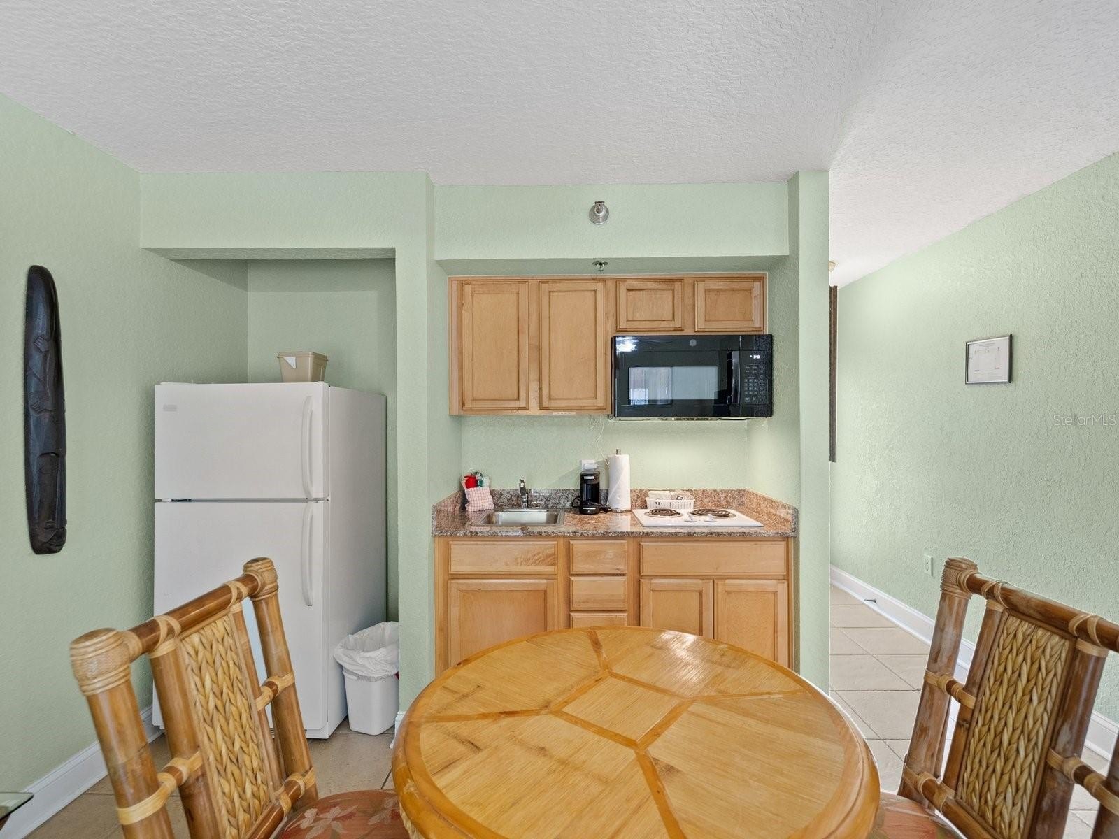This rare floor plan features a private bedroom—a true separate sleeping area not found in most studio units—plus a sleeper sofa in the living room, comfortably sleeping up to four guests. The unit is fully furnished and turnkey, featuring ceramic tile flooring, a well-equipped kitchenette with wood cabinetry and stone counters, and French doors leading to a private balcony, perfect for morning coffee or sunset cocktails.