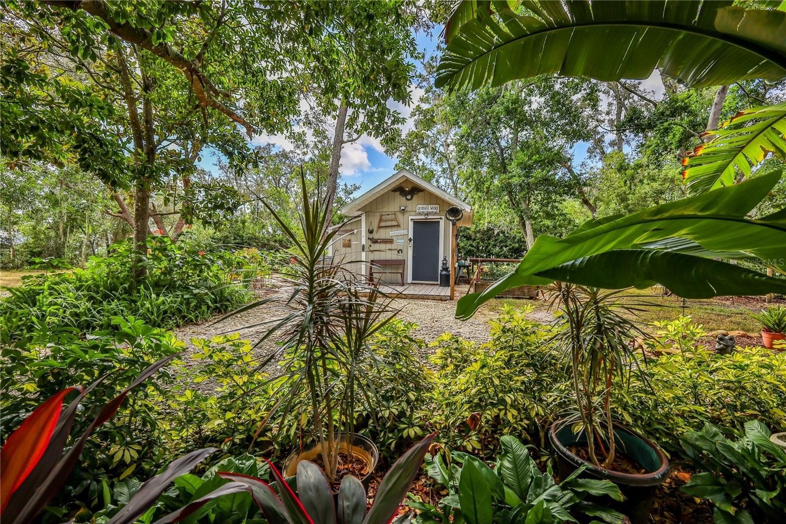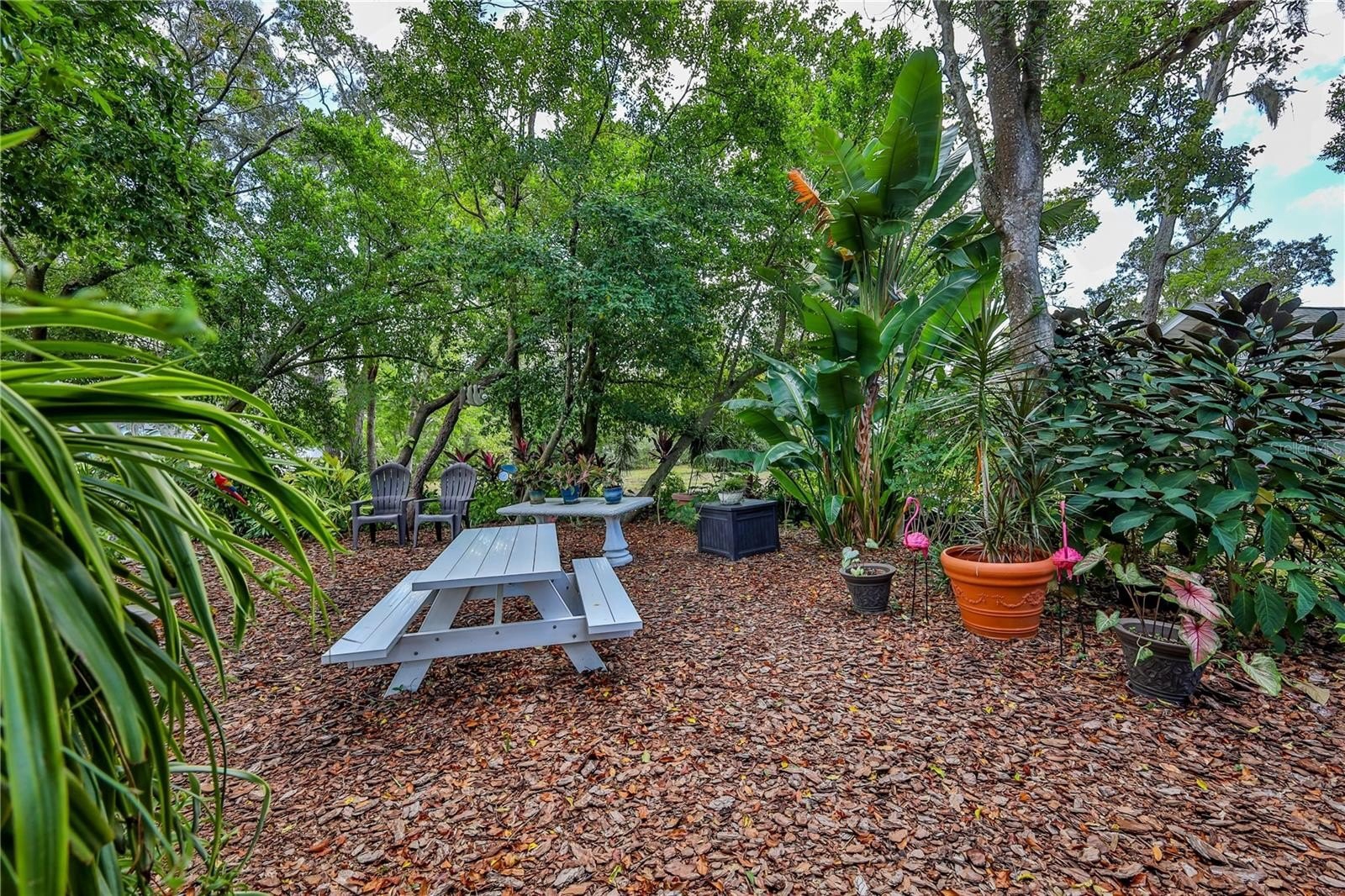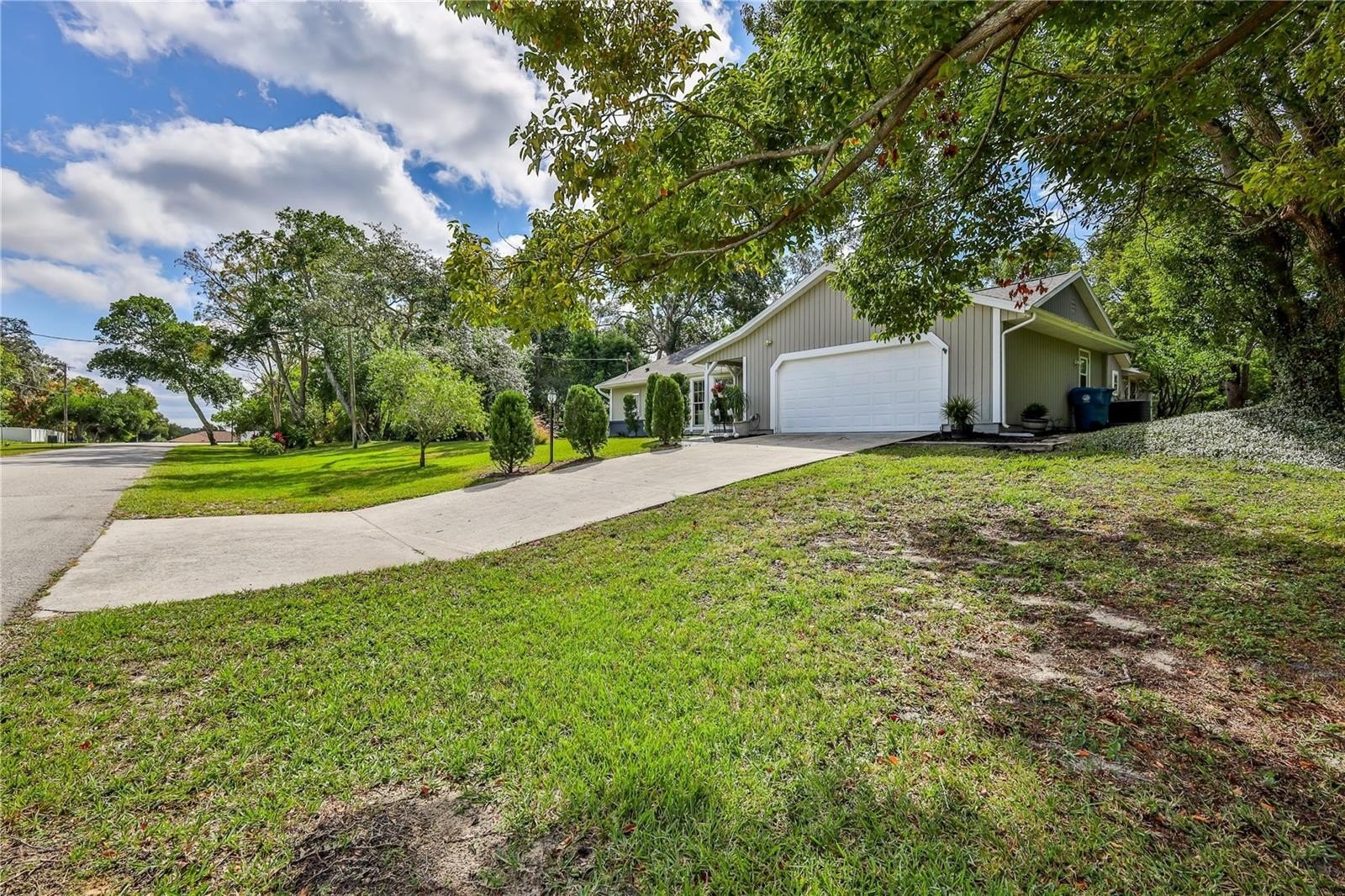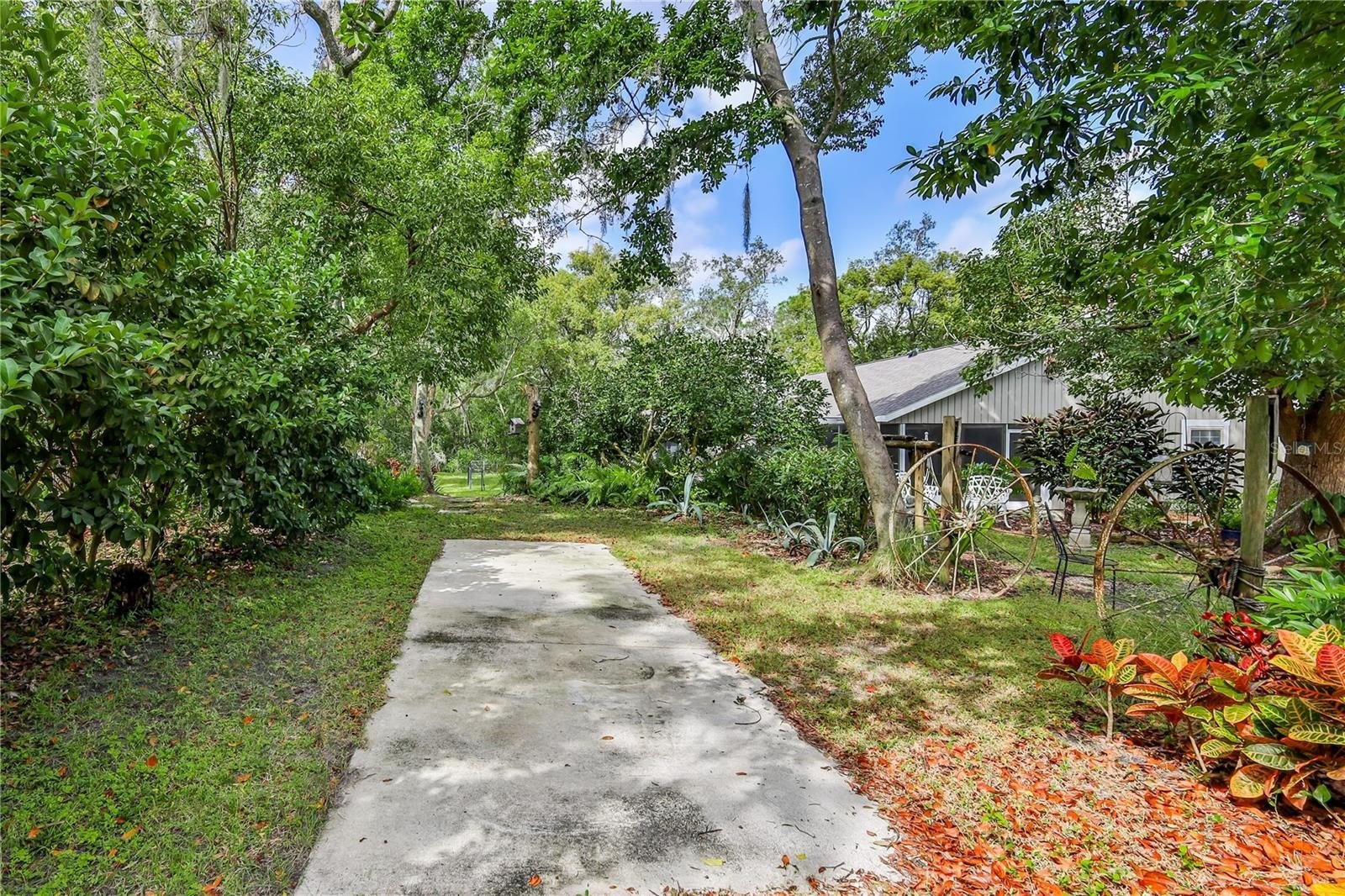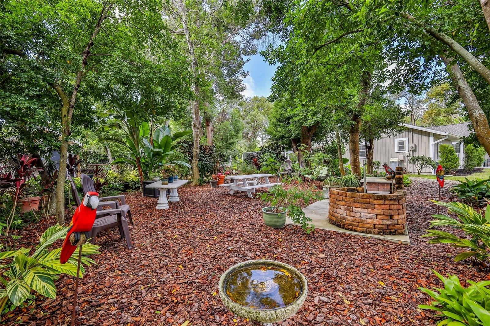 Welcome to your private garden paradise! This beautifully maintained 3-bedroom, 2-bathroom, 2-car garage, heated-pool home sits on a double lot surrounded by lush gardens, winding pathways, and mature trees—a true outdoor oasis. Step through the front door into a spacious split-living floor plan with imported Spanish tile flooring throughout and an abundance of natural light. To the left, the living and dining room combination features a beautiful chandelier and French doors leading to the covered lanai. The main suite is a peaceful retreat with French doors to the lanai, a large walk-in closet, and an en suite bathroom featuring a new vanity, updated shower, and linen closet. The kitchen is a showstopper—equipped with espresso custom cabinets, soft-close drawers, stainless-steel appliances 2023, a copper vent hood, Van Gogh granite countertops, a deep farmhouse sink, Lazy Susans, and a large pantry closet. There's even a built-in kegerator! The kitchen opens to a bright family room with vaulted ceilings, recessed lighting, and a cozy gas fireplace. Pocket sliding and french doors open from the family room to the screen-enclosed lanai and sparkling pool area, complete with paver decking, ceiling fans, an outdoor shower, and even a slide for extra fun! The guest wing includes two comfortable bedrooms and a fully updated bathroom with a new stone-top vanity, tub/shower combo, and linen closet. One guest bedroom offers two closets and French doors to the lanai, making it ideal for guests or a home office. The outdoor living space is what truly sets this property apart—featuring a fire pit area, charming pathways and seating areas through tropical gardens, a gravel driveway, a storage shed with wooden deck, a concrete pad perfect for a bar setup, No HOA so bring your RV and boat! Additional features include a pool heater, gas fireplace hookup, irrigation on a well, newer double-hung windows, new Anderson front door and a house generator hookup with a switch in the garage. Roof 2022. HVAC 2021. HWH 2014. Remediated ground settlement with all documents, fully insurable and financeable. This home offers the perfect blend of comfort, character, and outdoor beauty—ideal for those who love to entertain, garden, or simply enjoy peaceful Florida living.