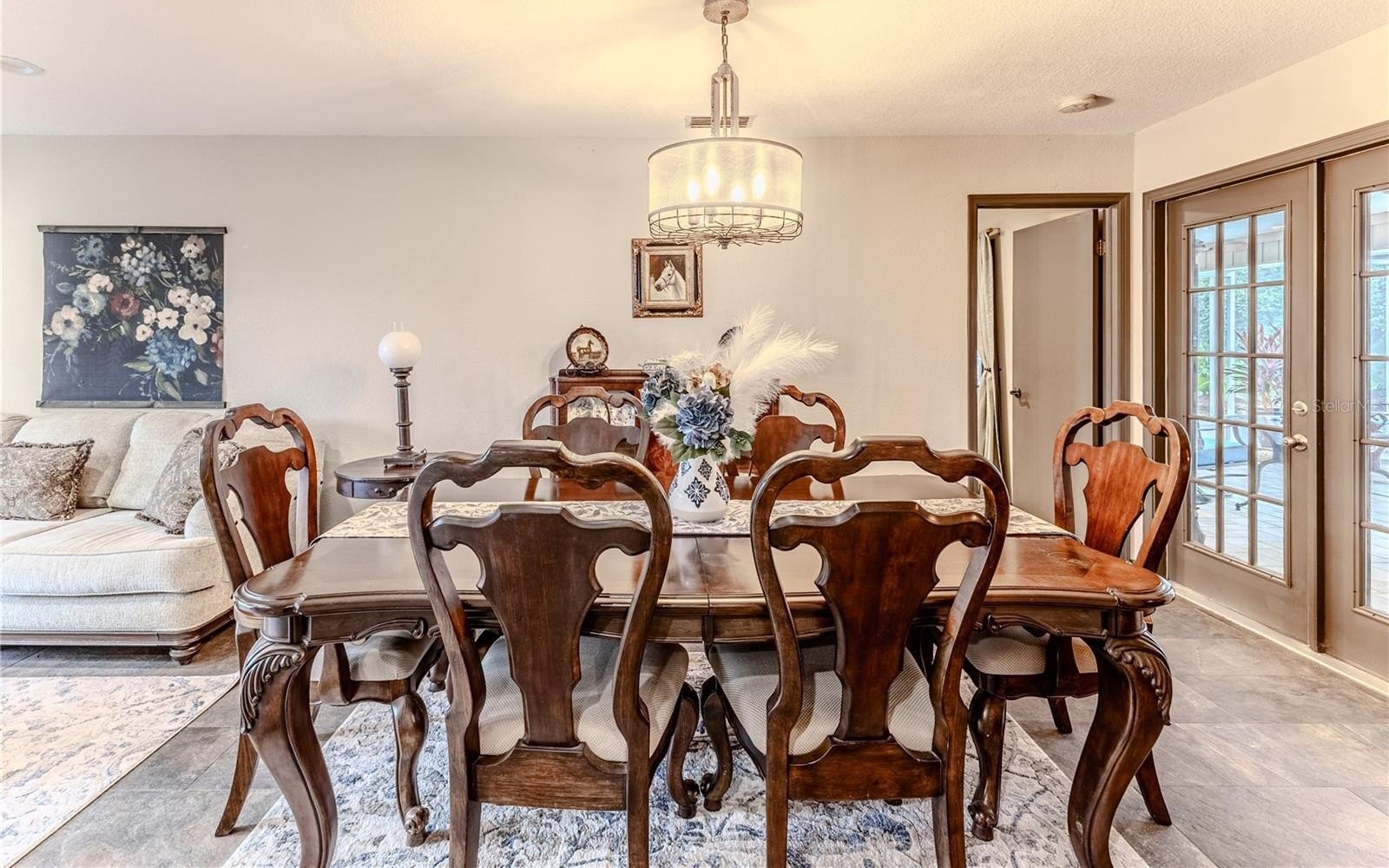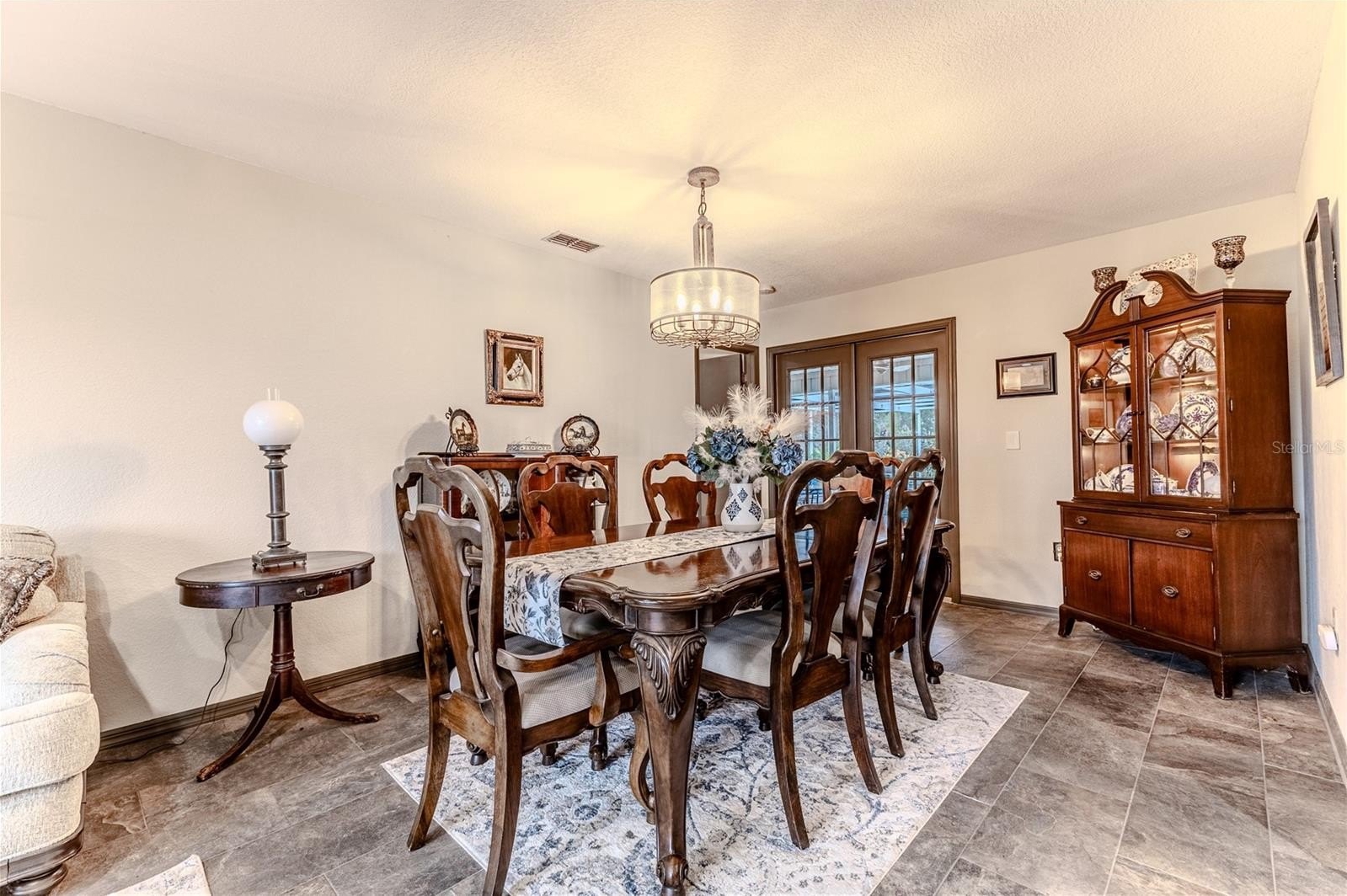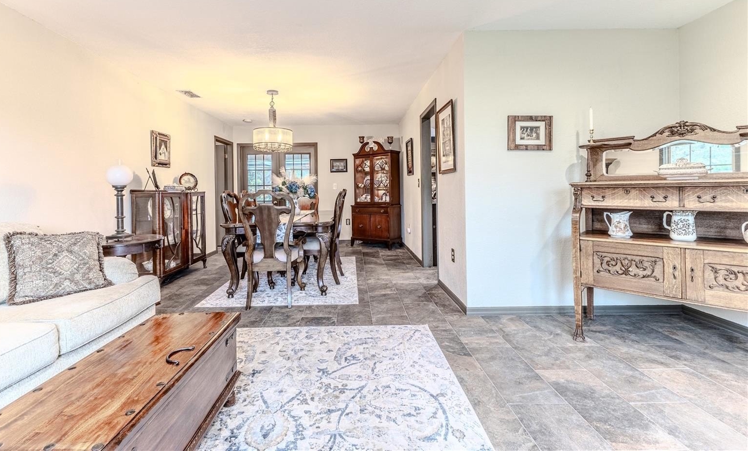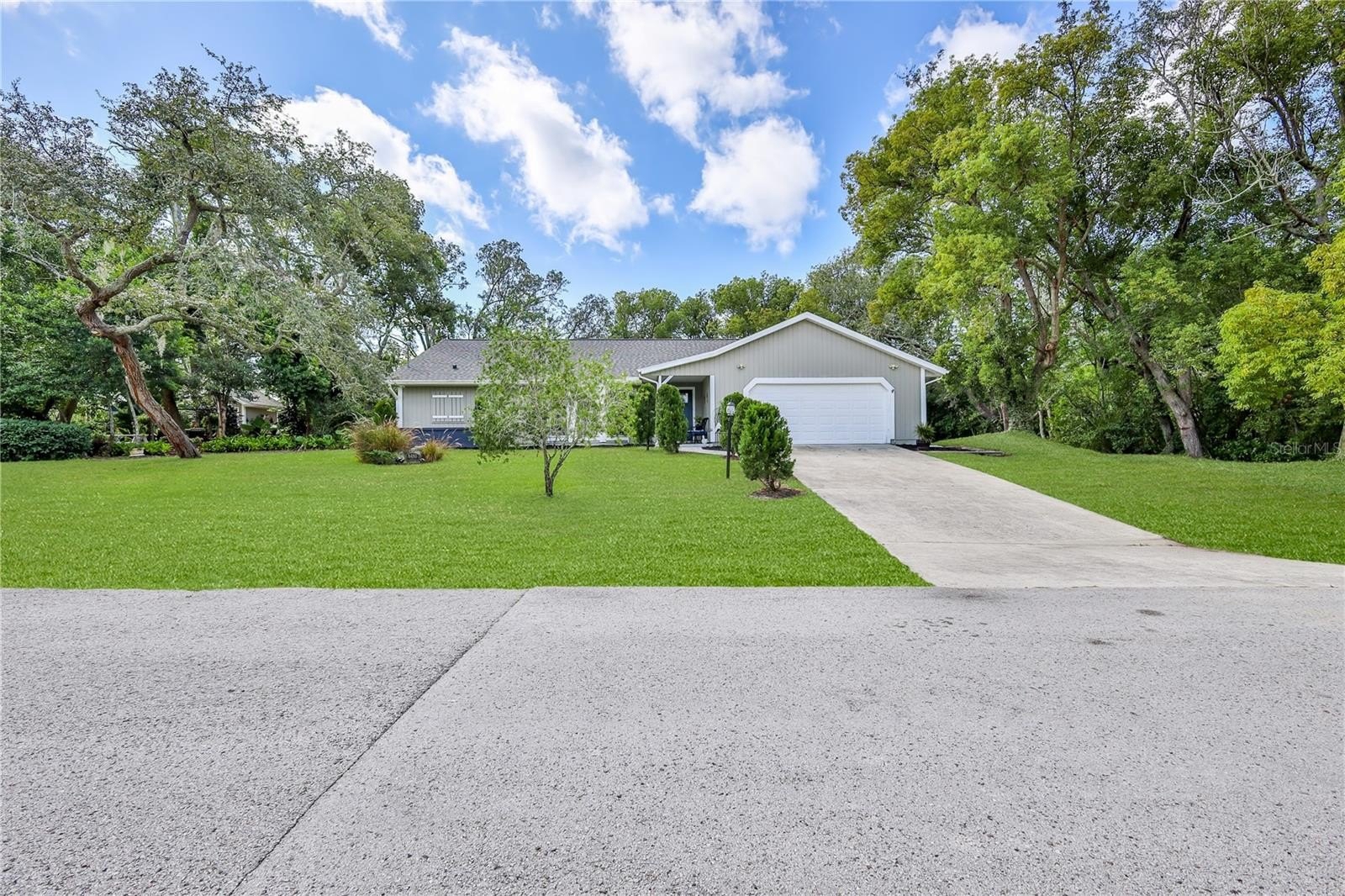 Welcome to your private garden paradise! This beautifully maintained 3-bedroom, 2-bathroom, 2-car garage, heated-pool home sits on a double lot surrounded by lush gardens, winding pathways, and mature trees—a true outdoor oasis. Step through the front door into a spacious split-living floor plan with imported Spanish tile flooring throughout and an abundance of natural light. To the left, the living and dining room combination features a beautiful chandelier and French doors leading to the covered lanai. The main suite is a peaceful retreat with French doors to the lanai, a large walk-in closet, and an en suite bathroom featuring a new vanity, updated shower, and linen closet. The kitchen is a showstopper—equipped with espresso custom cabinets, soft-close drawers, stainless-steel appliances 2023, a copper vent hood, Van Gogh granite countertops, a deep farmhouse sink, Lazy Susans, and a large pantry closet. There's even a built-in kegerator! The kitchen opens to a bright family room with vaulted ceilings, recessed lighting, and a cozy gas fireplace. Pocket sliding and french doors open from the family room to the screen-enclosed lanai and sparkling pool area, complete with paver decking, ceiling fans, an outdoor shower, and even a slide for extra fun! The guest wing includes two comfortable bedrooms and a fully updated bathroom with a new stone-top vanity, tub/shower combo, and linen closet. One guest bedroom offers two closets and French doors to the lanai, making it ideal for guests or a home office. The outdoor living space is what truly sets this property apart—featuring a fire pit area, charming pathways and seating areas through tropical gardens, a gravel driveway, a storage shed with wooden deck, a concrete pad perfect for a bar setup, No HOA so bring your RV and boat! Additional features include a pool heater, gas fireplace hookup, irrigation on a well, newer double-hung windows, new Anderson front door and a house generator hookup with a switch in the garage. Roof 2022. HVAC 2021. HWH 2014. Remediated ground settlement with all documents, fully insurable and financeable. This home offers the perfect blend of comfort, character, and outdoor beauty—ideal for those who love to entertain, garden, or simply enjoy peaceful Florida living.