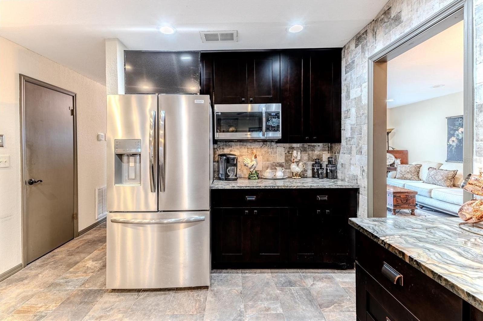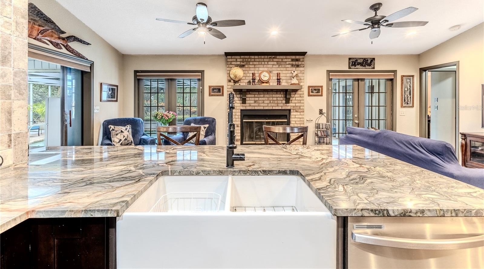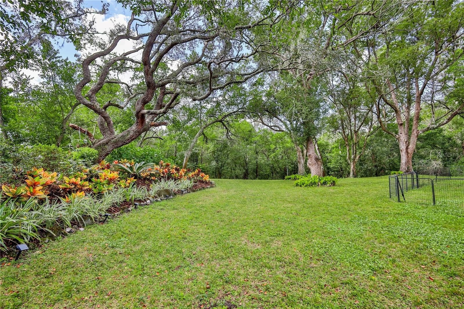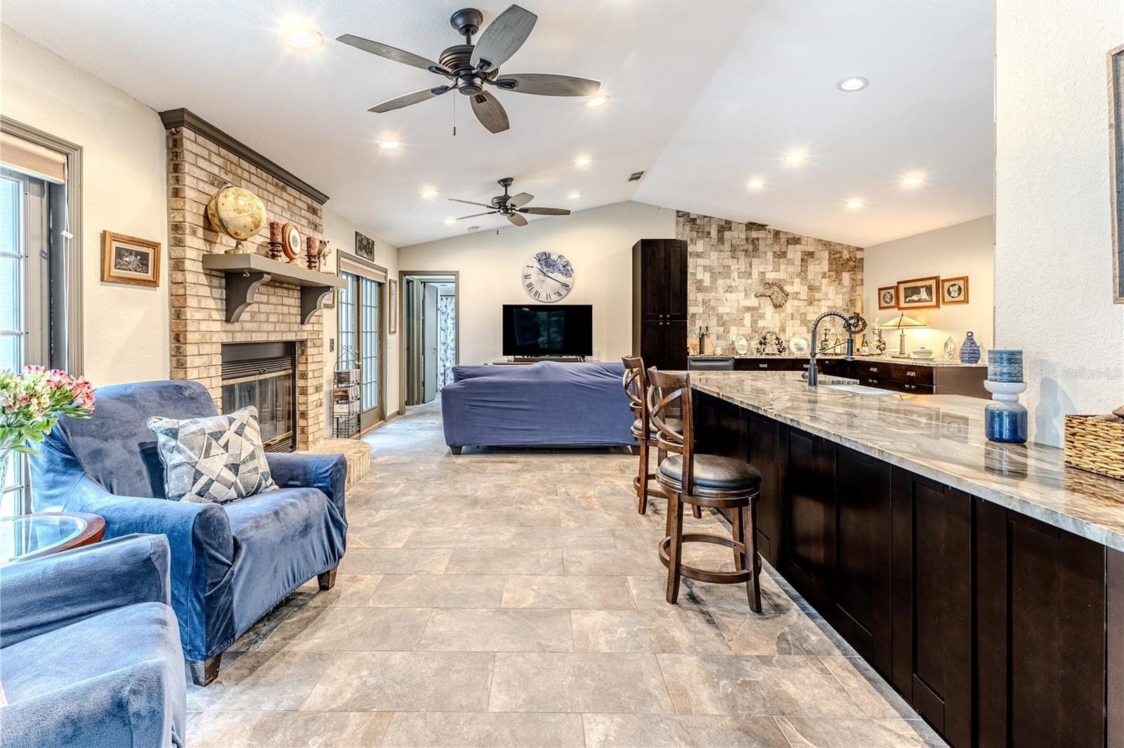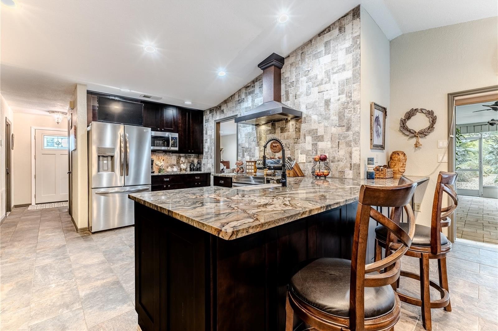 Welcome to your private garden paradise! This beautifully maintained 3-bedroom, 2-bathroom, 2-car garage, heated-pool home sits on a double lot surrounded by lush gardens, winding pathways, and mature trees—a true outdoor oasis. Step through the front door into a spacious split-living floor plan with imported Spanish tile flooring throughout and an abundance of natural light. To the left, the living and dining room combination features a beautiful chandelier and French doors leading to the covered lanai. The main suite is a peaceful retreat with French doors to the lanai, a large walk-in closet, and an en suite bathroom featuring a new vanity, updated shower, and linen closet. The kitchen is a showstopper—equipped with espresso custom cabinets, soft-close drawers, stainless-steel appliances 2023, a copper vent hood, Van Gogh granite countertops, a deep farmhouse sink, Lazy Susans, and a large pantry closet. There's even a built-in kegerator! The kitchen opens to a bright family room with vaulted ceilings, recessed lighting, and a cozy gas fireplace. Pocket sliding and french doors open from the family room to the screen-enclosed lanai and sparkling pool area, complete with paver decking, ceiling fans, an outdoor shower, and even a slide for extra fun! The guest wing includes two comfortable bedrooms and a fully updated bathroom with a new stone-top vanity, tub/shower combo, and linen closet. One guest bedroom offers two closets and French doors to the lanai, making it ideal for guests or a home office. The outdoor living space is what truly sets this property apart—featuring a fire pit area, charming pathways and seating areas through tropical gardens, a gravel driveway, a storage shed with wooden deck, a concrete pad perfect for a bar setup, No HOA so bring your RV and boat! Additional features include a pool heater, gas fireplace hookup, irrigation on a well, newer double-hung windows, new Anderson front door and a house generator hookup with a switch in the garage. Roof 2022. HVAC 2021. HWH 2014. Remediated ground settlement with all documents, fully insurable and financeable. This home offers the perfect blend of comfort, character, and outdoor beauty—ideal for those who love to entertain, garden, or simply enjoy peaceful Florida living.