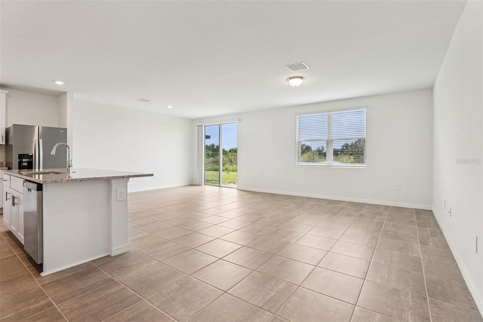 • Kitchen sink view overlooking the backyard and living space—perfect for entertaining