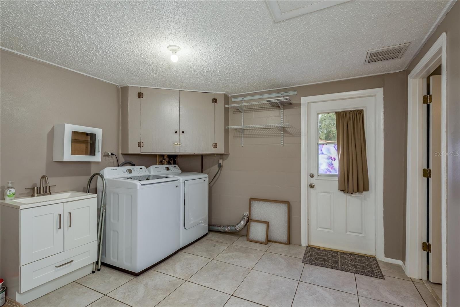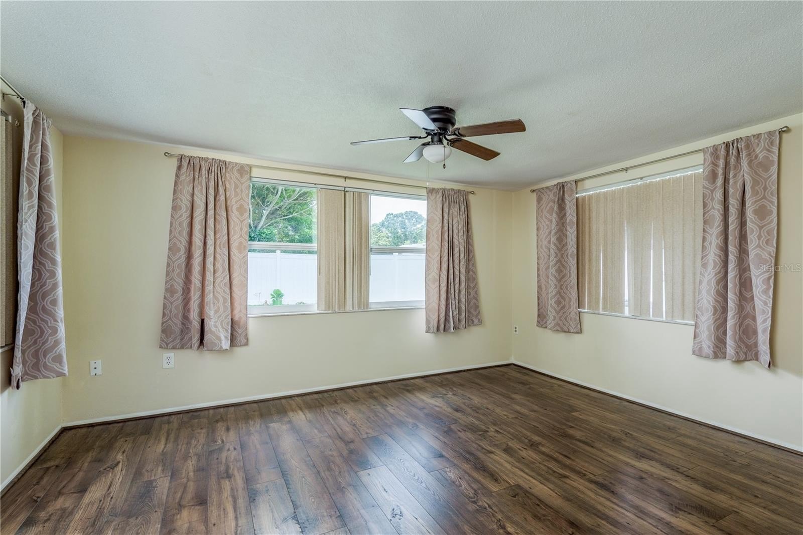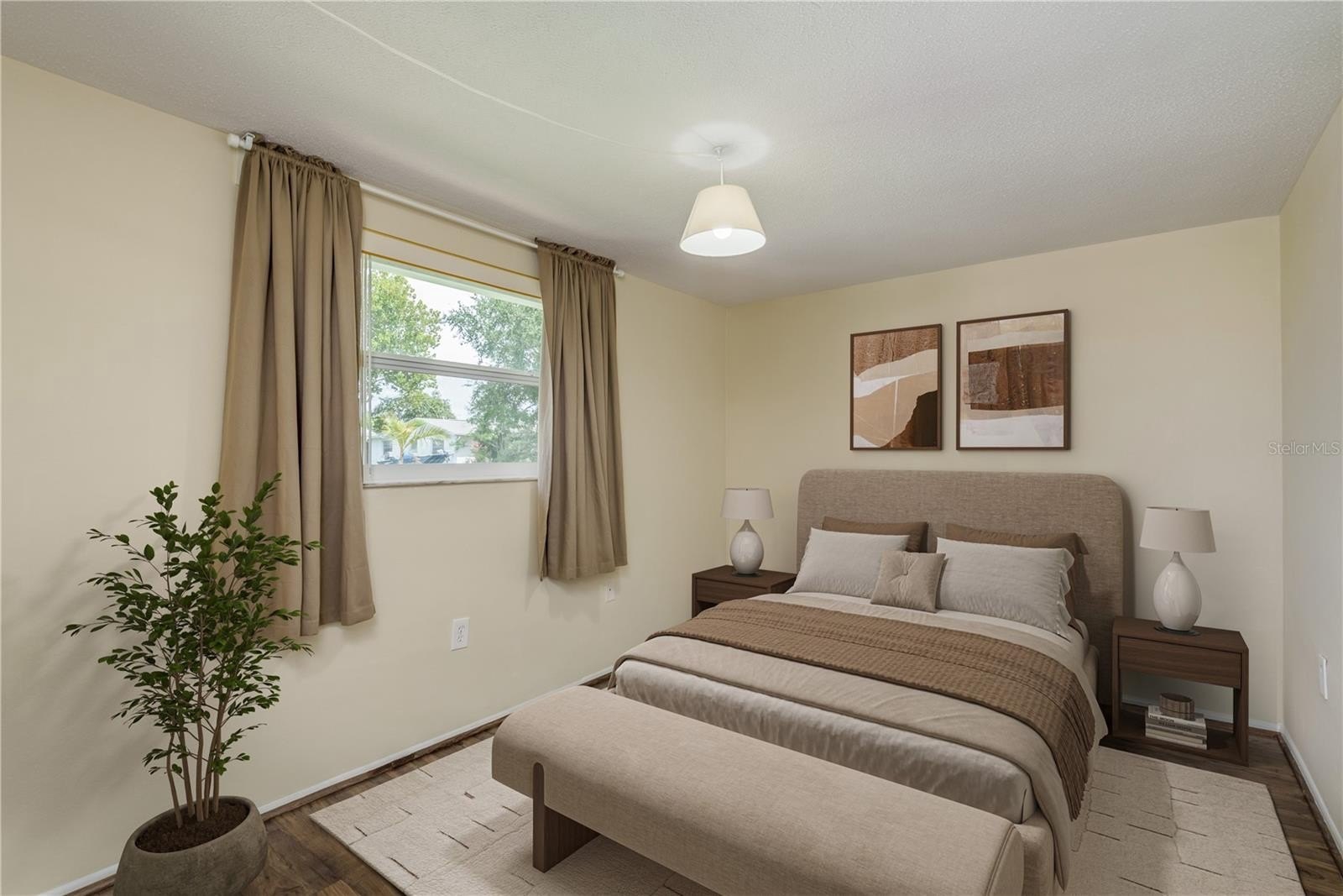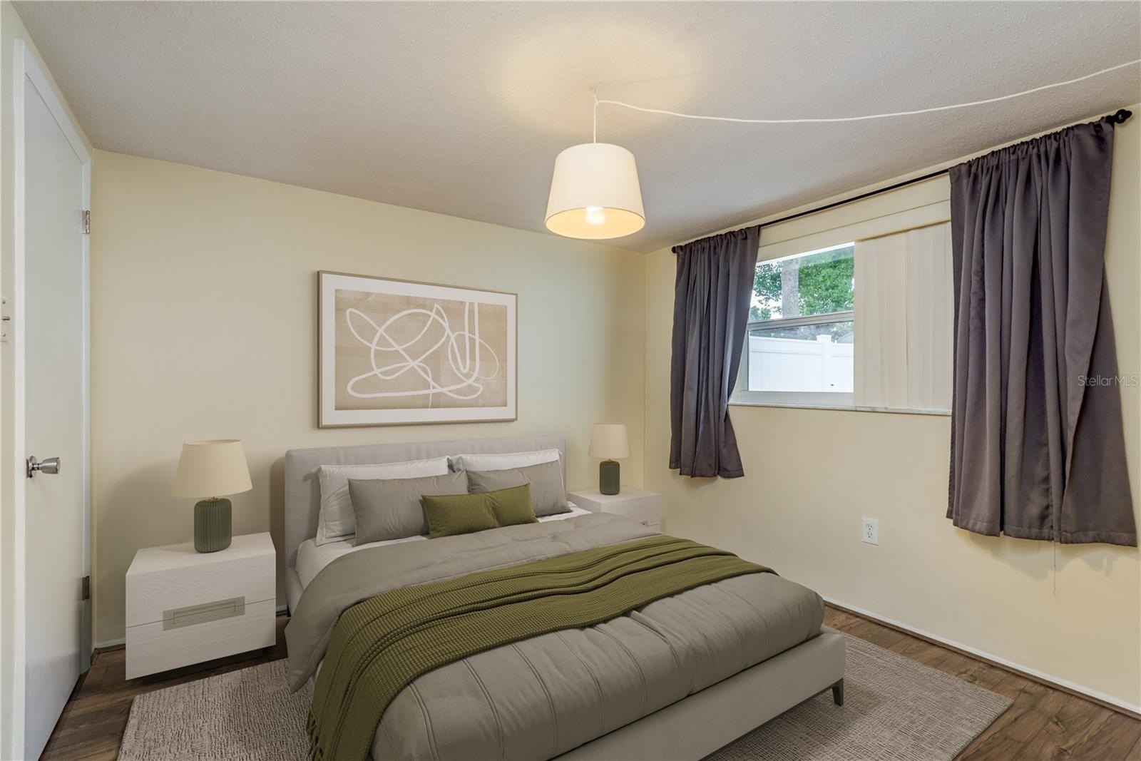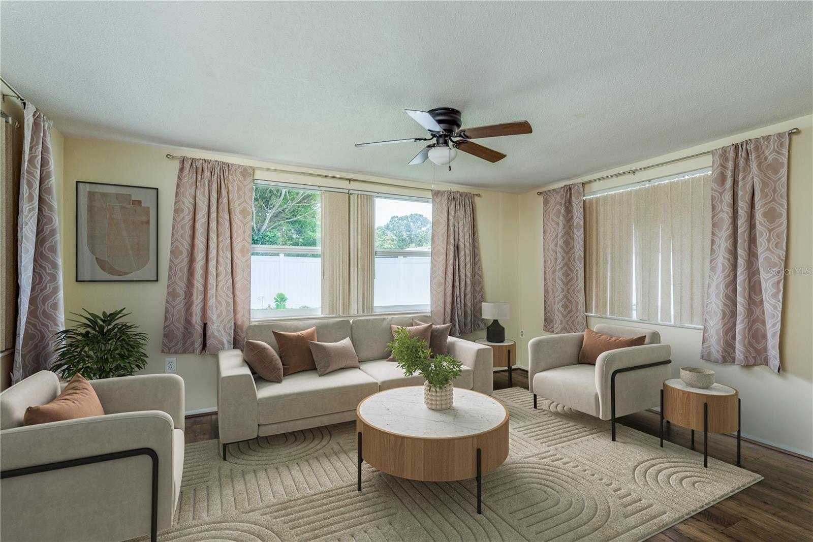 One or more photo(s) has been virtually staged. NEW PRICE on this updated Home with lots of space! This home features a NEW ROOF (2024) freshly painted Exterior, surge protection on the whole house, updated Attic insulation, and Updated WINDOWS plus MORE!! Take a look at this spacious home with 2 Bedrooms, a Family Room, additional Sun Porch with A/C and a BONUS In-Law/ Office space in the garage. The Kitchen has solid surface counters and good cabinet space! No carpet here - all tile or laminate flooring! The Laundry area is oversized and has a sink. Outside, the back yard has a Pergola and a Firepit as well as a storage shed. If you are looking for extra space this is the home you should see! Nicely maintained on a semi-corner lot with a full Privacy Fence in back. No HOA here!
