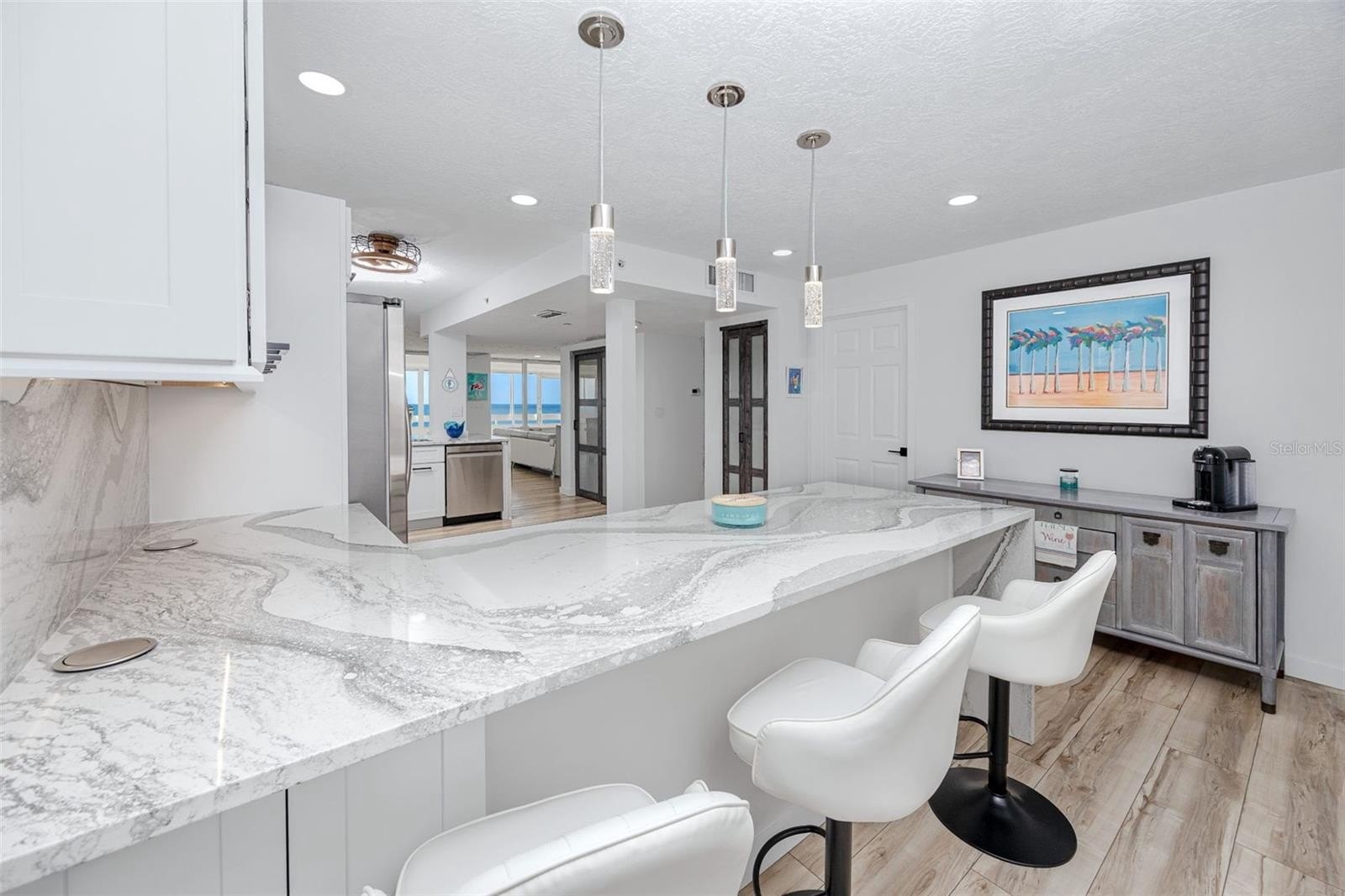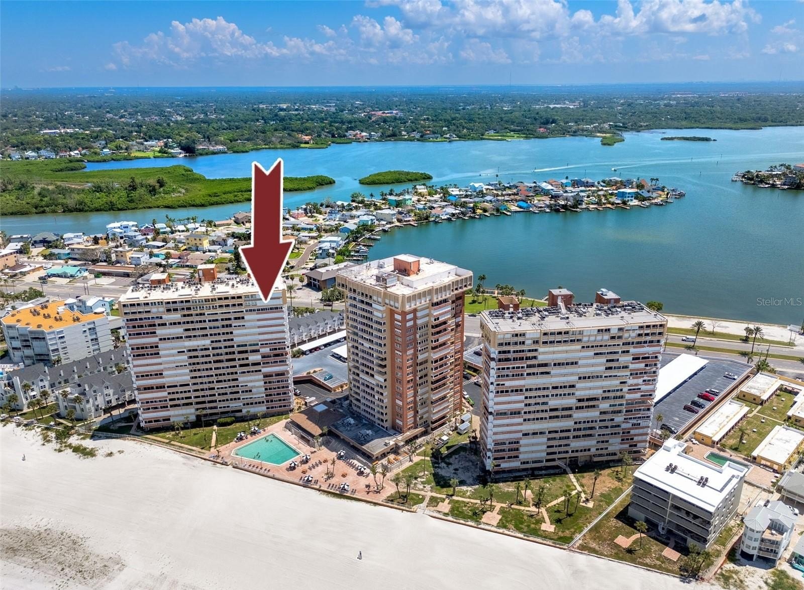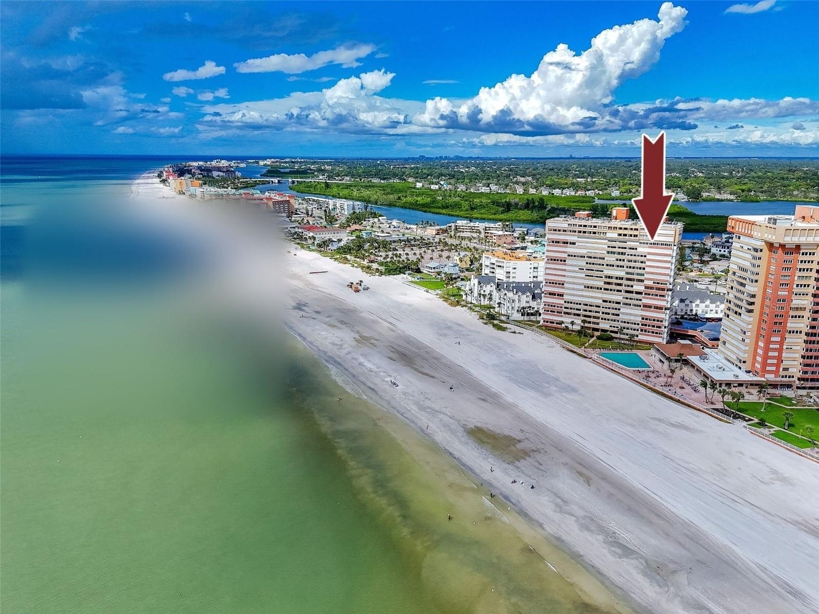 If you have been waiting for that perfect, rarely available 3 bdrm 2 bath END CORNER UNIT beachfront condo with a wrap around balcony and direct views of the Gulf of America, that day is here! Sunrises and sunsets are plentiful on the approx. 350 sq ft balcony with direct beach views. The front entrance to the condo offers another privately gated balcony with 123 sq ft for views of Boca Ciega Bay and beautiful skylines of nearby cities. All balconies have hurricane shutters that also help in keeping the condo cool on hot summer days. The owners have extensively renovated the unit ceilings to floors. The very large kitchen offers not 1 but 2 counter height islands with enough seating room for 6. Quartz counters tops with matching quartz backsplash and the highly desired waterfall feature and pop-up outlets. All lower cabinets have pull-out soft close drawers, under cabinet lighting. 2 Pantry closets and recessed lighting. All 3 bdrms are good sized, recessed lighting throughout the home, newer (2003) sprinklers, CAT 5e ethernet, Full size dining room and living room, all flooring is matching LVP throughout the home, water views from every room except bathrooms. The 16th floor only has 3 other units. There is even a 4.5’ x 5’ storage unit for your beach chairs, umbrellas, holiday decorations etc. located on the garage level making it easy to keep sand out of the condo. This community offers 24/7 guarded & gated security, visitor parking, bike storage racks in the garage, temperature-controlled pool, The Beach Clubhouse is undergoing renovations that include a billiard room, gym, ballroom, card room and library. Building 3 is currently undergoing exterior painting should you notice the scaffolding in various areas. Building has passed inspections and special assessments have been paid to date. All room sizes are approximate and to be verified by buyer.