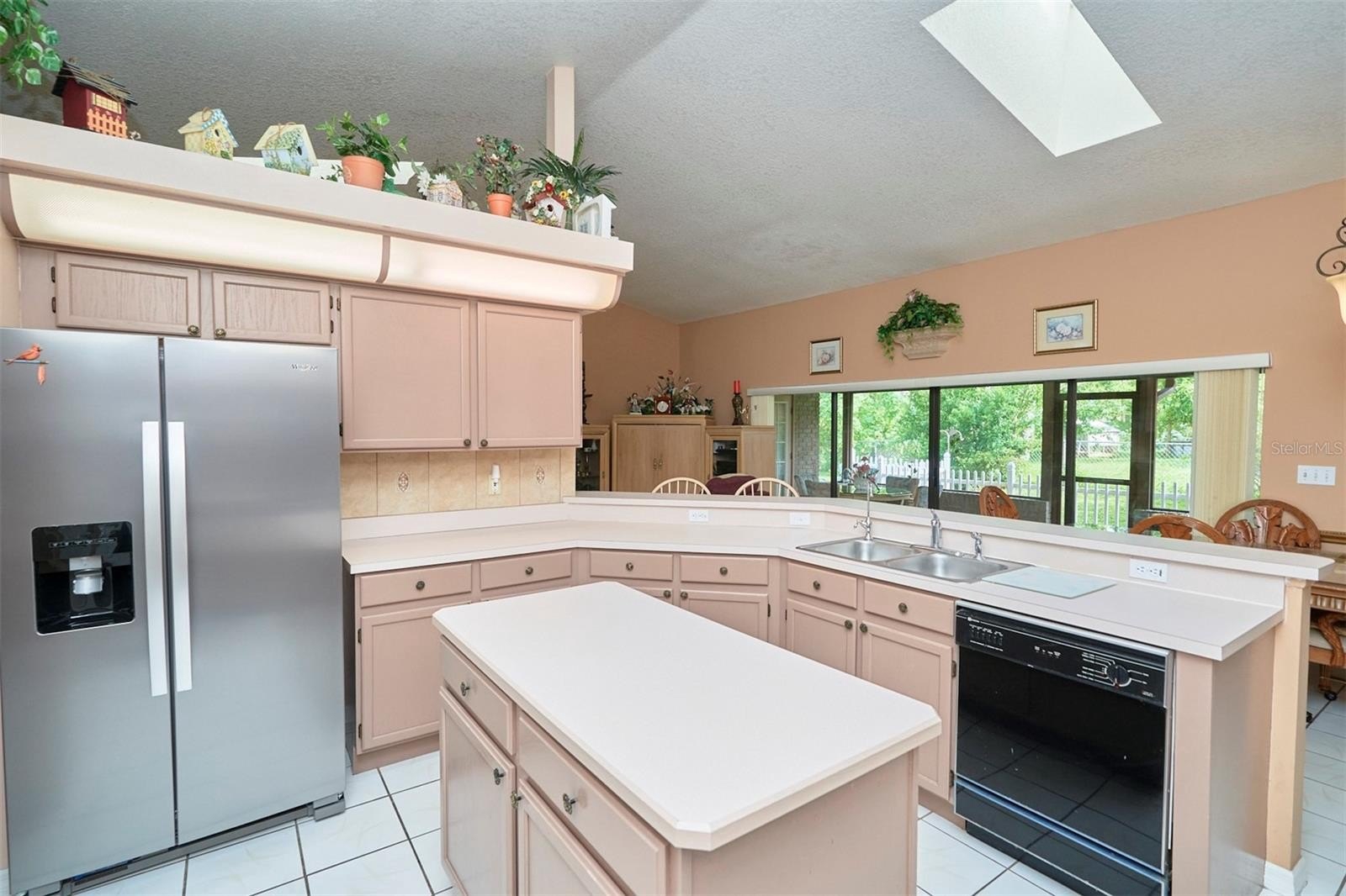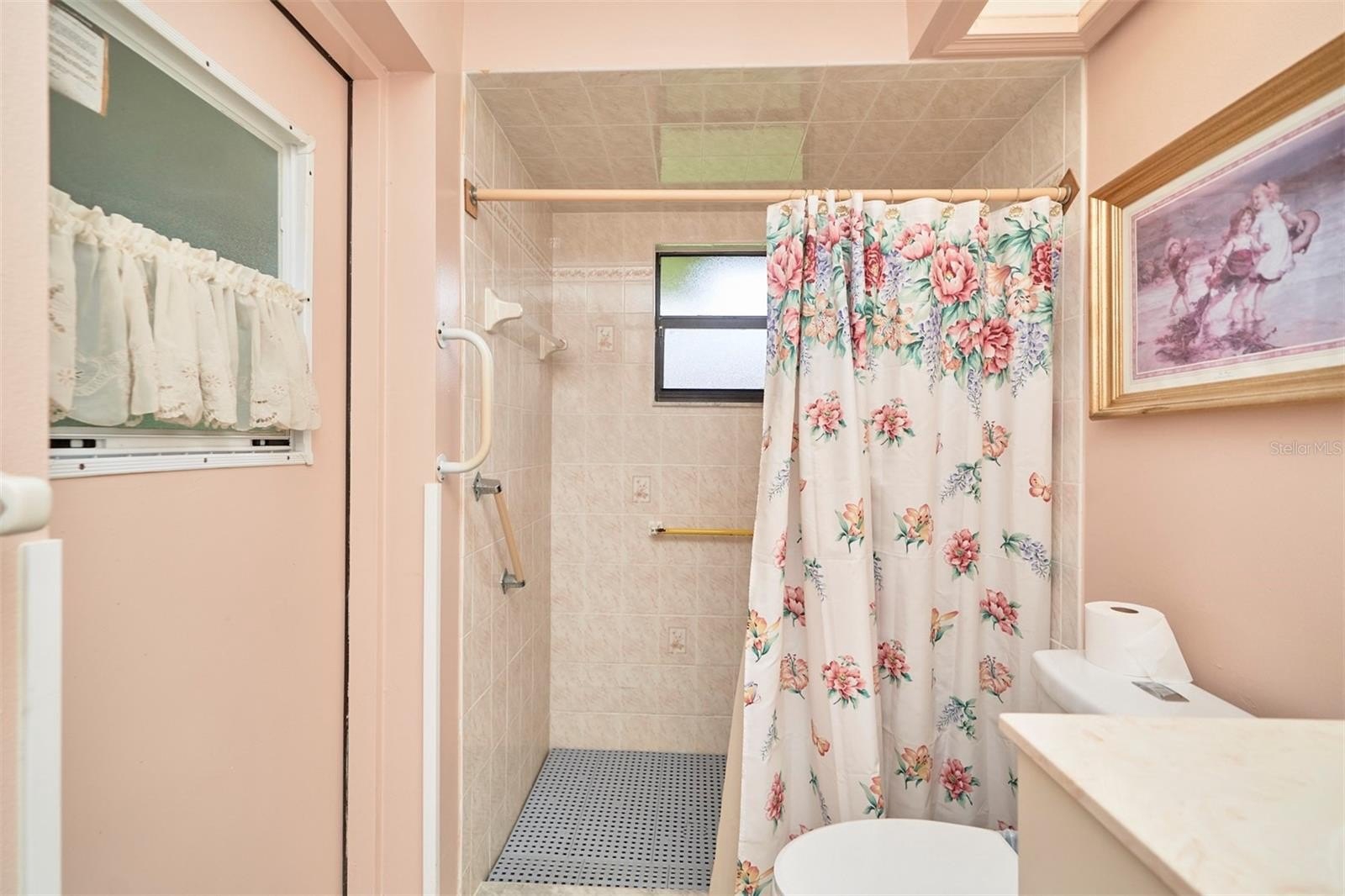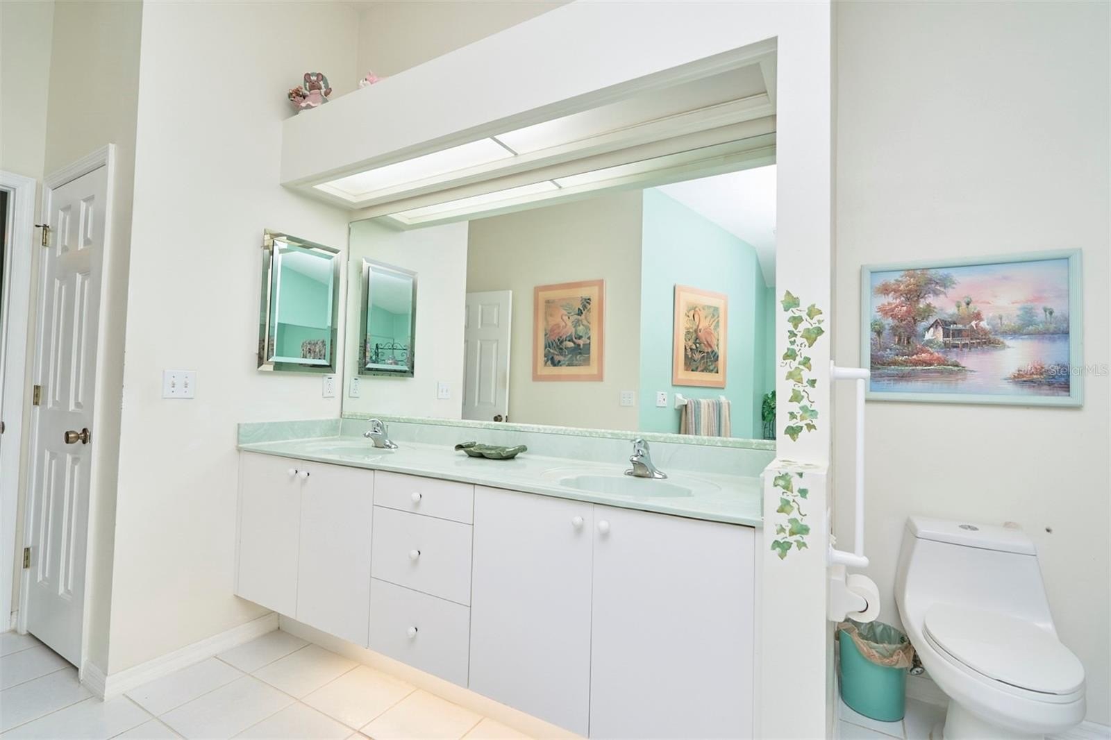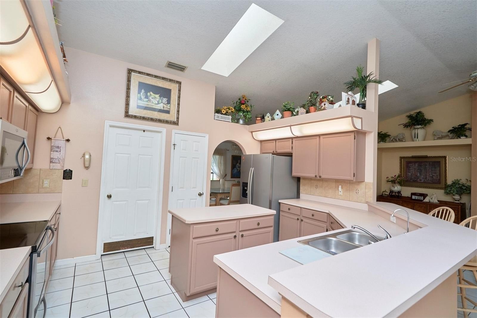 Skylights and vaulted ceilings create a light-filled and airy environment. The split layout offers privacy, and the spacious master suite includes a large walk-in closet and a spa-like bathroom with a soaking tub and separate shower. The second bath is wheelchair accessible, adding thoughtful functionality for guests or multigenerational living.