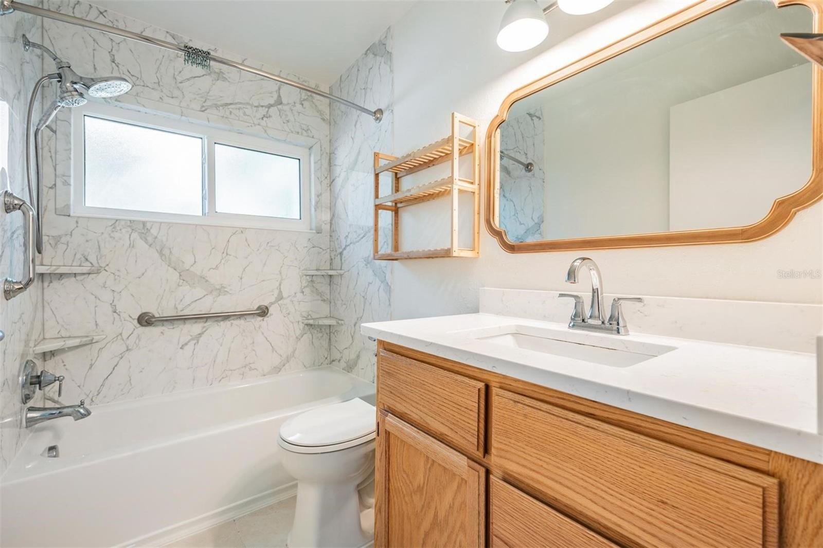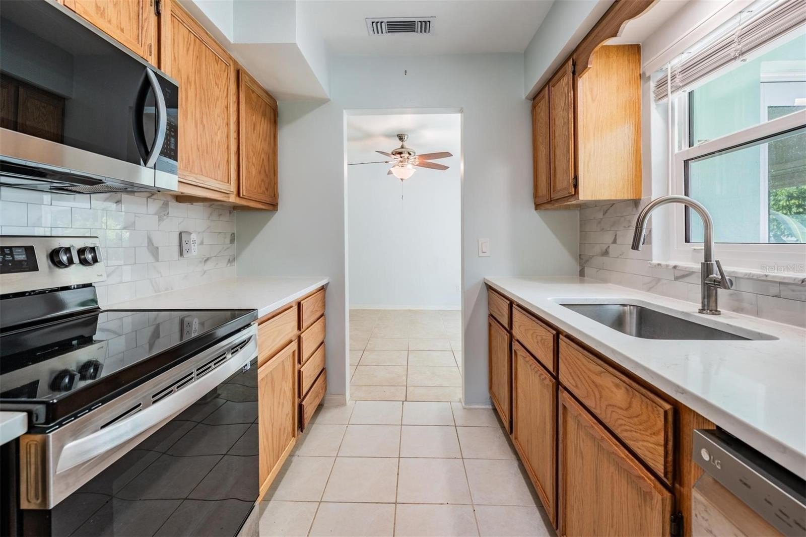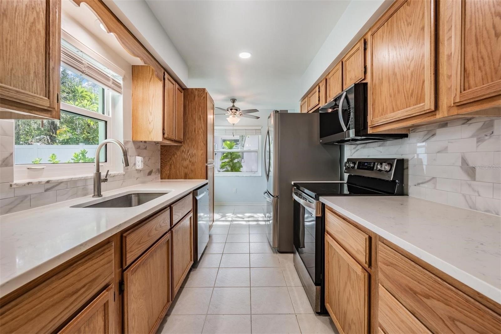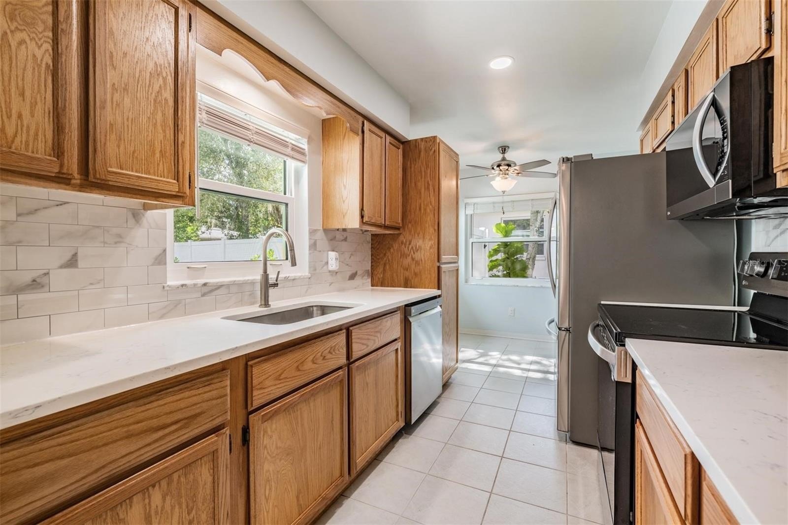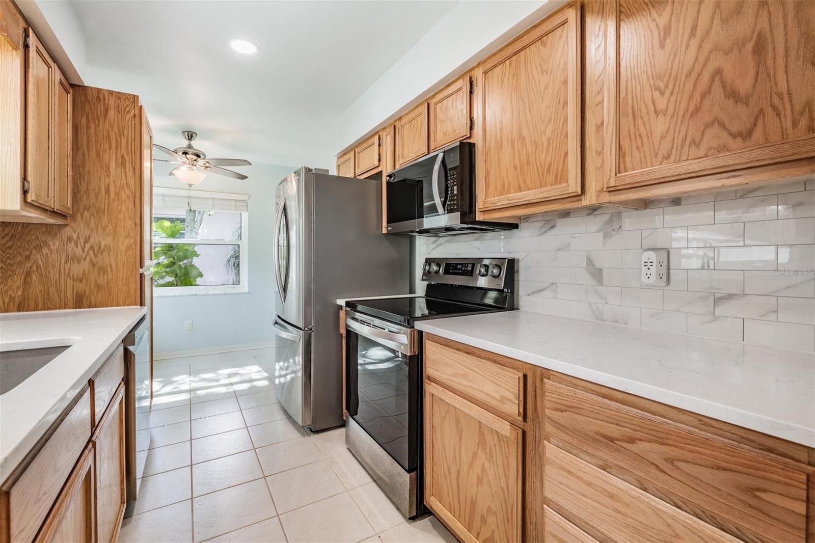 The kitchen features stone countertops, modern appliances, a new faucet, and a stylish tile backsplash. New lighting fixtures, ceiling fans, and window blinds enhance the interior, while an updated electrical system with modern outlets and added exterior outlets provides everyday ease.