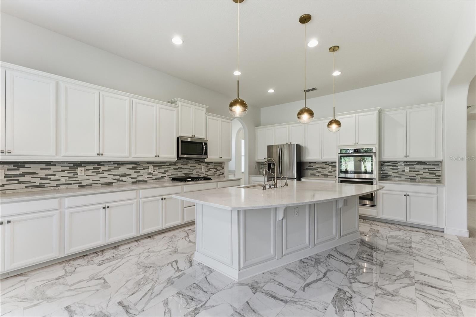 An open floor plan effortlessly flows from the elegant formal dining room to the expansive great room and gourmet kitchen. The chef's dream kitchen features a large granite island with bar seating, 42-inch solid wood cabinets, built-in oven, gas cooktop, and premium stainless appliances including dual ovens. The main-floor primary suite serves as your private sanctuary with soaring tray ceilings, spa-inspired ensuite bathroom with dual sinks, oversized walk-in shower, and expansive closet.