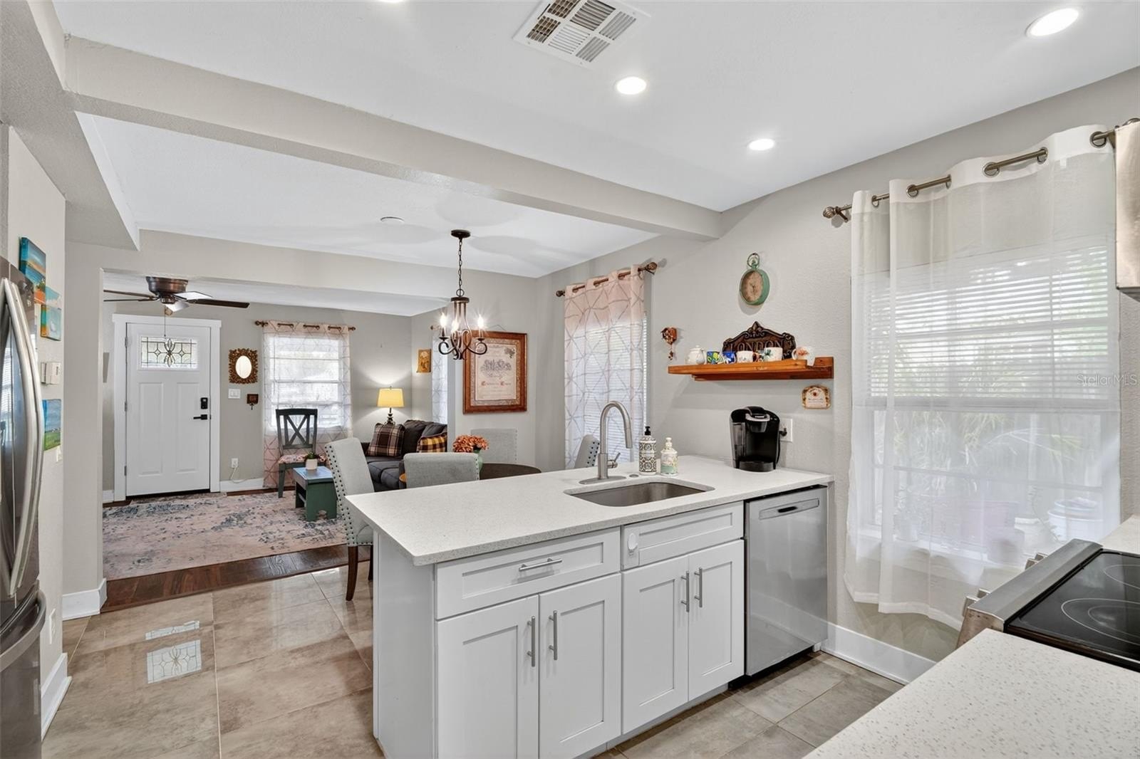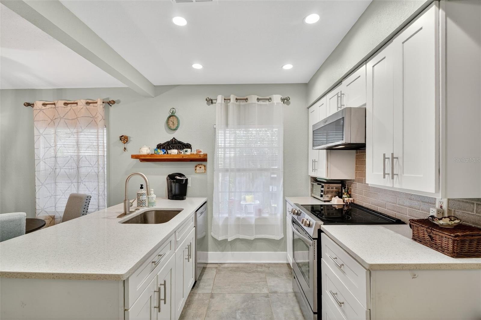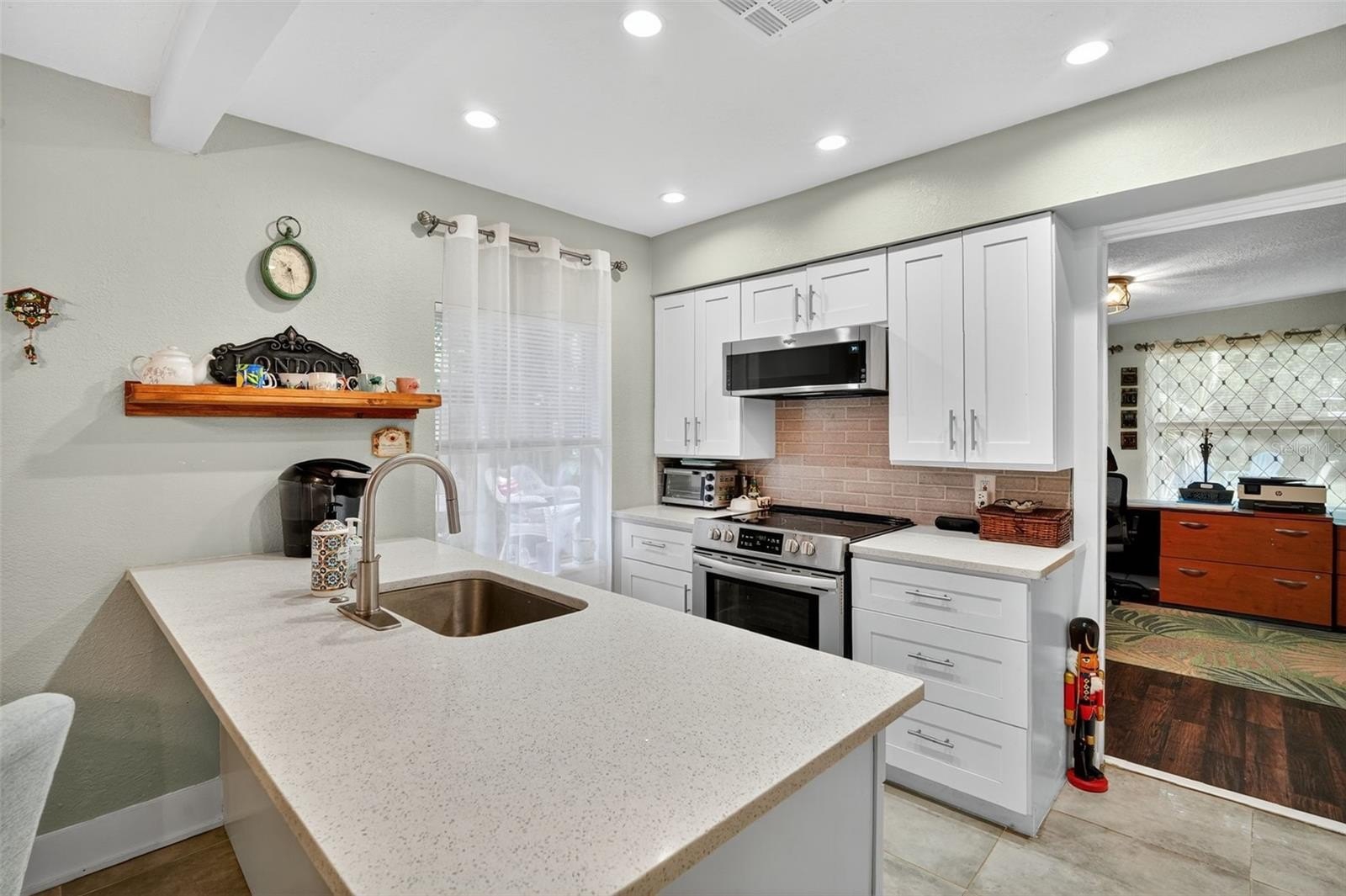 Inside, you’ll find a thoughtfully remodeled interior designed for both comfort and style. The bright and open kitchen is the centerpiece of the home, showcasing white shaker cabinetry, quartz countertops, and stainless-steel appliances. Whether you’re preparing family meals or entertaining guests, this space is as functional as it is beautiful. Both bathrooms have been completely updated with fresh finishes, while new flooring runs throughout, tying the home together with a clean, modern feel. Roof replacement was done in 2020.
