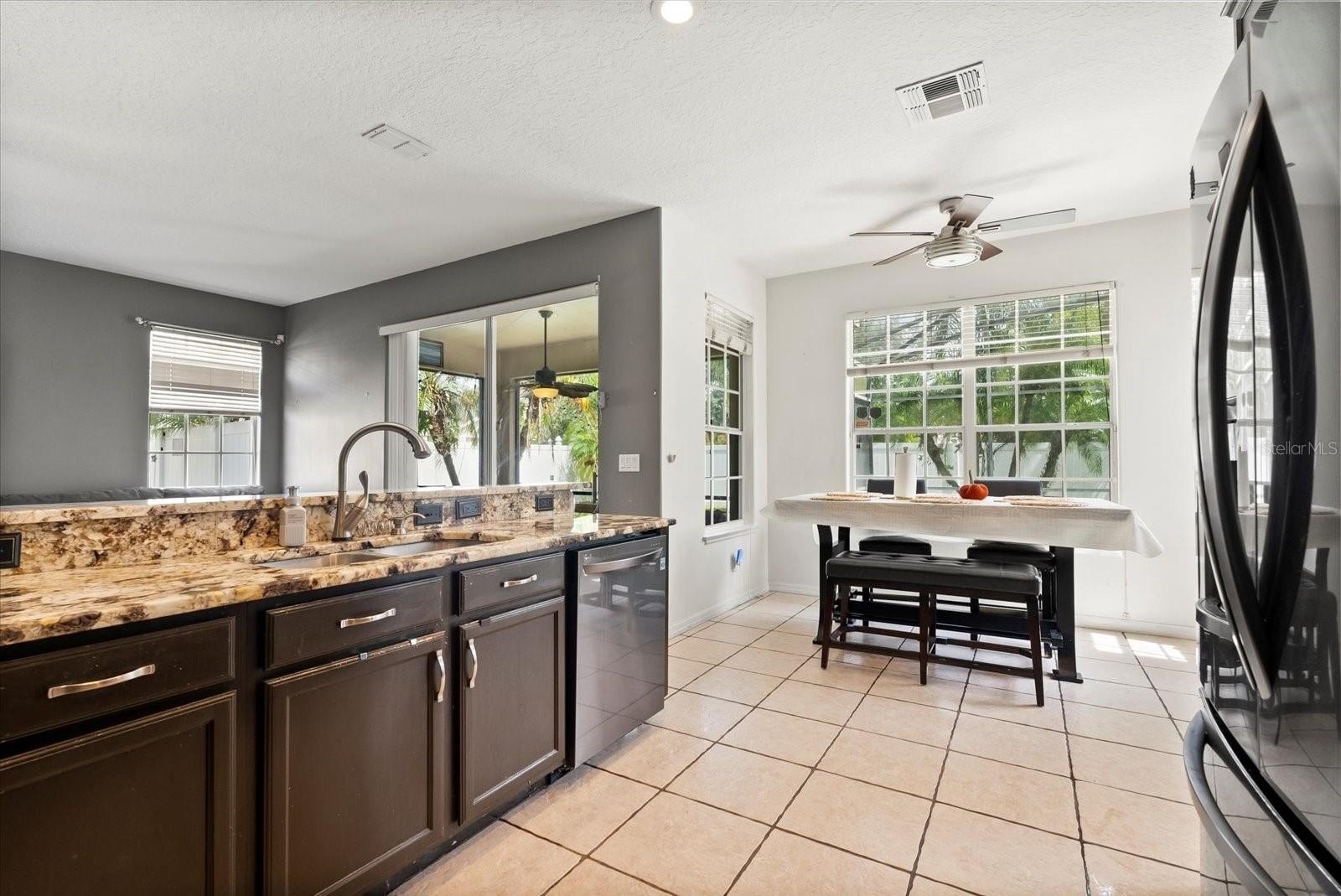 Step inside to discover an open floor plan with high ceilings and hard flooring throughout the main areas, while the bedrooms feature cozy carpeting. The kitchen is a real highlight with granite counters, stainless steel appliances, a stylish tiled backsplash, and plenty of cabinet space for all your storage needs.