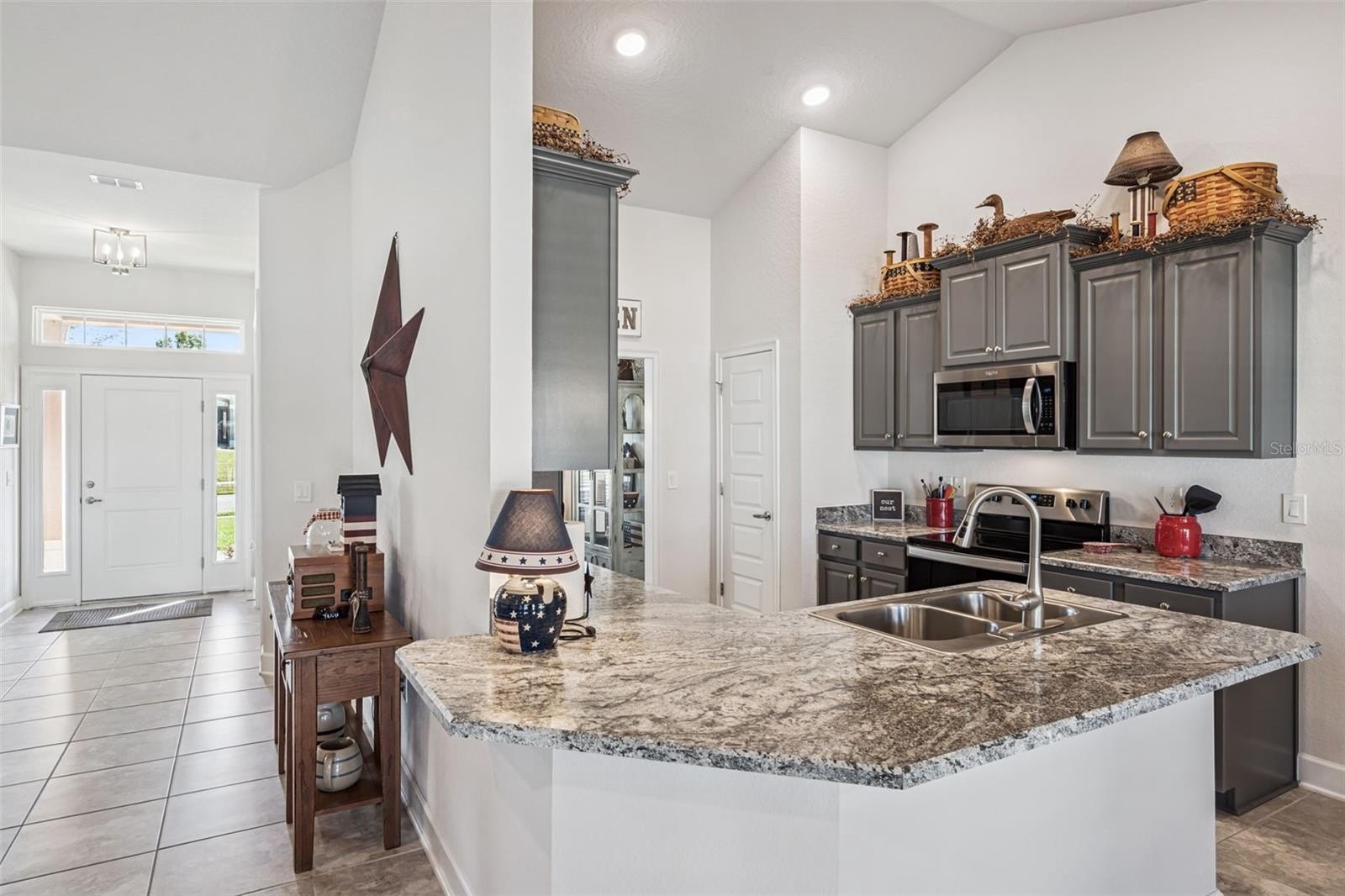 The well-equipped kitchen is a chef’s delight, offering gray cabinetry with crown molding trim, brushed nickel hardware, a stainless steel appliance package, and thoughtful design touches such as a closet pantry, recessed lighting, and a gooseneck faucet. A counter-height breakfast bar and breakfast nook provide casual dining options, while the formal dining room flows seamlessly into the kitchen—making entertaining effortless.