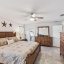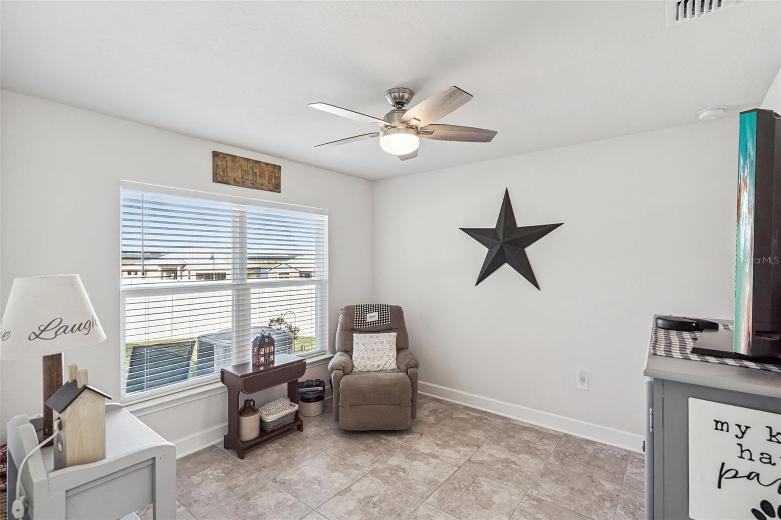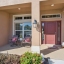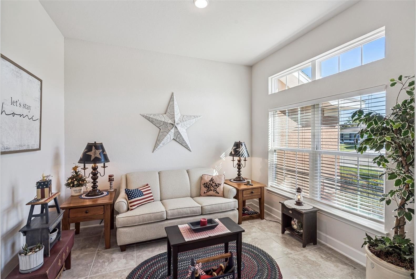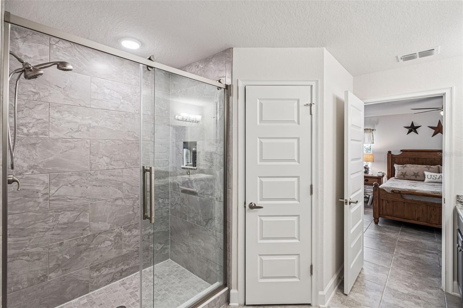 Low-maintenance tile flooring and high ceilings flow throughout the home, enhancing its spacious feel. The primary bedroom suite is a true retreat, featuring two walk-in closets and patio access through a glass door. The en-suite bathroom includes a comfort-height vanity with dual sinks, a linen closet, and a walk-in shower with a glass enclosure.
