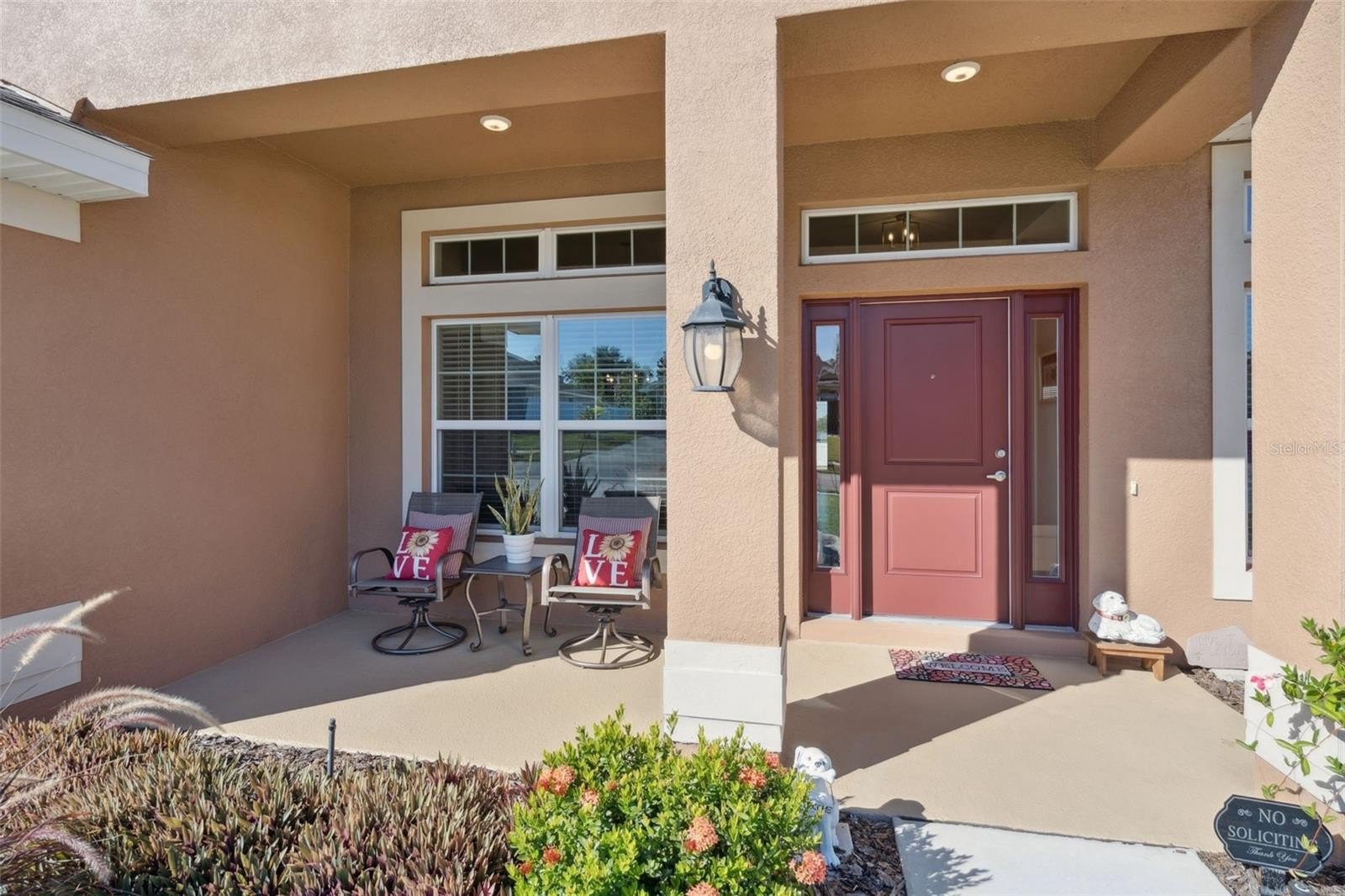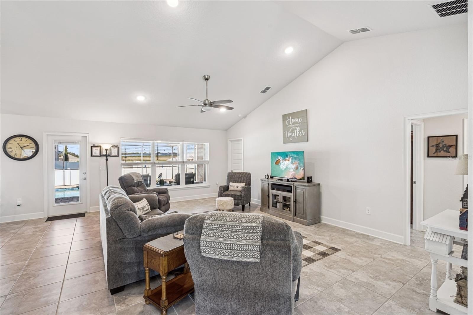 Step into the spacious foyer, where a transom window allows natural light to cascade into the space. Inside, the split-bedroom floor plan ensures privacy for the entire family, while the generously sized great room features vaulted ceilings and lovely views of the patio and pool area.